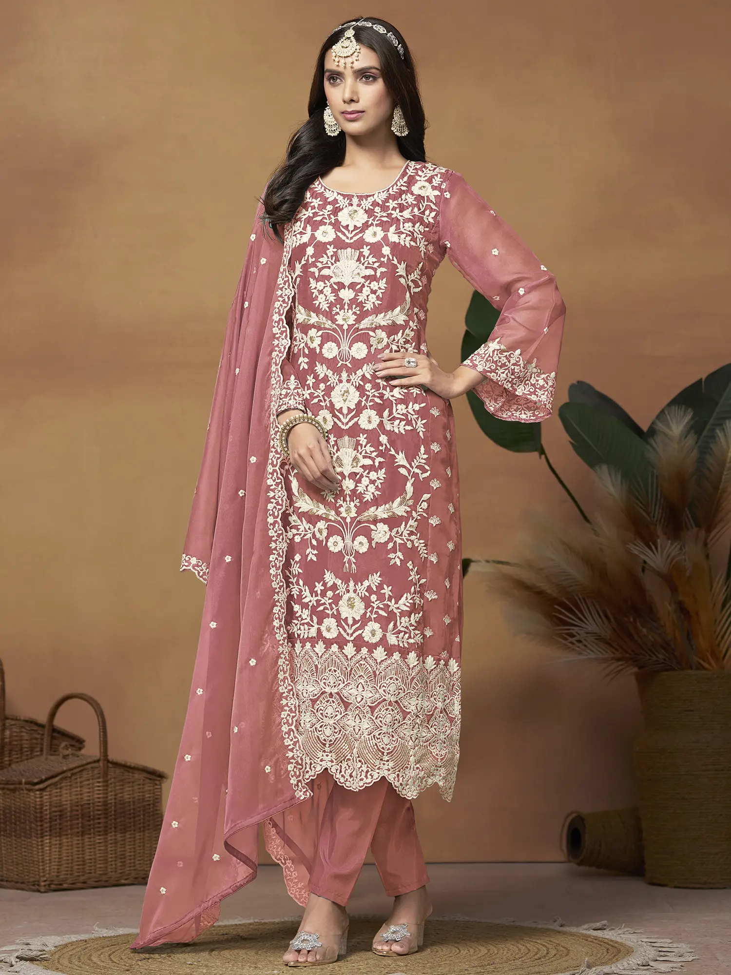 An elaborate bloom of embroidered flowers in this designer salwar suit set announces the arrival of festivity with graceful and stylish ease.