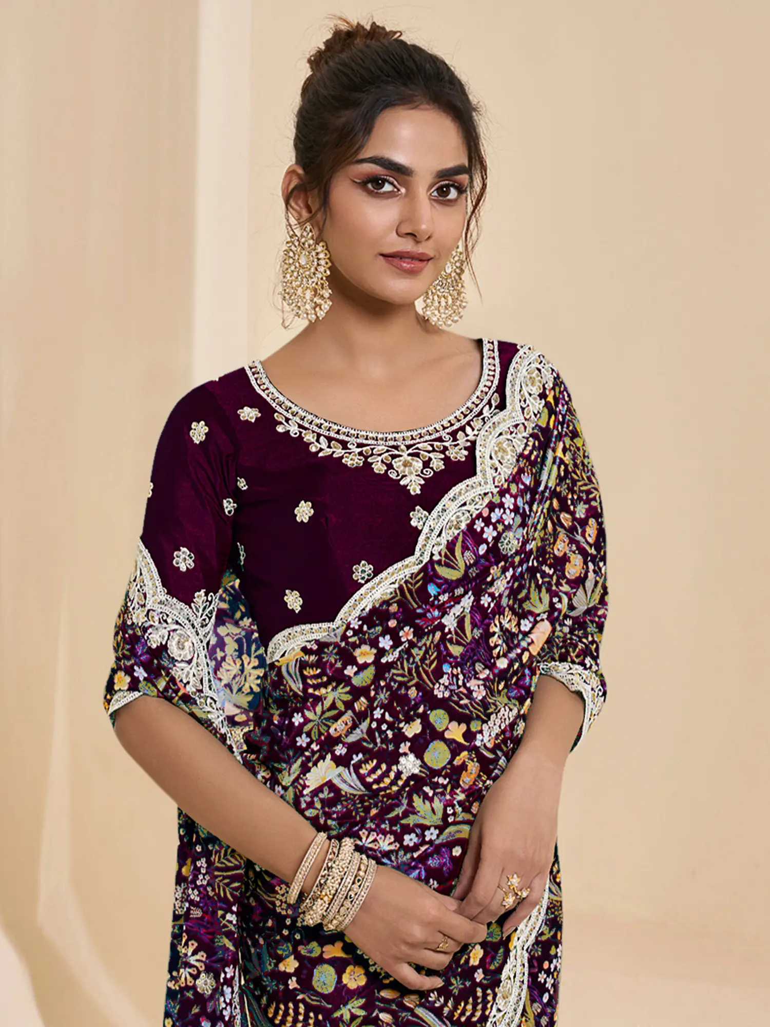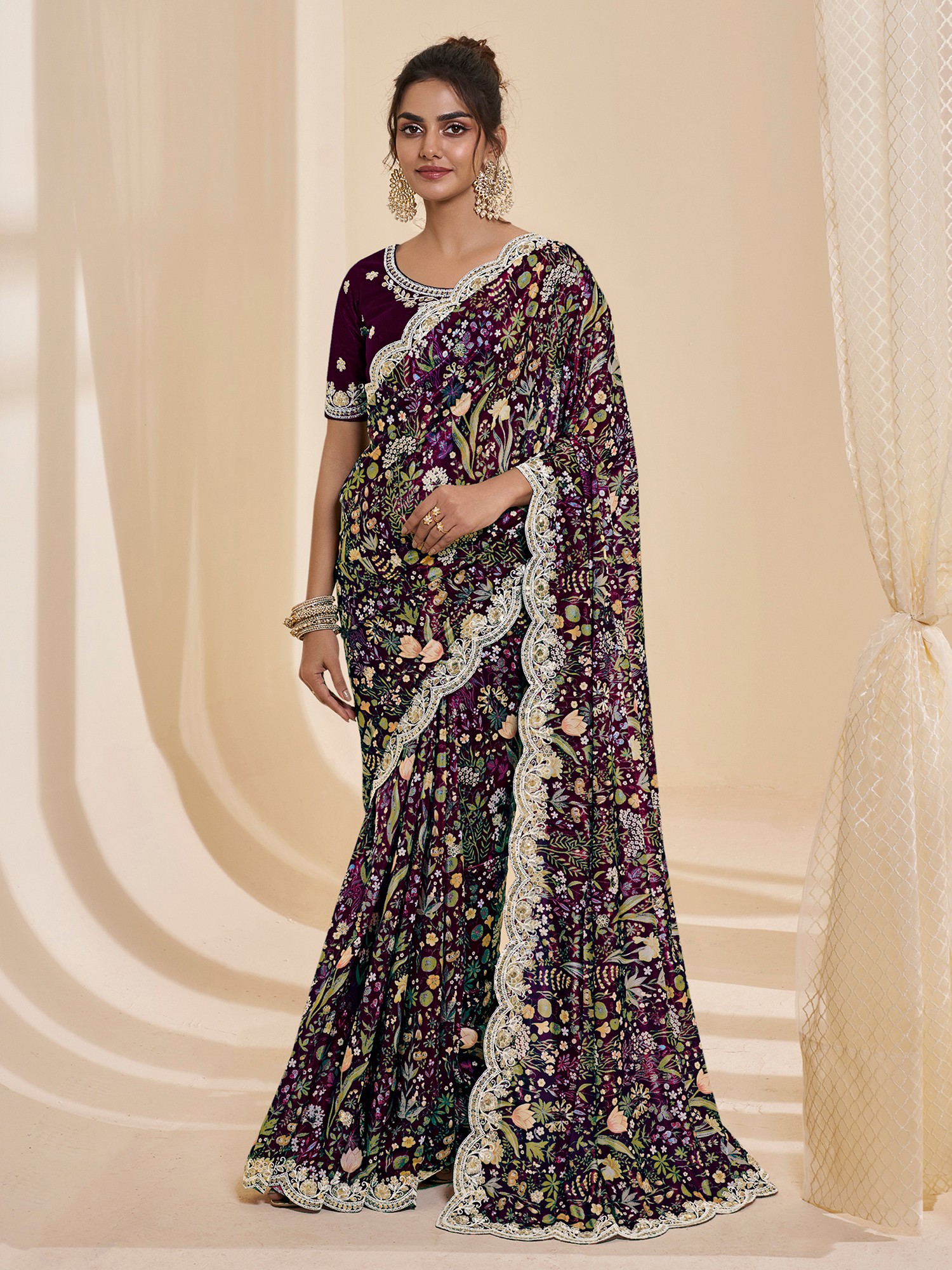 This saree is the ideal choice for parties, weddings, and other festive events. Its unique design and exquisite craftsmanship will ensure you stand out from the crowd. The combination of floral print and embroidery work creates a sophisticated and stylish look that is sure to impress. Pair it with your favorite jewelry and accessories to complete the ensemble and make a lasting impression.