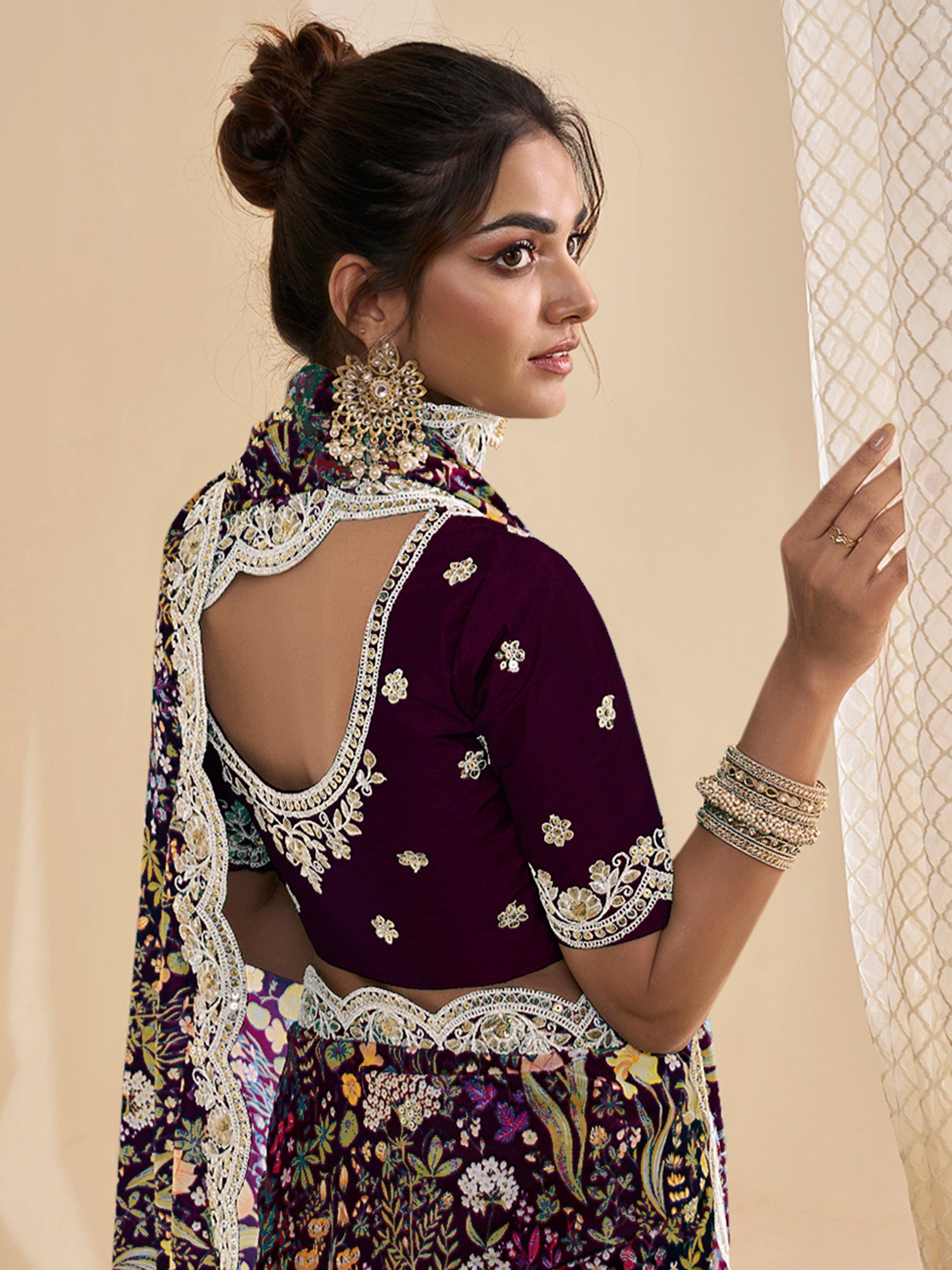 This stunning saree is a masterpiece of design, blending traditional elegance with contemporary flair. The saree features a captivating floral print that covers the entire fabric, creating a vibrant and eye-catching effect. Intricate embroidery work enhances the beauty of the saree, adding texture and dimension to the overall design. The detailed border further elevates the saree's appeal, showcasing meticulous craftsmanship and attention to detail. The rich color palette complements the floral design, making it a perfect choice for special occasions.