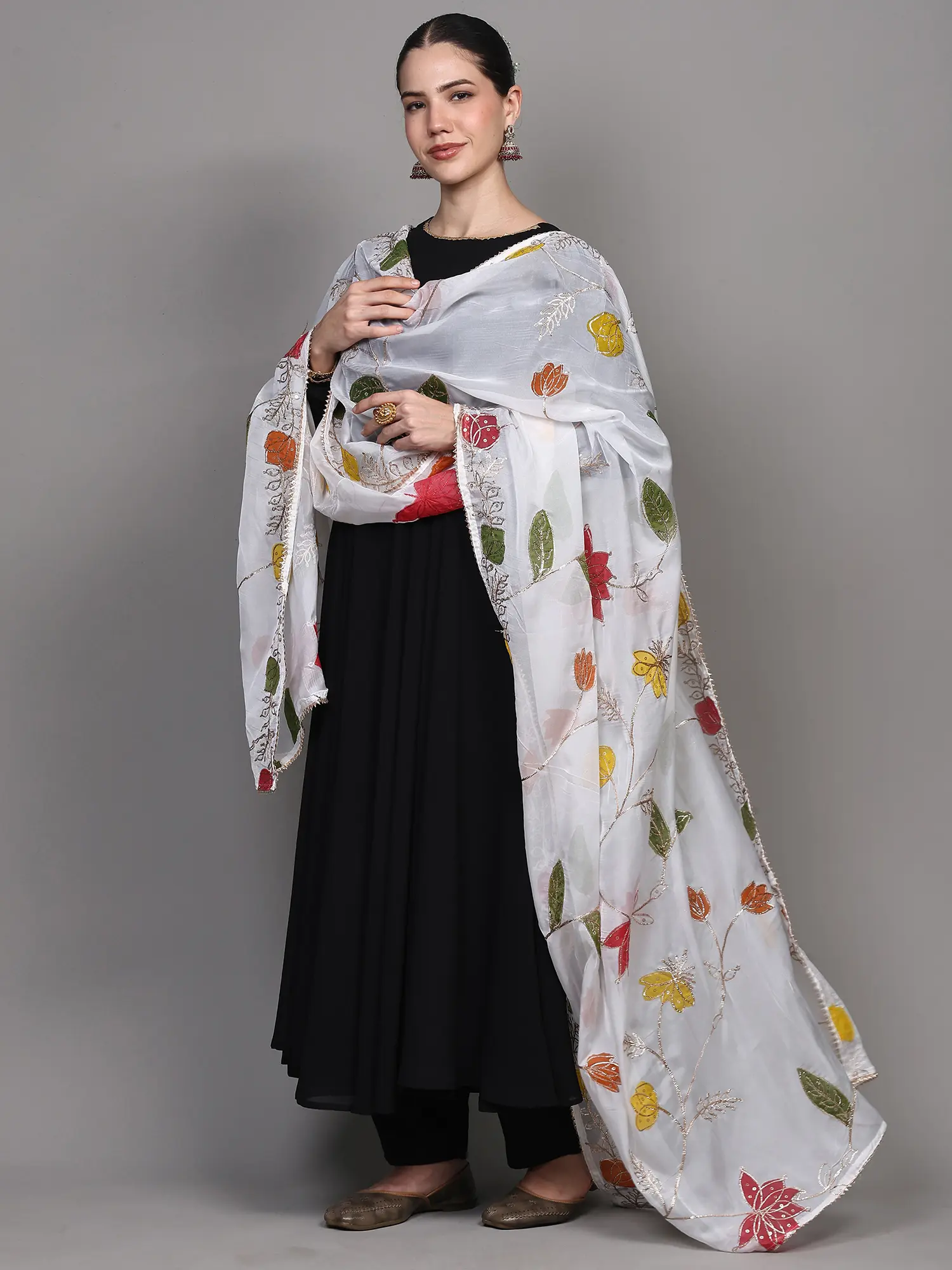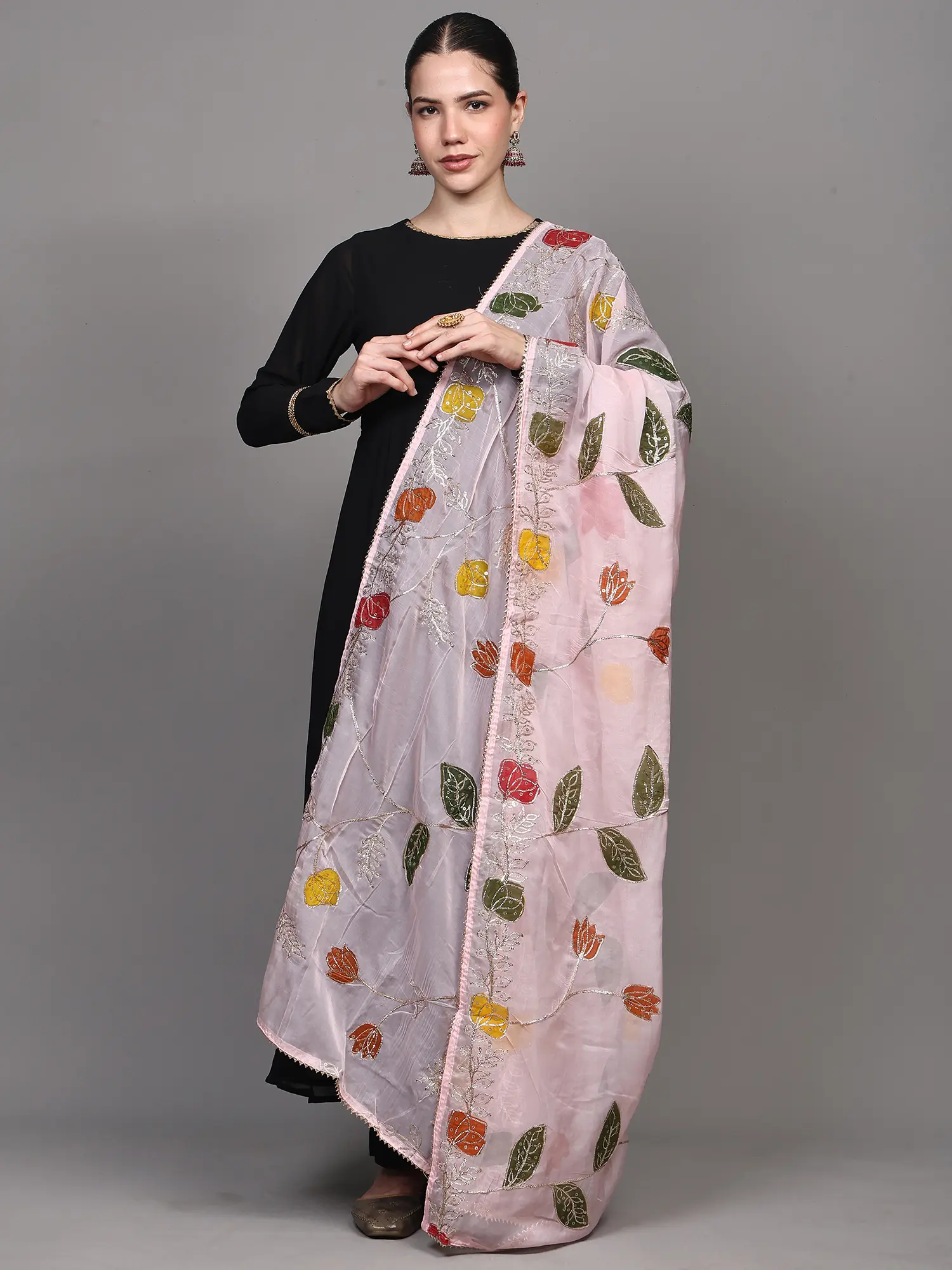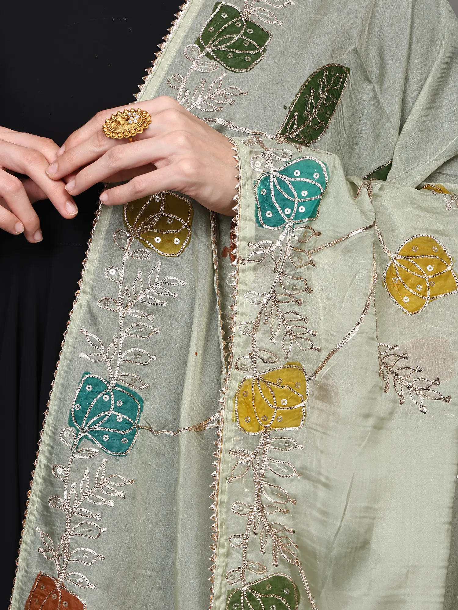 The artistry of this dupatta lies in its meticulous embellishments. Gota Patti work, a traditional Indian embroidery technique using finely cut pieces of gold or silver ribbon, is expertly applied to outline the delicate veins of the leaves and the graceful curves of the floral patterns. This traditional craft is further enhanced by the subtle shimmer of carefully placed sequins, catching the light and adding a captivating sparkle. The border is a masterpiece in itself, featuring a beautifully intricate vine of silver threadwork interspersed with tiny, shimmering beads, creating a refined and eye-catching frame. This thoughtful detailing elevates the dupatta from a simple accessory to a wearable piece of art. ––––––––––