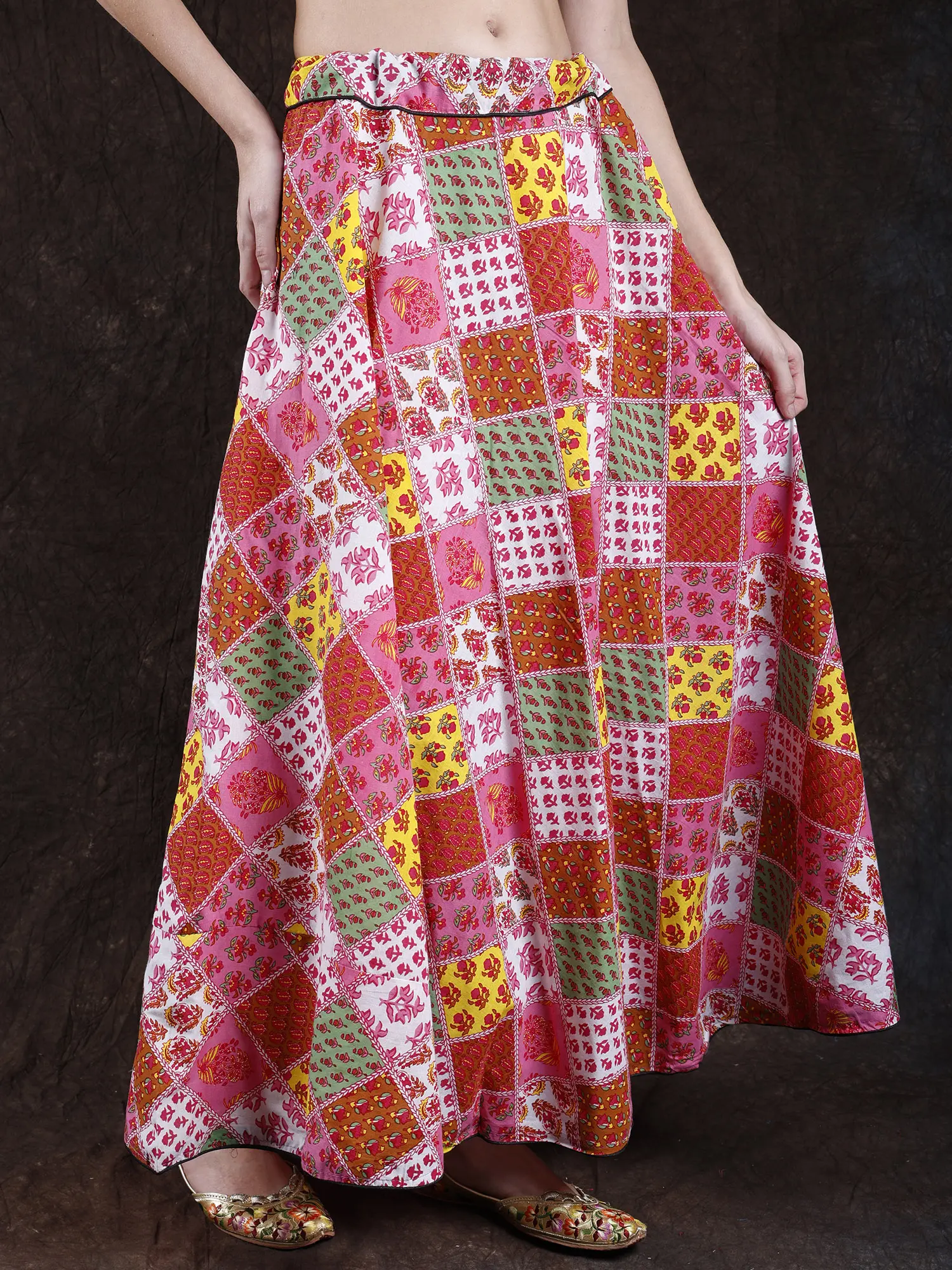 Comfort and artistry come together beautifully in this long patchwork skirt, which is adorned with piping and floral print. This skirt is made entirely of cotton and has a beautiful patchwork design combined with colourful flowers to create a visually stunning symphony. The delicate piping pattern adds an air of refinement, making it more charming. This skirt is appropriate for both formal and casual occasions since it is so unique and free-spirited. This multi-purpose accessory will let you show off your own sense of style from day to night.