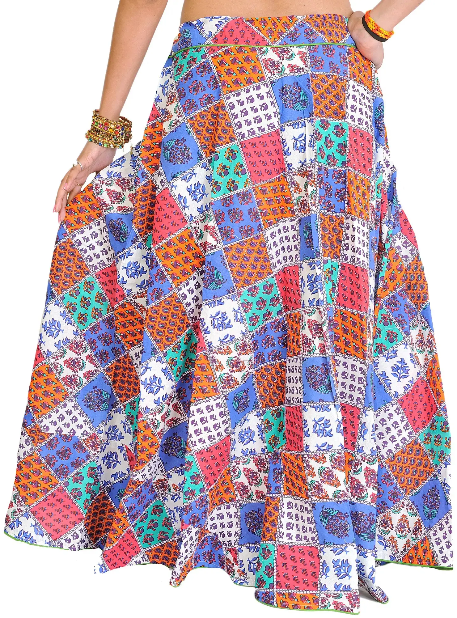 Comfort and artistry come together beautifully in this long patchwork skirt, which is adorned with piping and floral print. This skirt is made entirely of cotton and has a beautiful patchwork design combined with colourful flowers to create a visually stunning symphony. The delicate piping pattern adds an air of refinement, making it more charming. This skirt is appropriate for both formal and casual occasions since it is so unique and free-spirited. This multi-purpose accessory will let you show off your own sense of style from day to night.