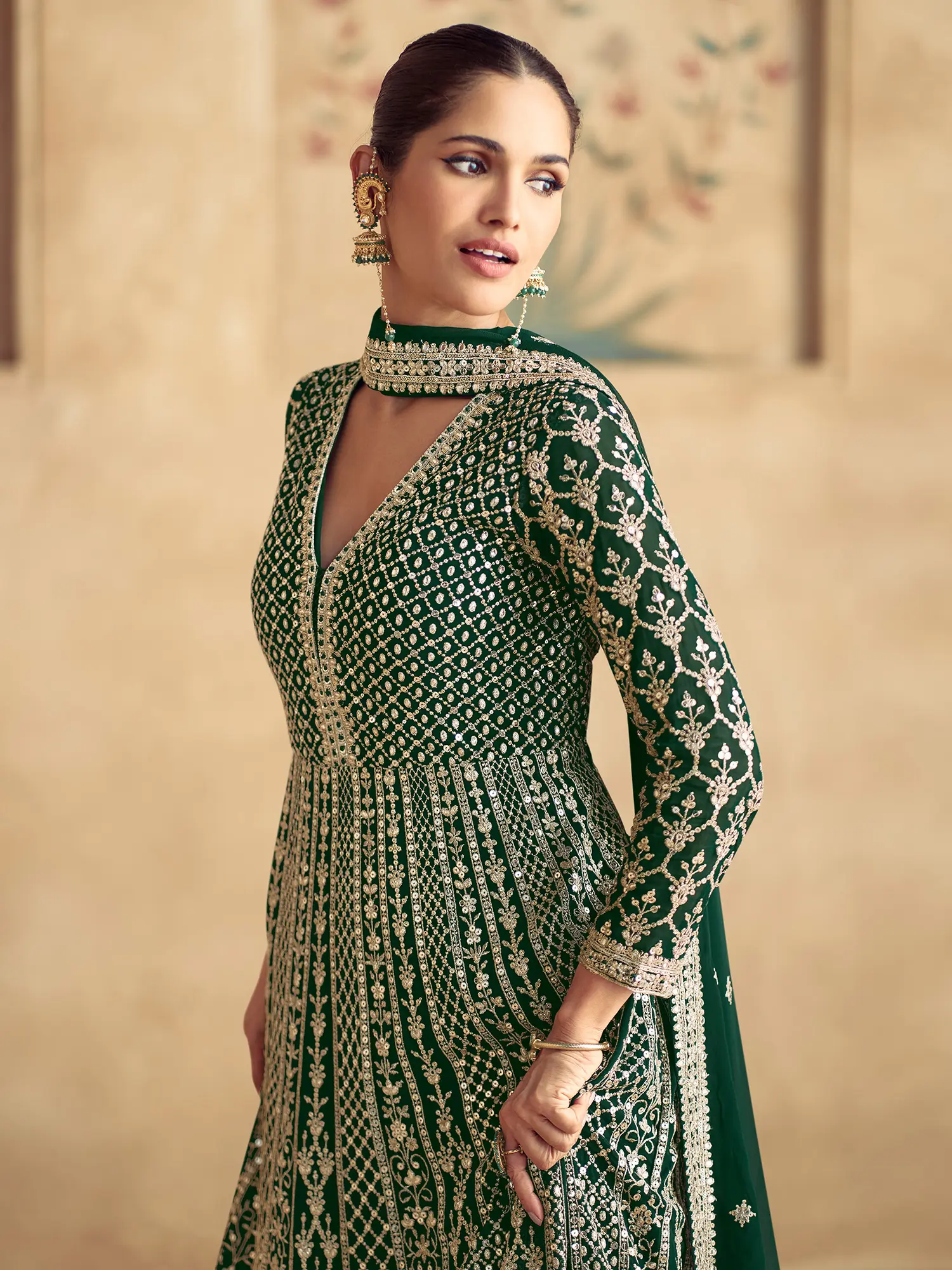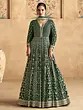 Turquoise-Green Floral Print Heavy Rayon Elegant Flared Gown For Festive Occasion