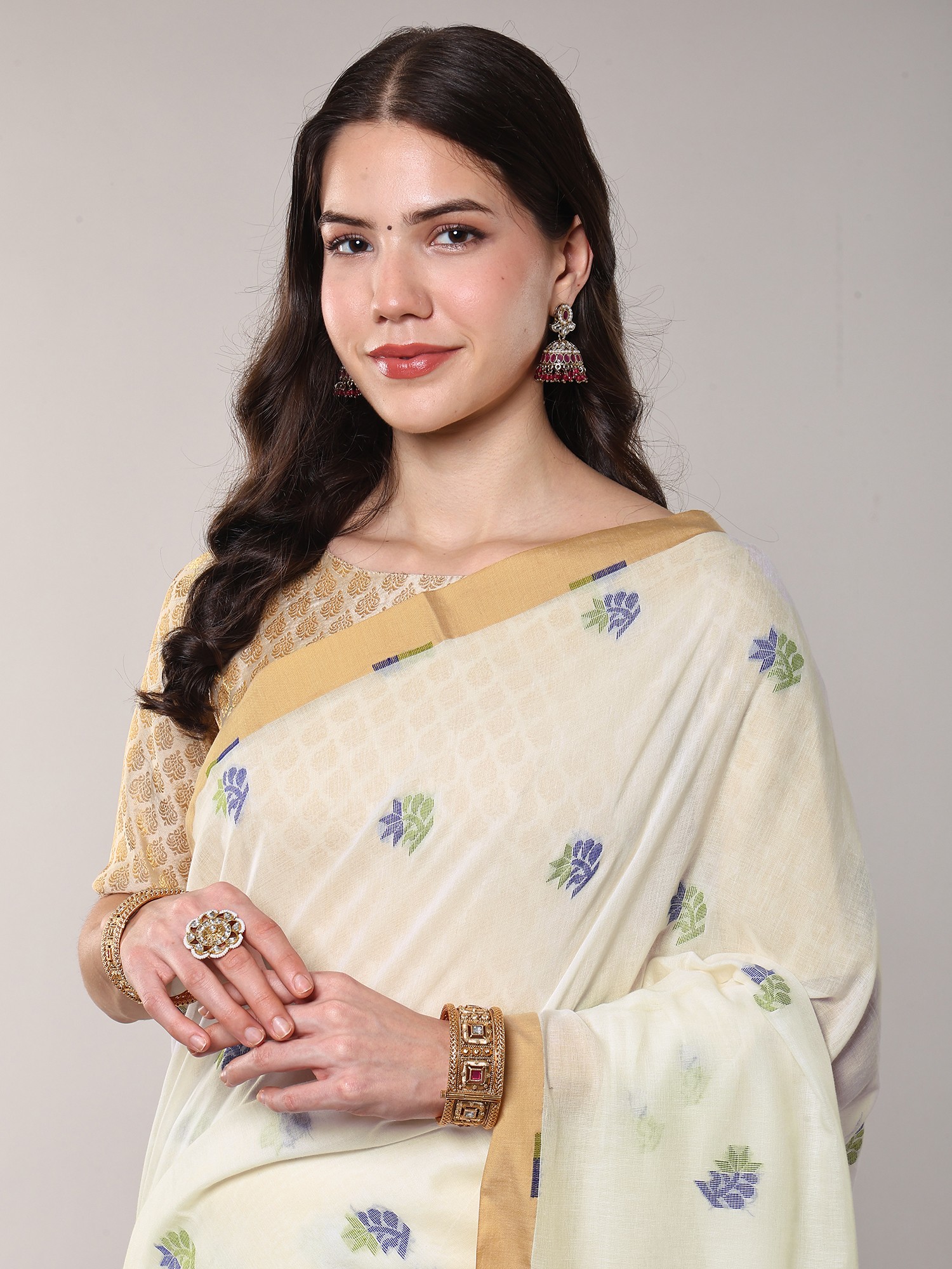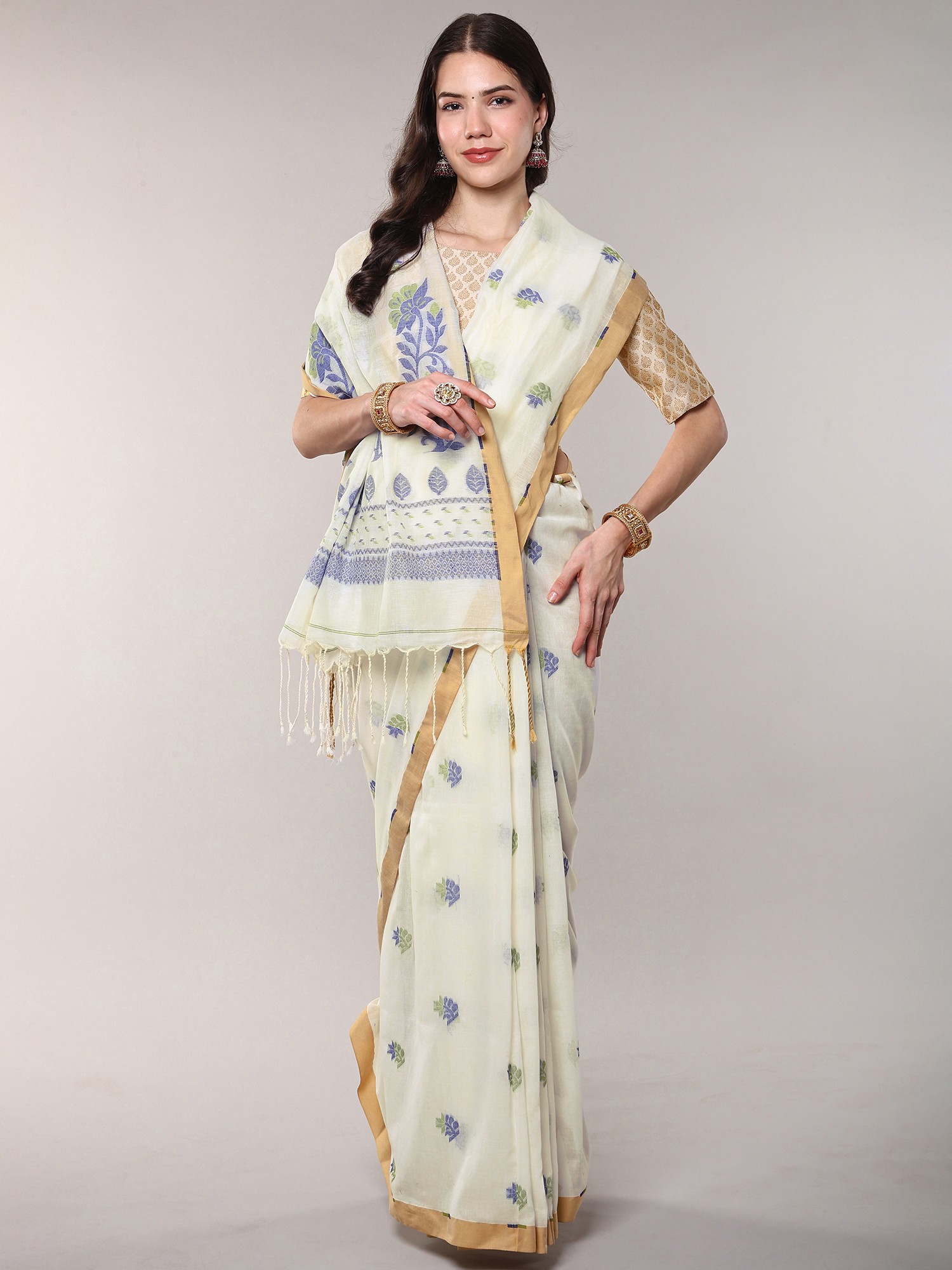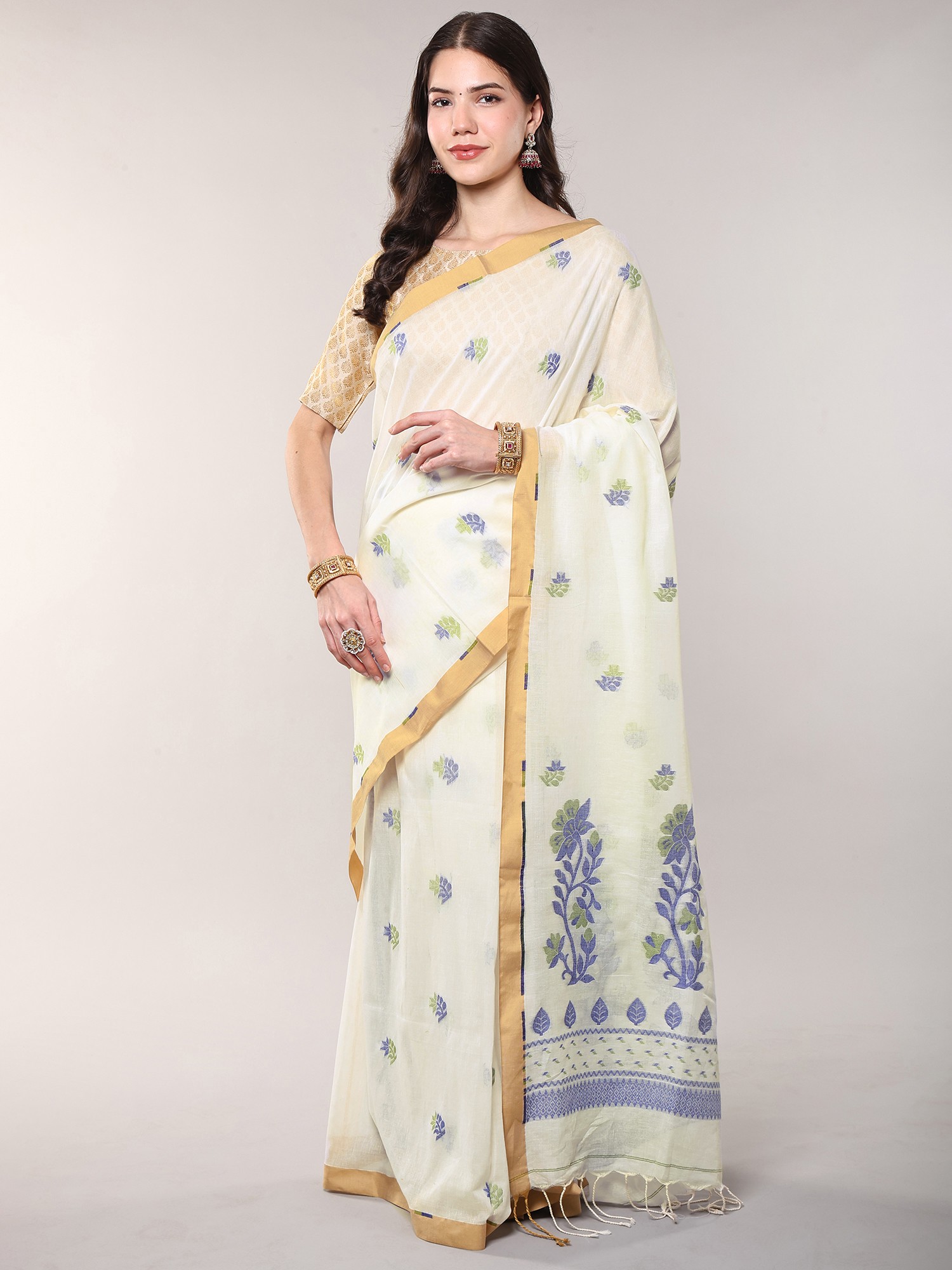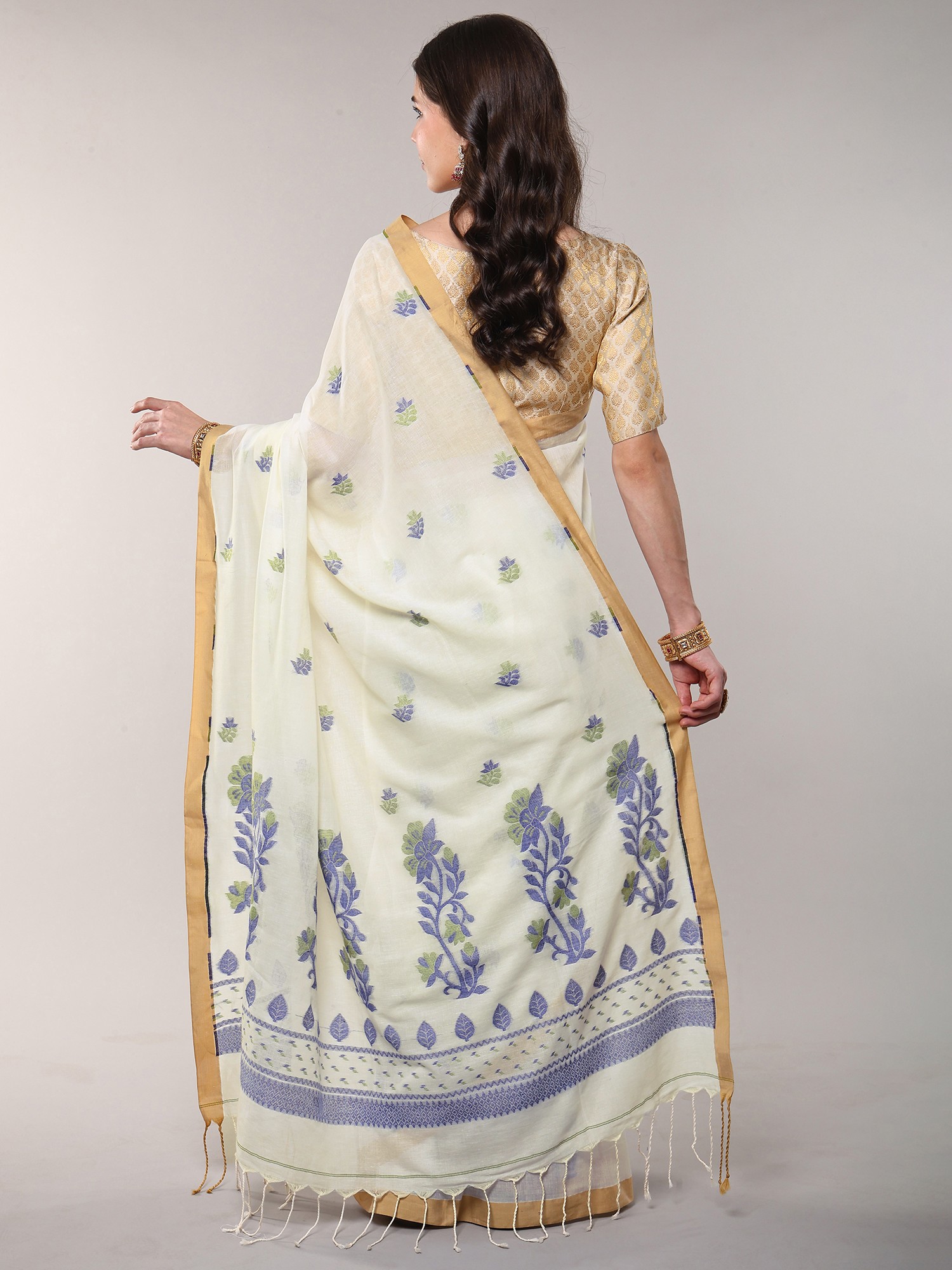 Floral Woven Cotton Saree with Contrast Border from Bengal