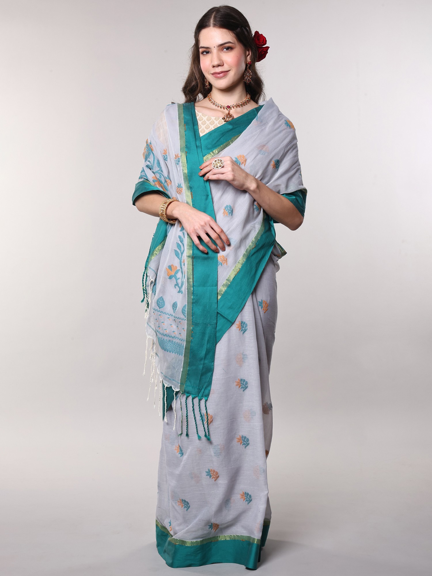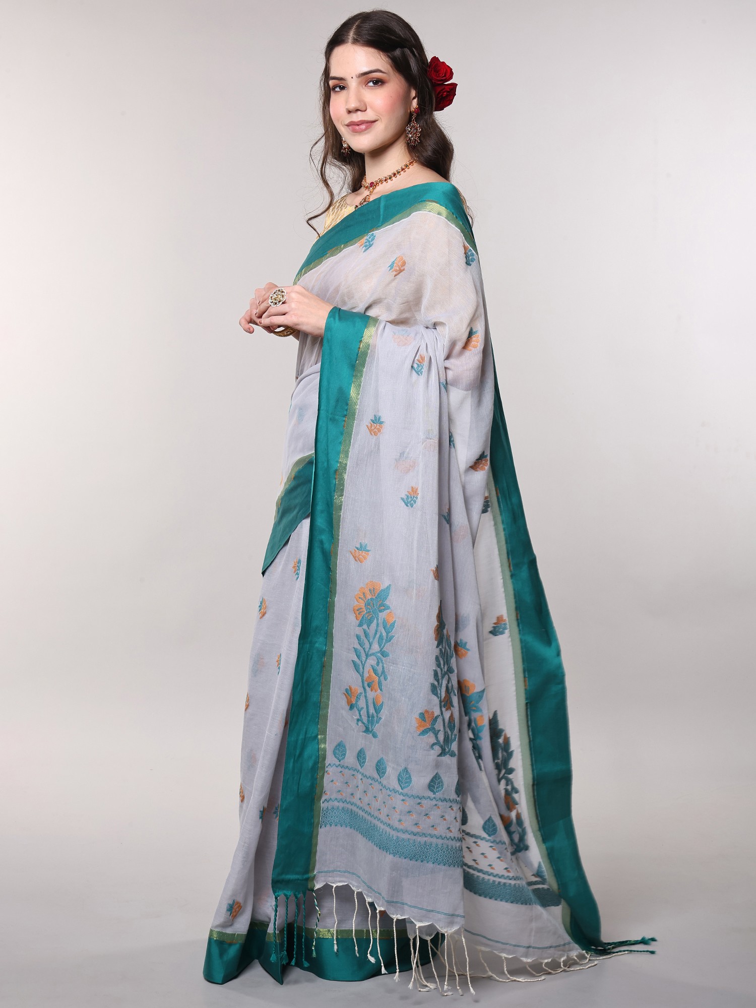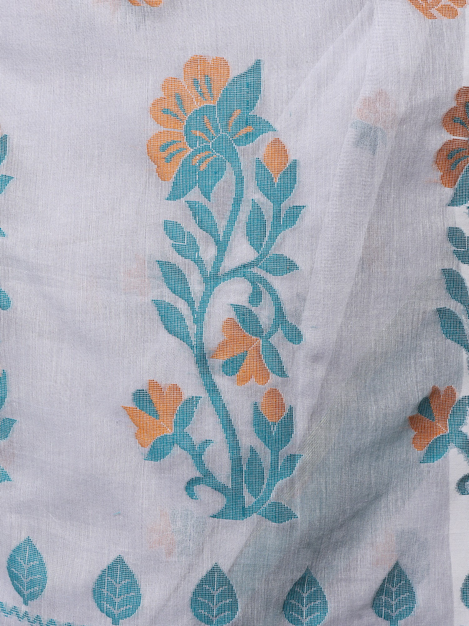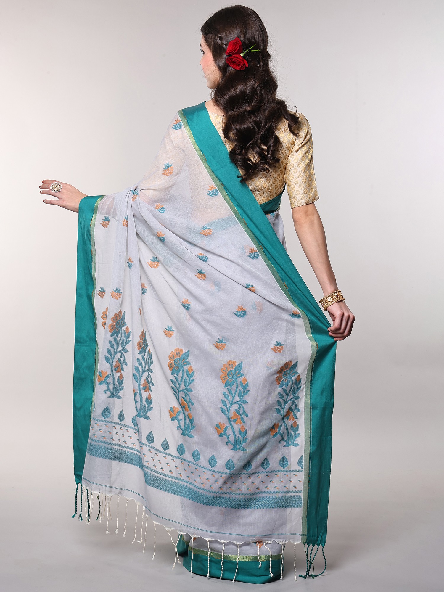 Jamdani Handloom Pure Cotton Saree with Woven Multicolor Floral Bootis and Paisley from Bengal