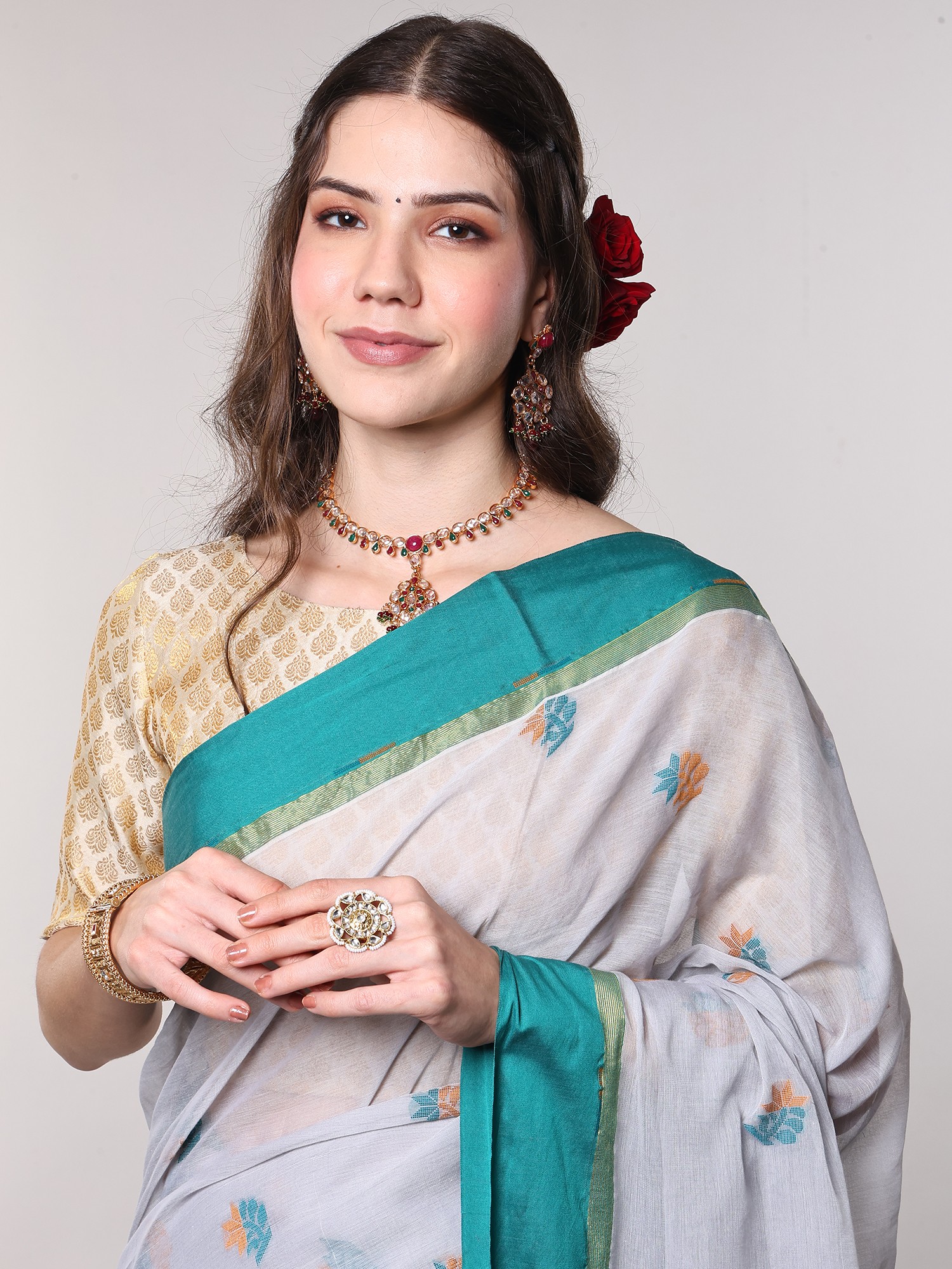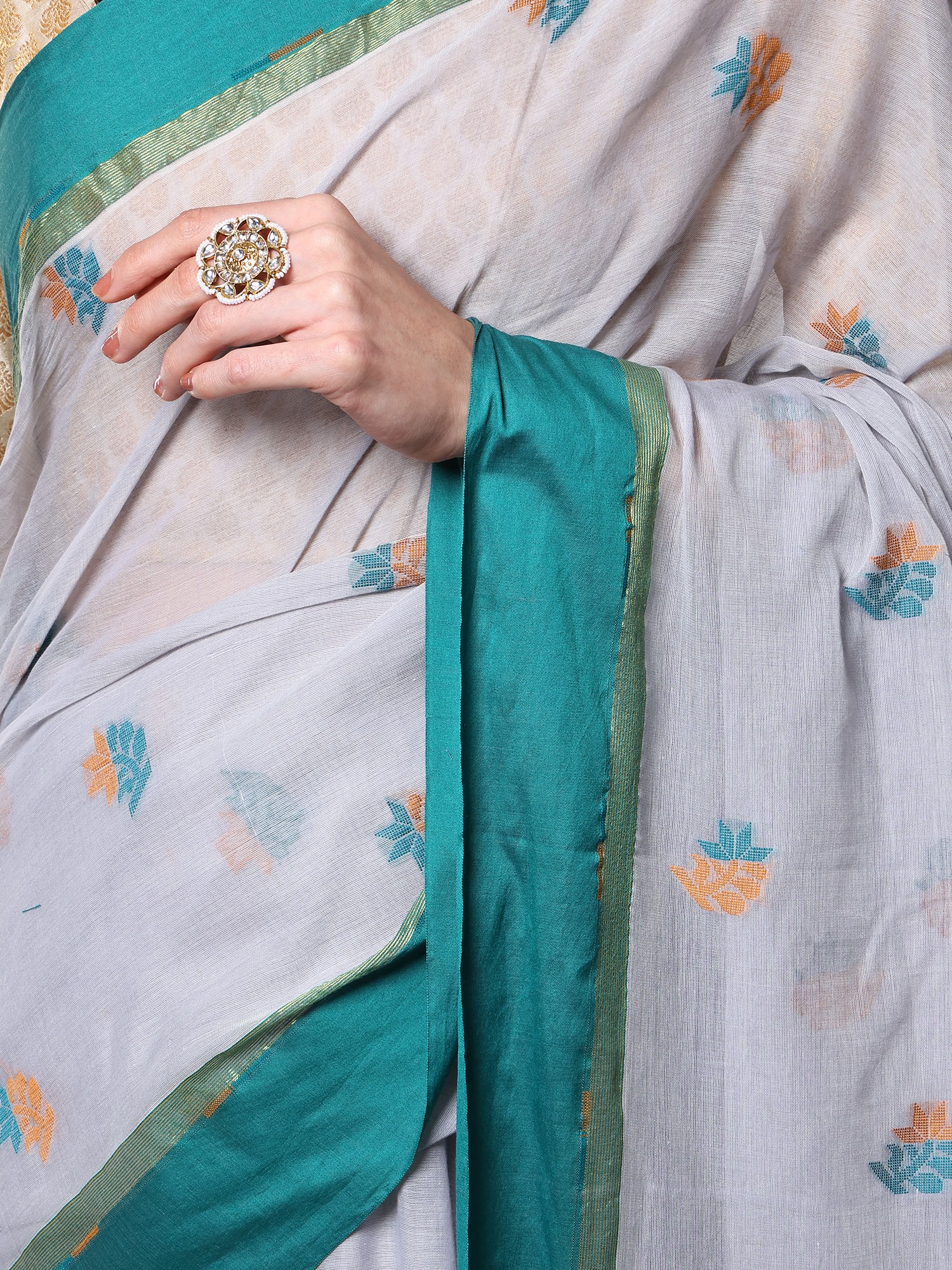 Discover the timeless elegance of Bengal woven into this exquisite cotton saree. Crafted with meticulous attention to detail, this saree is a testament to the rich heritage of Indian textiles. The delicate floral motifs, scattered across a serene grey canvas, evoke the beauty of nature, while the contrasting zari stripe border adds a touch of regal grandeur. This is more than just a garment; it's a piece of art that whispers tales of tradition and artistry.