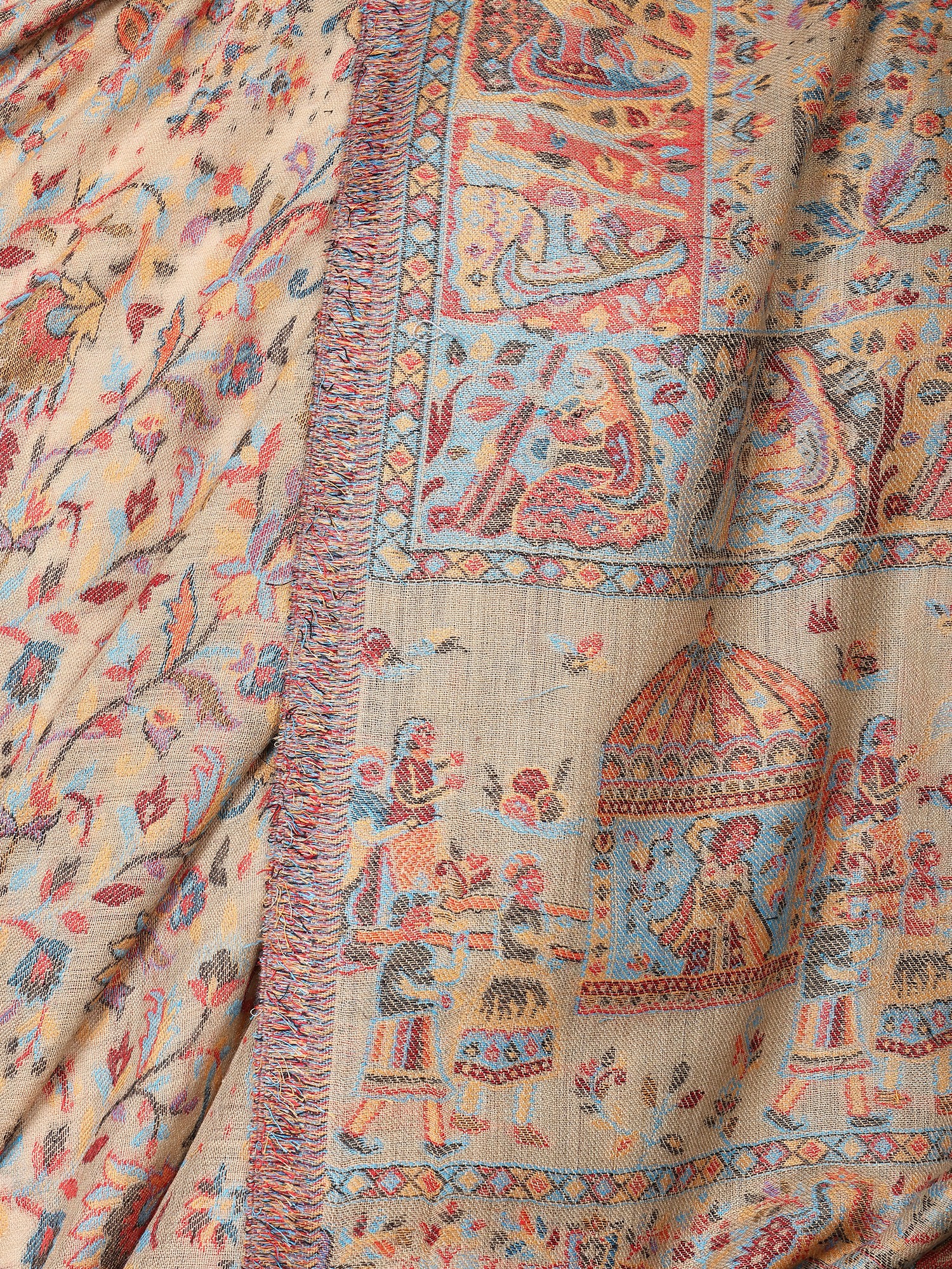 The true marvel of this shawl lies in its breathtaking border, a vibrant "Procession of Kings" motif. This captivating design depicts a regal parade, alive with meticulously rendered figures, elephants, and ornate architectural elements. Each scene is a miniature narrative, woven with precision and a keen eye for detail, evoking a sense of grandeur and historical richness. The vibrant threads used in the border are a striking contrast to the subtle, earthy tones of the main body of the shawl, creating a dynamic visual interplay that draws the eye and sparks the imagination. The intricate floral patterns that delicately adorn the central expanse of the shawl provide a softer, yet equally captivating, counterpoint to the bold narrative border, creating a harmonious and sophisticated overall aesthetic. ––––––––––