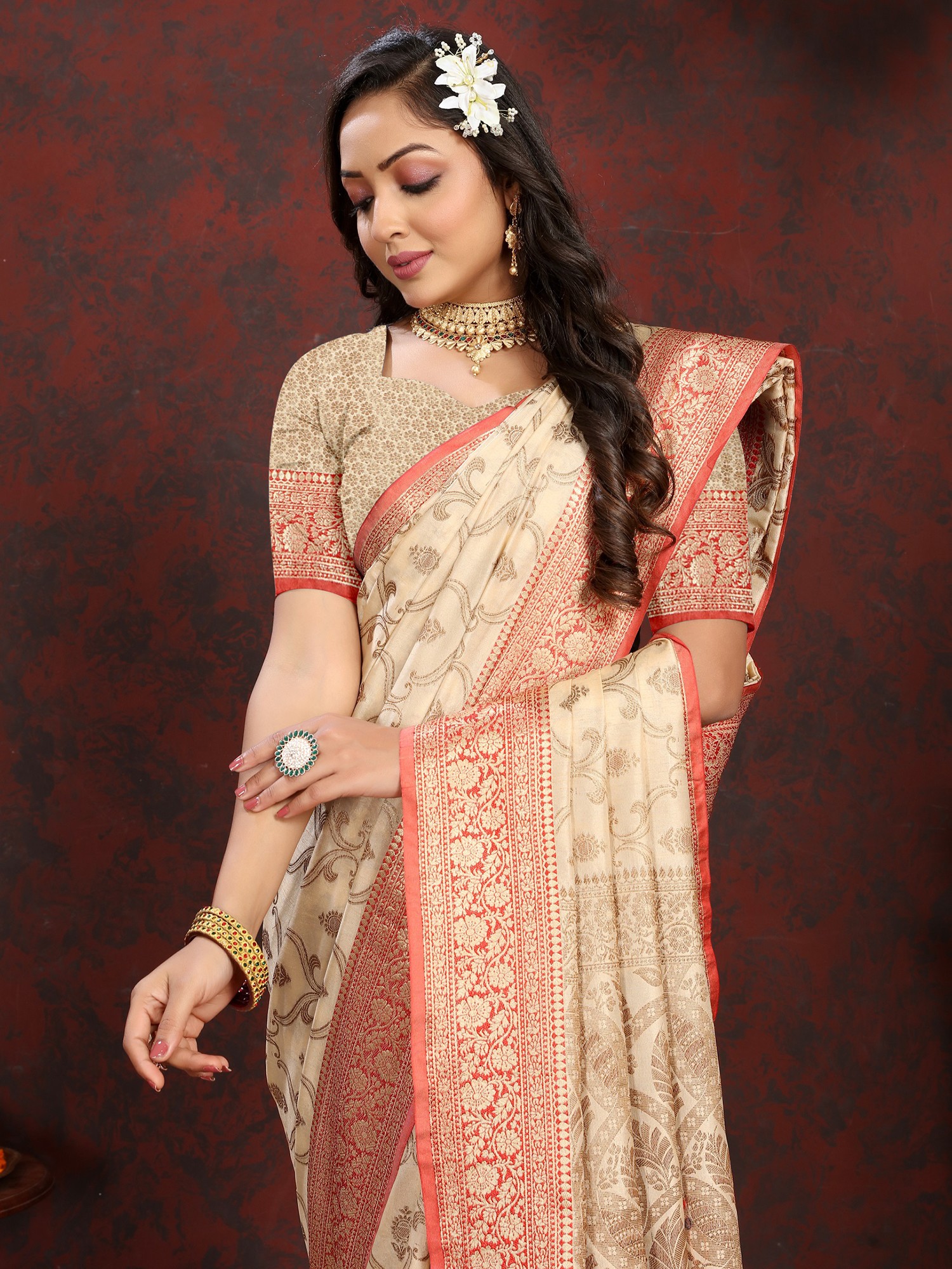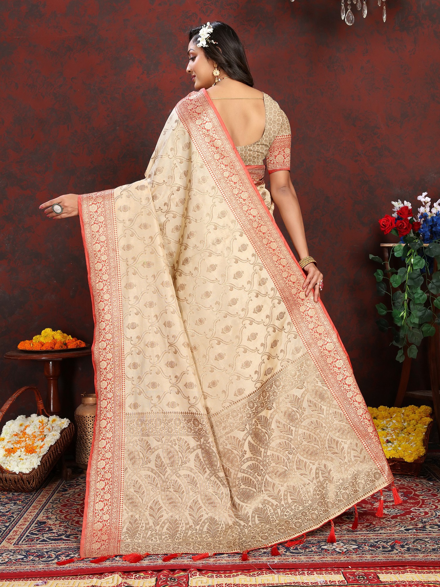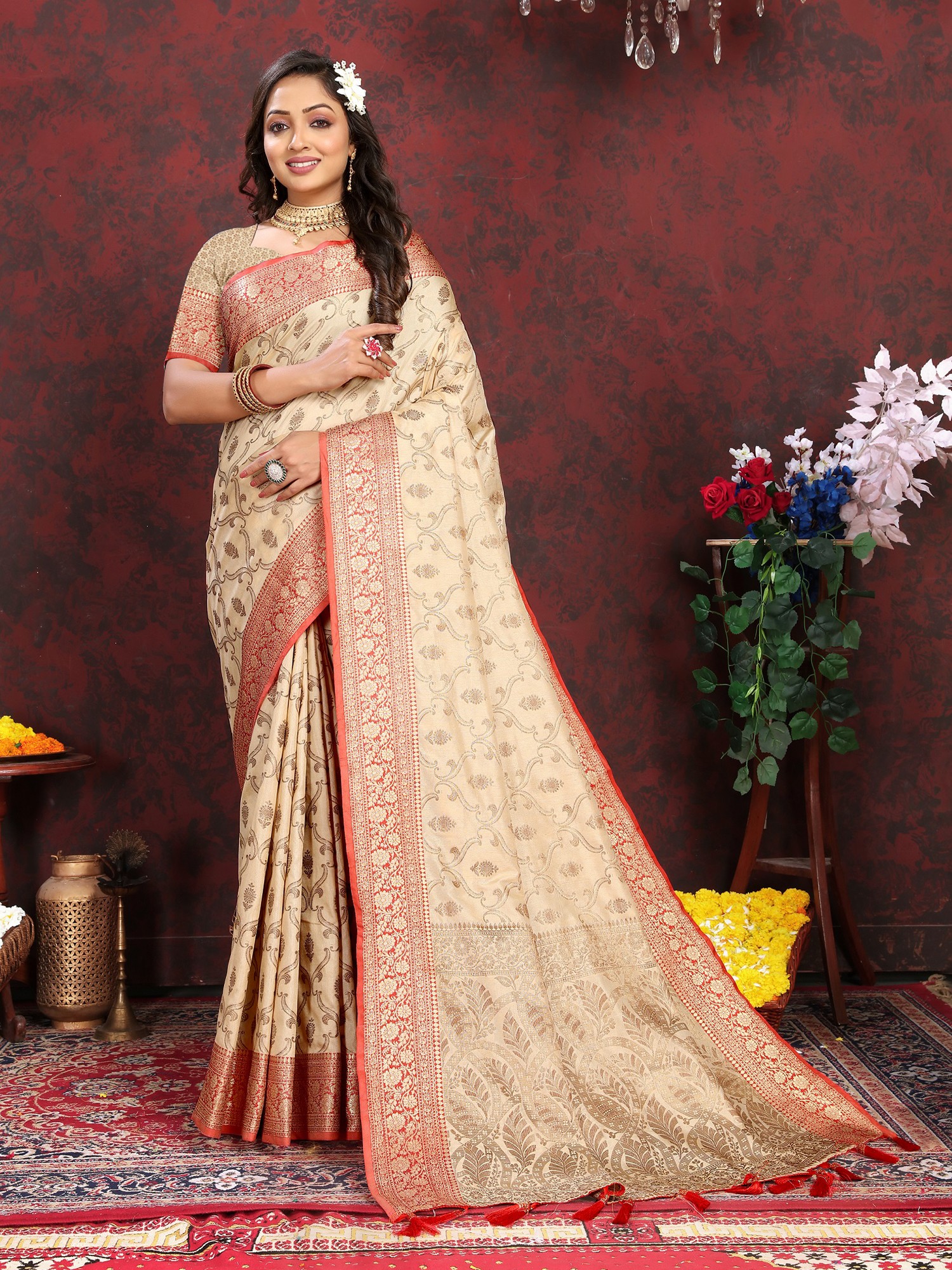 Banarasi Saree with All-over Zari Woven Bootis and Floral Vine Contrast Border-Pallu