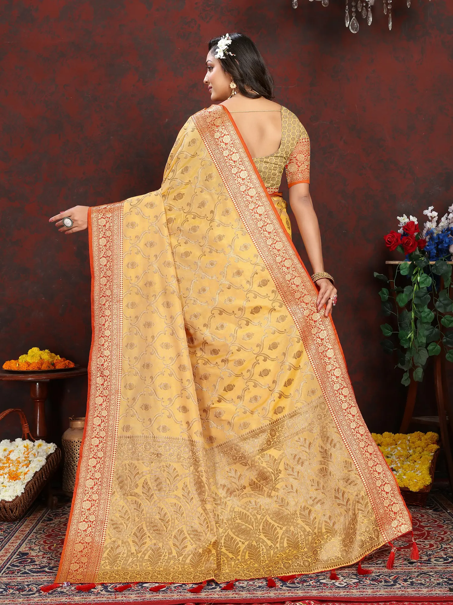 Golden-Rod Pure Silk Banarasi Saree with Woven Meenakari Floral Motifs