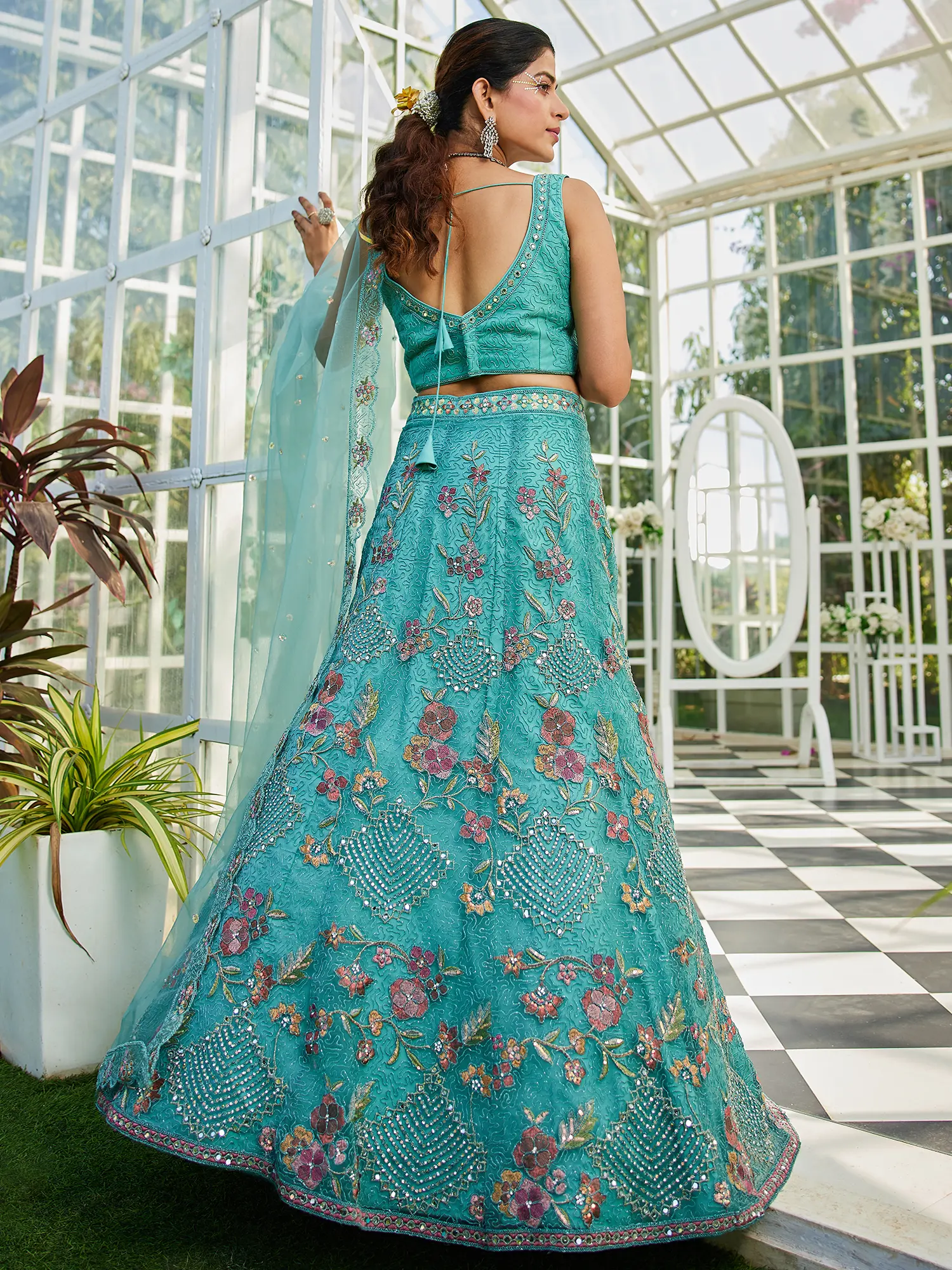 Teal Taffeta Silk Beautiful Floral Zari Embroidery Lehenga Choli with Beige Sheer Dupatta