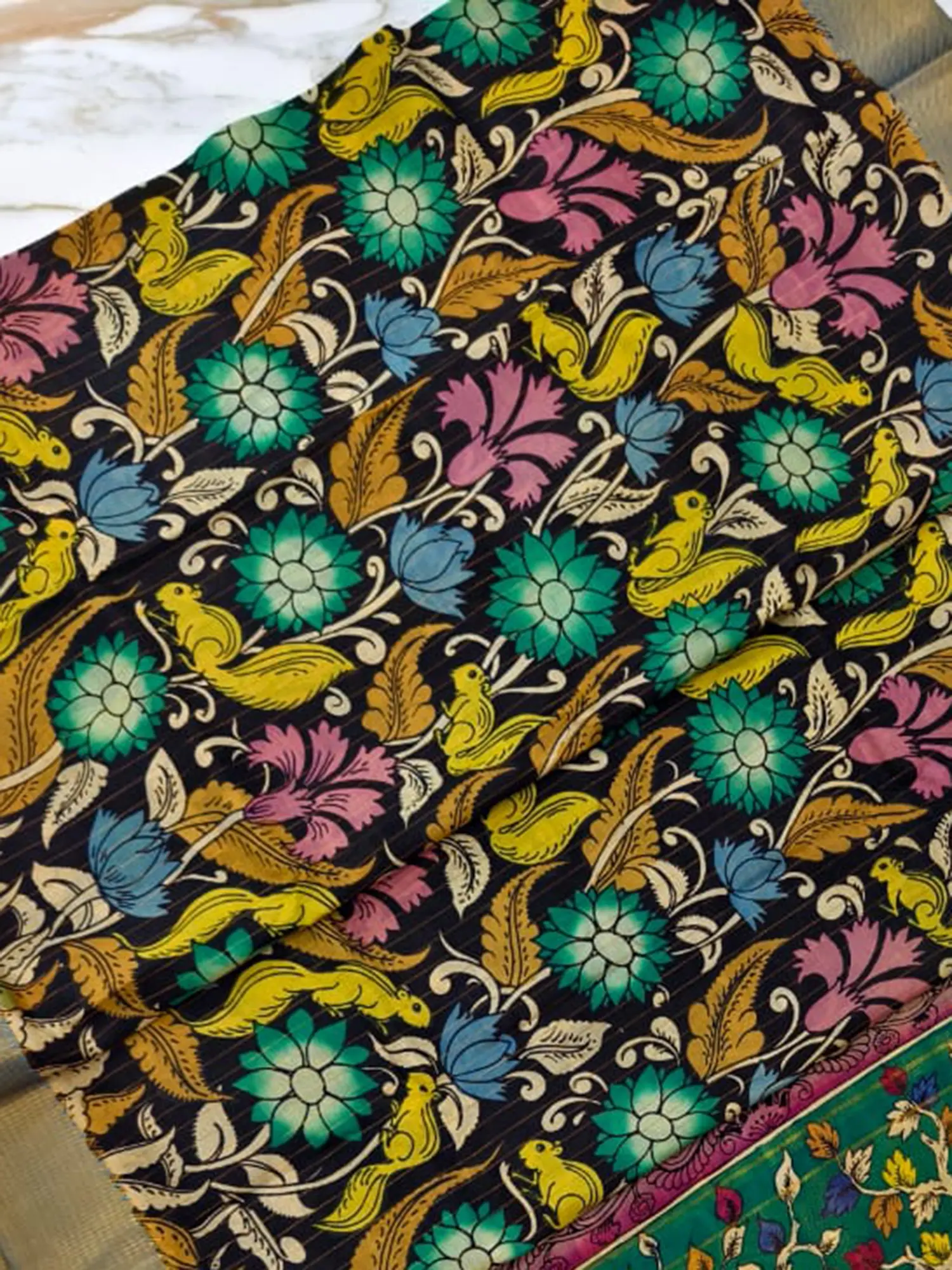 The body of the saree is a symphony of floral and leafy motifs, rendered in a rich palette of colors against a deep, captivating black backdrop. Delicate flowers bloom in shades of teal, pink, and blue, interspersed with elegantly curved leaves in earthy tones of brown and yellow. Playful birds, perched amongst the foliage, add a touch of whimsical charm to the overall design. The hand-painted nature of these motifs ensures that each saree possesses its own unique character, a subtle variation that makes it truly one-of-a-kind. ––––––––––––––––––
