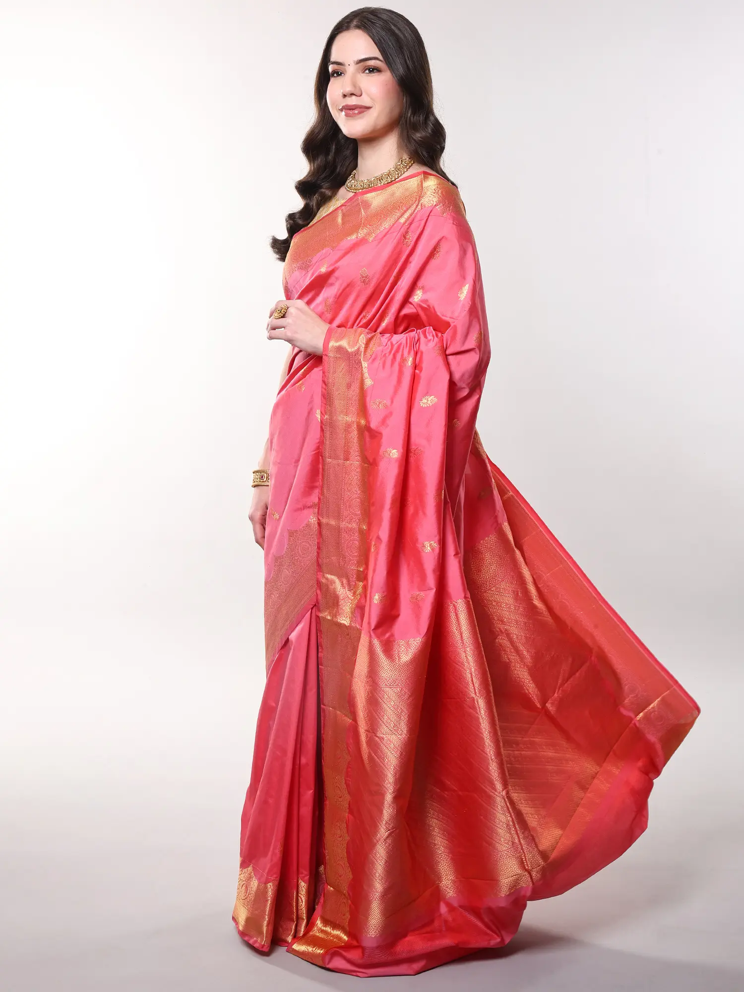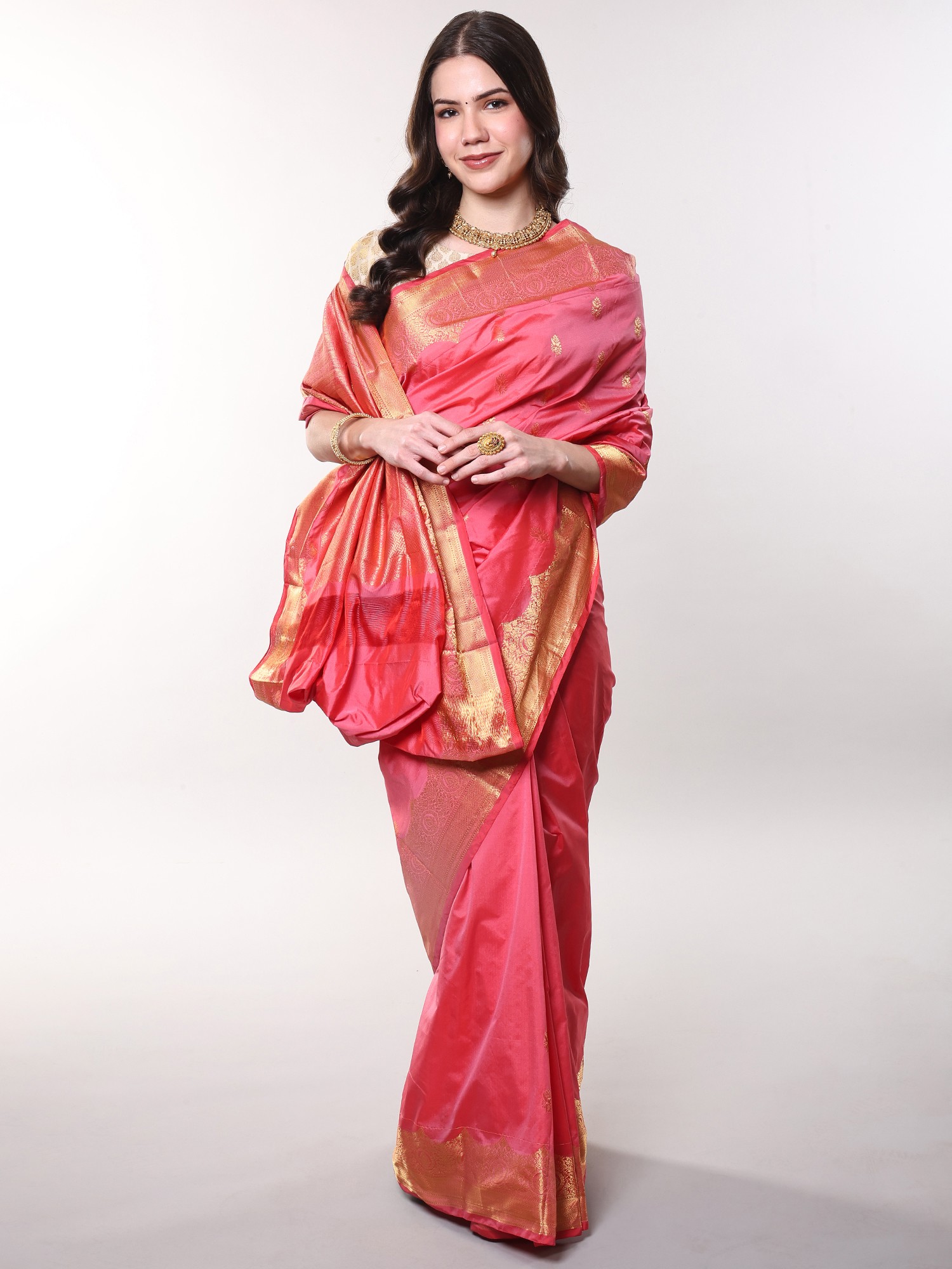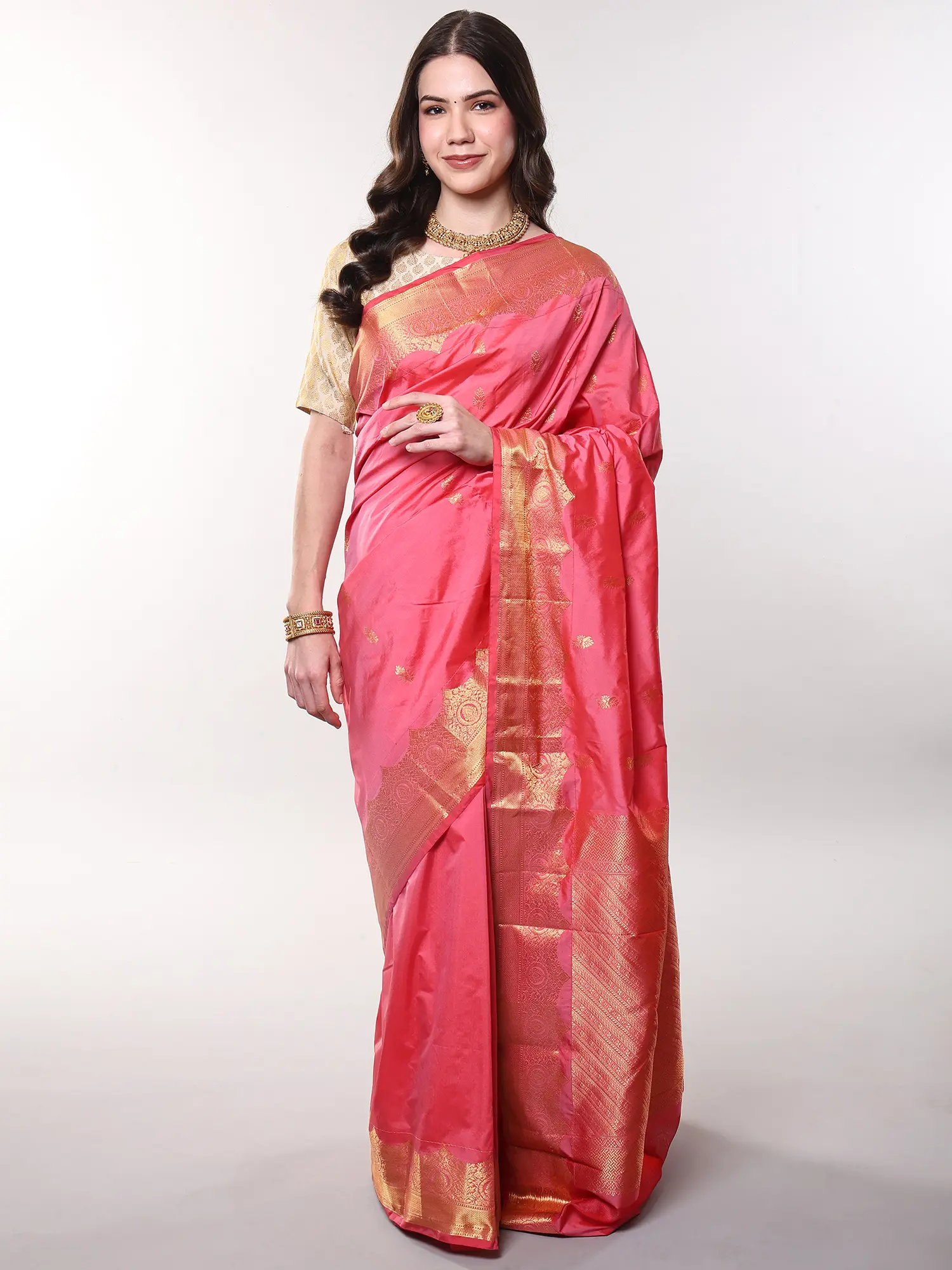Phlox-Pink Birds and Animals Woven Pure Silk Saree from Bangalore with Zari work Border