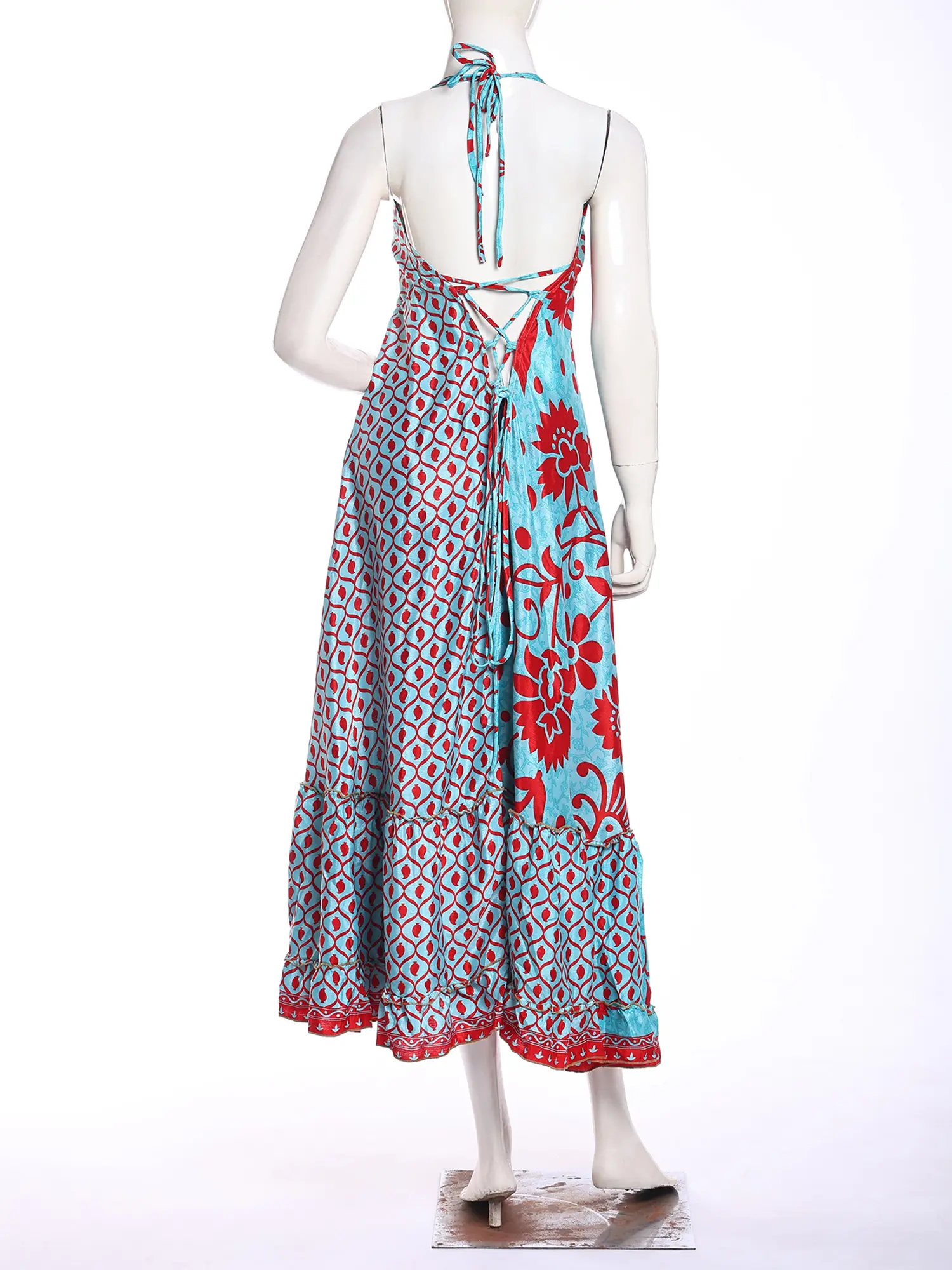 Adorned with a captivating print, this maxi-length creation is a testament to artisanal design. The eye-catching pattern, featuring a harmonious blend of sky blue and vivid red, flows seamlessly across the silk. Its halter neckline gracefully frames your décolletage, while the generous fifty-one inches of length create a dramatic, sweeping silhouette that elongates your form. The design ensures a comfortable fit, with a bust measuring thirty-six inches, designed to flatter.