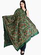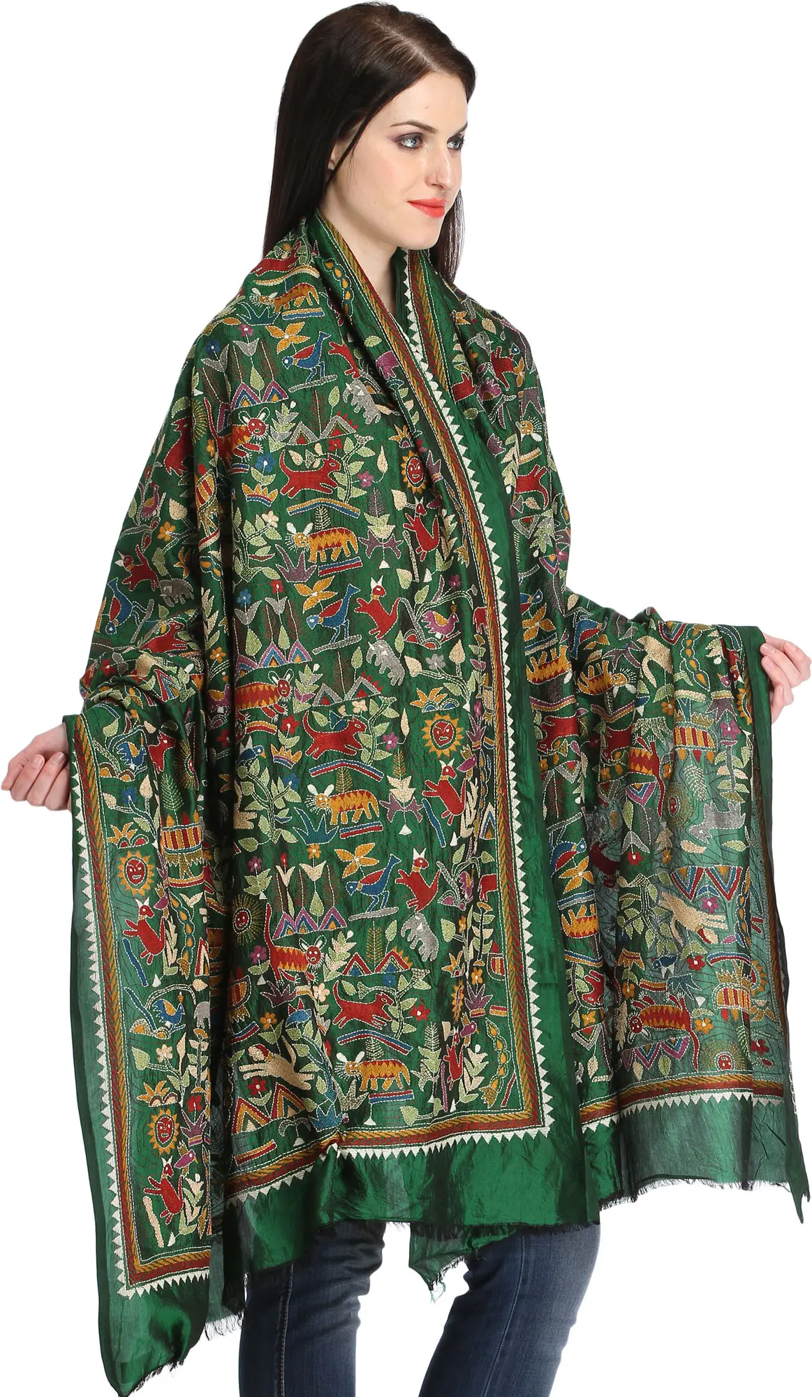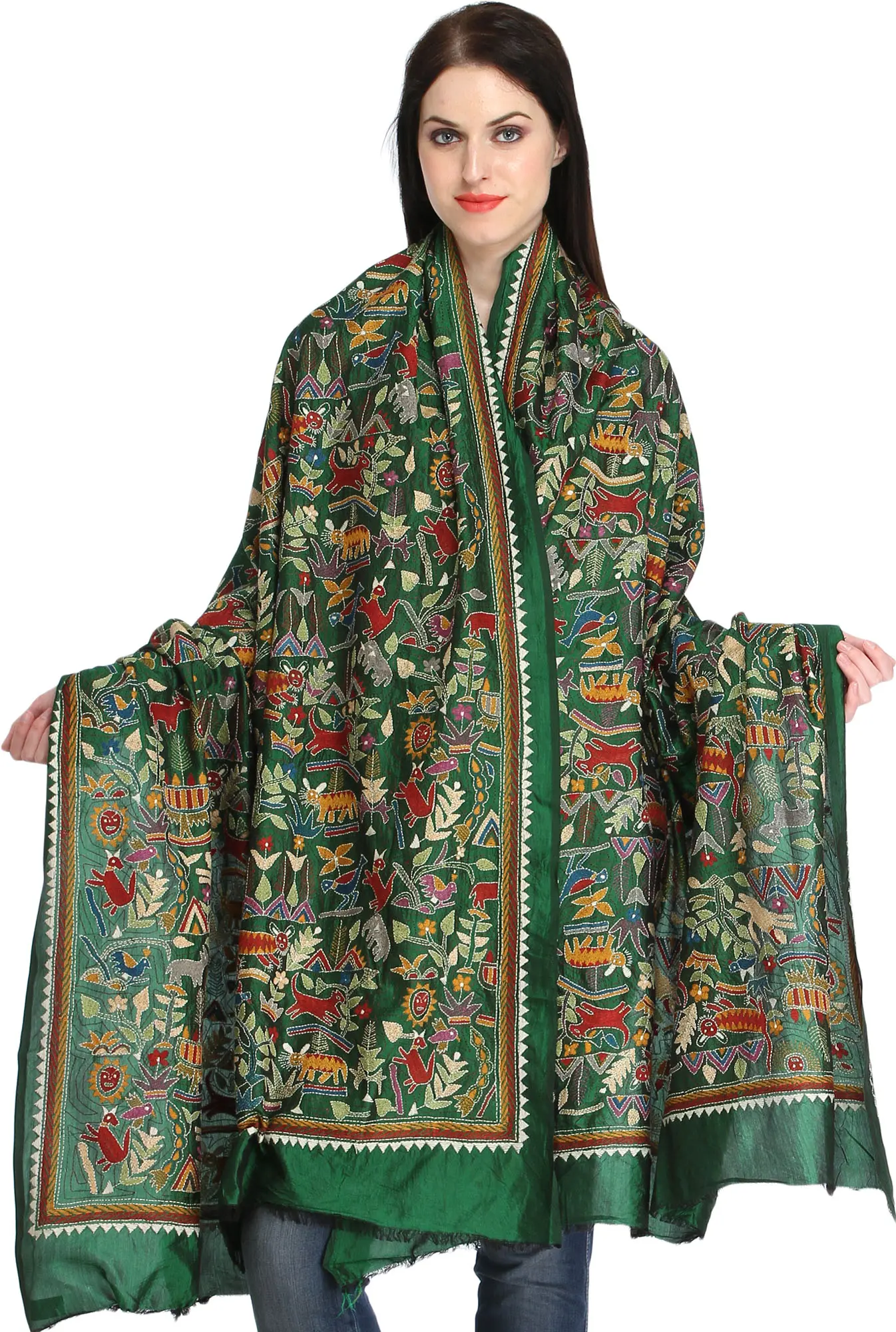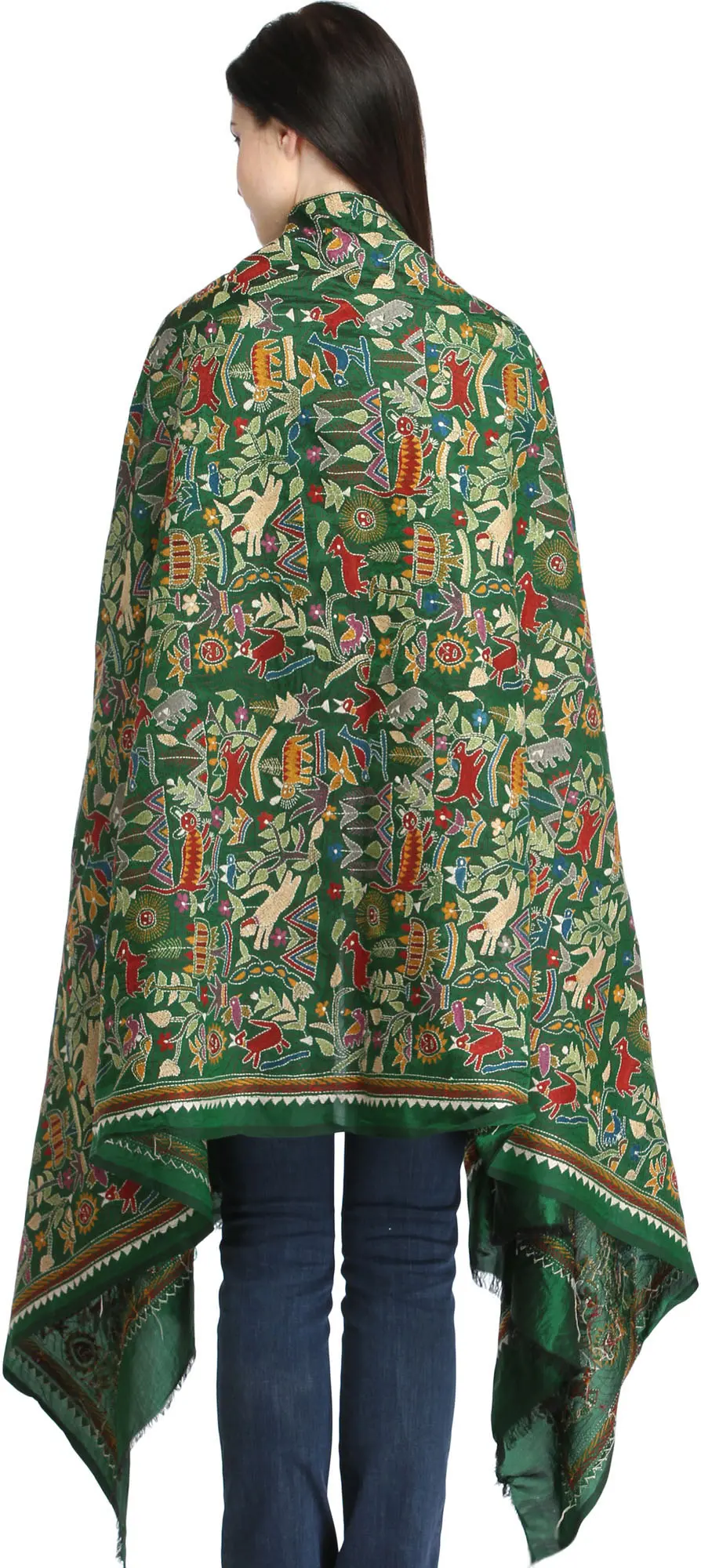 Foliage-Green Kantha Hand-Embroidered Dupatta from Kolkata with Depicting Forest
