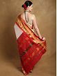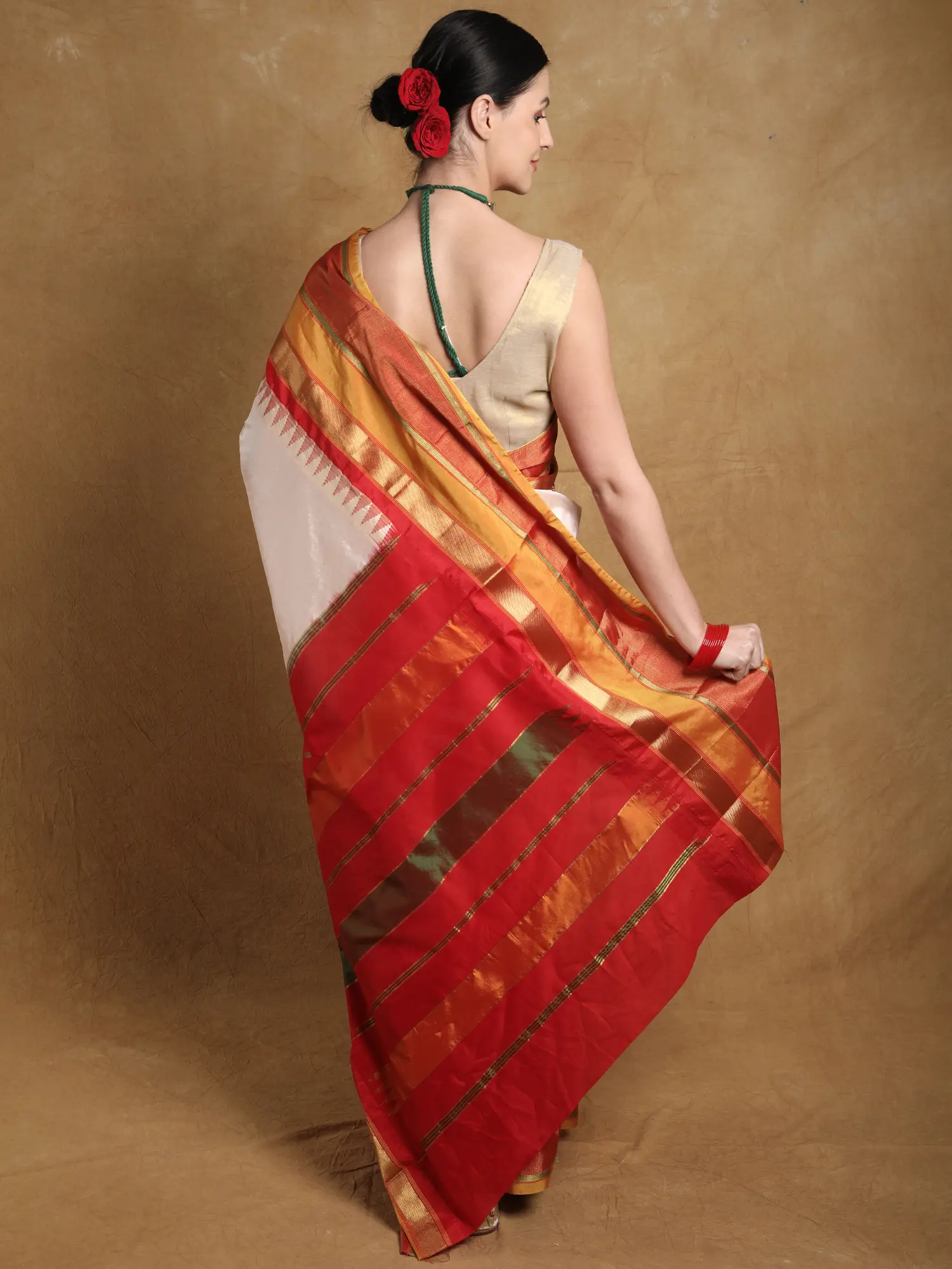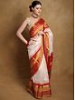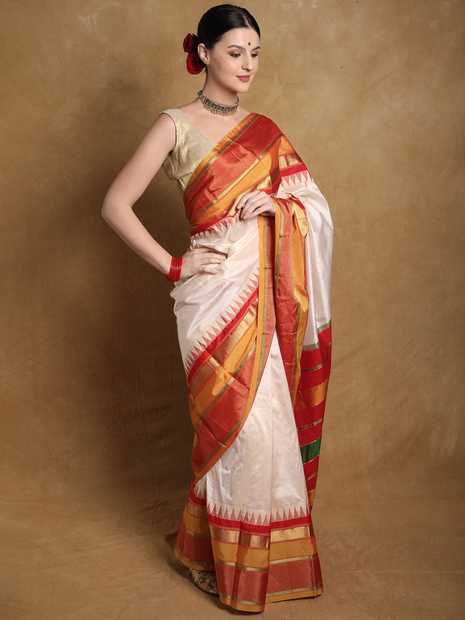 A classic and luxurious silk drape, this frappe plain saree from Banglore is rich ethnic wear, a lovely blend of simple colors and patterns creating the perfect queenly appeal. The traditional colors of the saree, infuse a beautiful allure in the fabric, complemented by the Zari work on the border and pallu, with a temple pattern bringing an auspicious beauty to this silk gem.