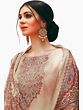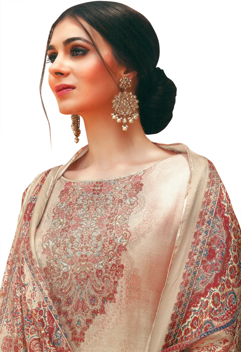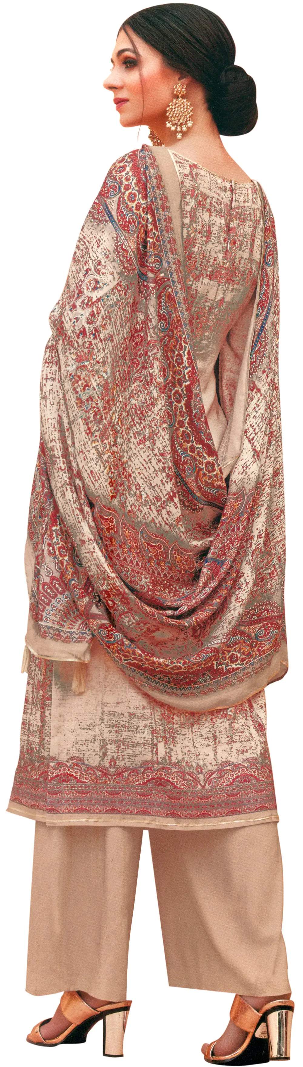 The true heart of this ensemble lies in its captivating Mughal print. Inspired by the rich artistic heritage of the Mughal era, the intricate motifs are rendered in a beautiful palette of frappe, cream, and subtle hints of red and grey. The print adorns the kameez with a stunning, ornate neckline that draws the eye, and cascades down the sleeves and hem, creating a harmonious and visually arresting design. The accompanying palazzo pants are rendered in a complementary solid frappe hue, allowing the artistry of the kameez to truly shine. The dupatta mirrors the intricate detailing of the kameez, featuring a border adorned with the same captivating Mughal patterns, finished with delicate tassels that add a touch of playful charm.