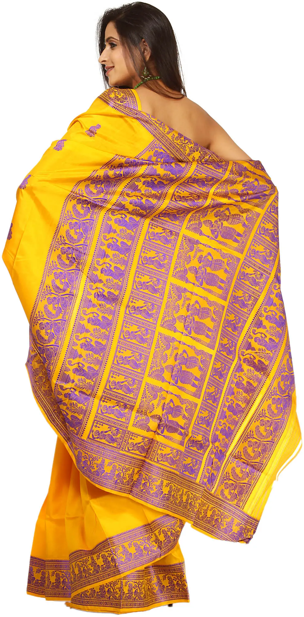 Freesia-Yellow Baluchari Sari Depicting Mythological Episodes