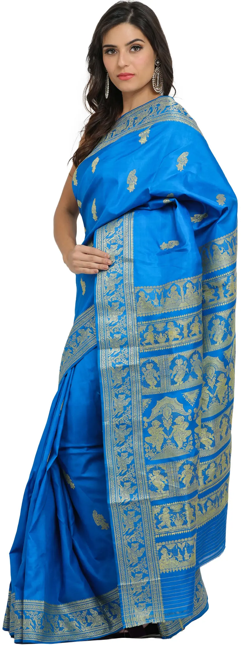A Baluchari saree's distinguishing characteristic lies in its being a wearable work of art, what with the depiction of essential Oriental motifs on the pallu such as dancing apsaras in this one. Of a fine, intense cerulean hue, the luxuriant weaving along the edges and on the pallu will ensure that once you drape it you stand out. You choicest silver jewels will set off this Baluchari beauty to perfection.