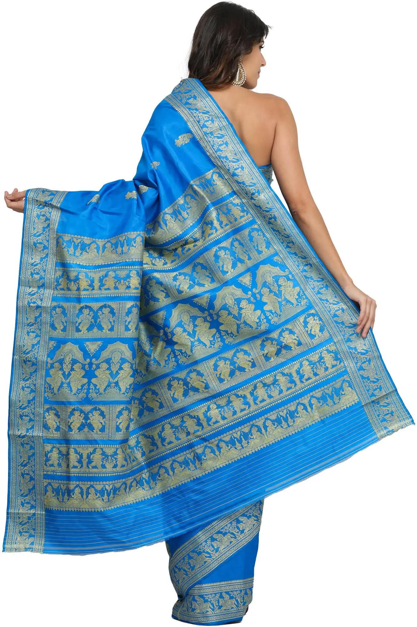 French Blue Baluchari Sari with Hand-Woven Dancing Apsaras on Aanchal