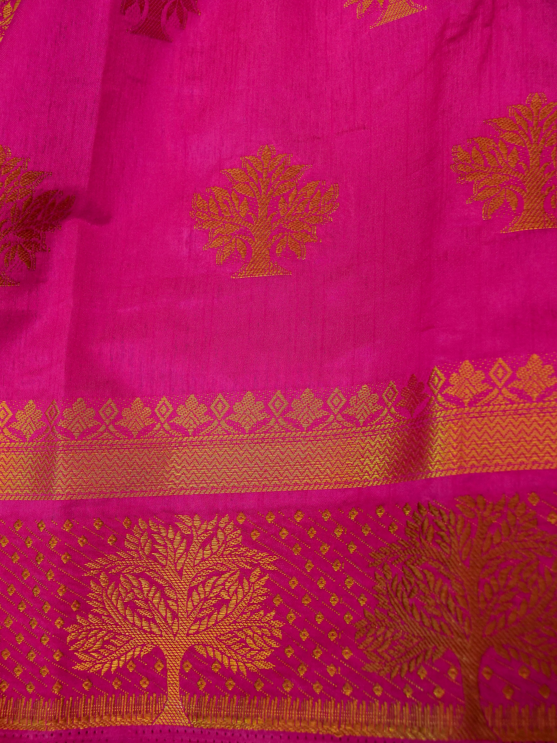 Rich woven patterns on the pallu with lines and tree patterns, give it a gorgeous appearance, which is chic yet truly ethnic.