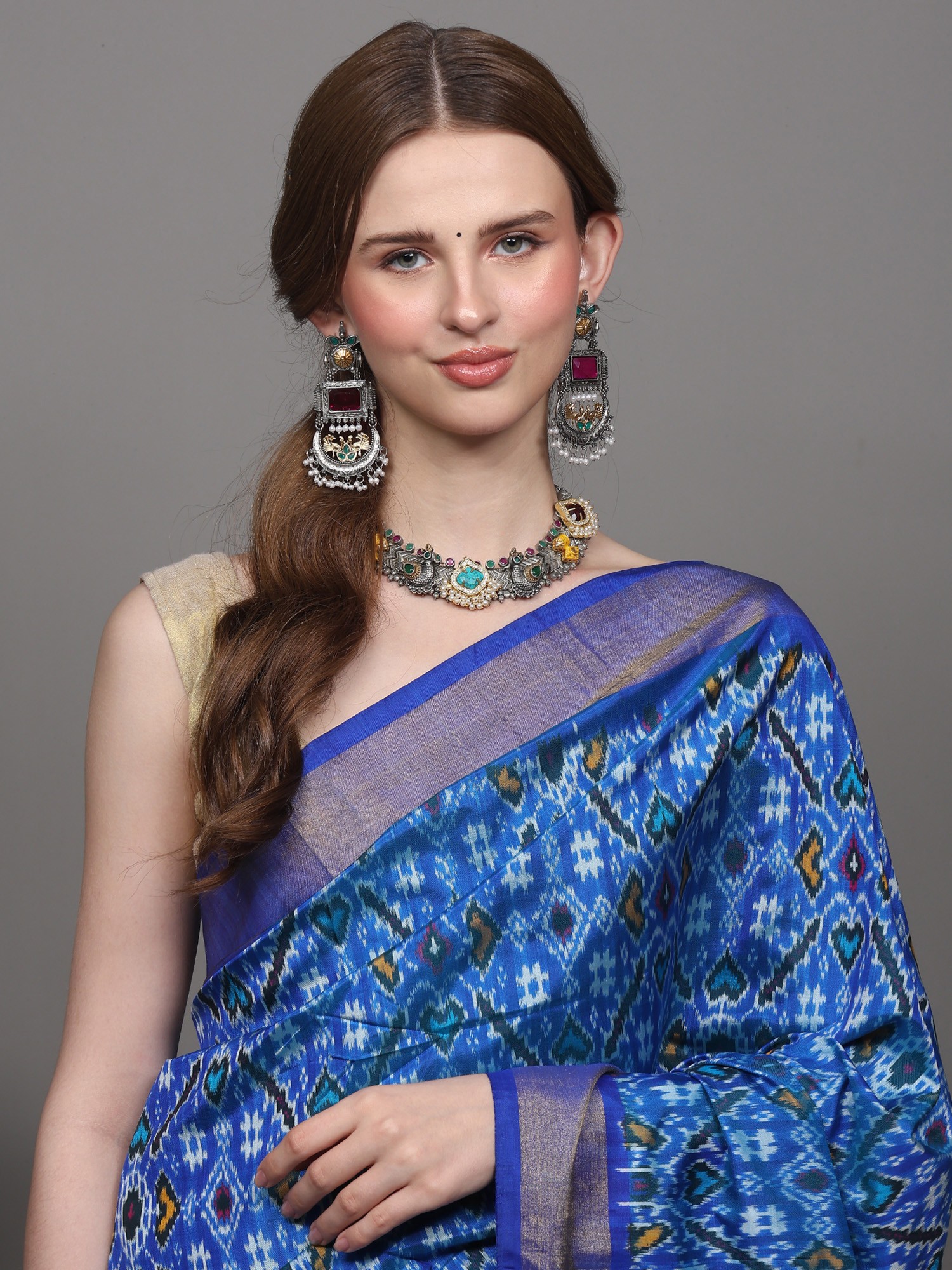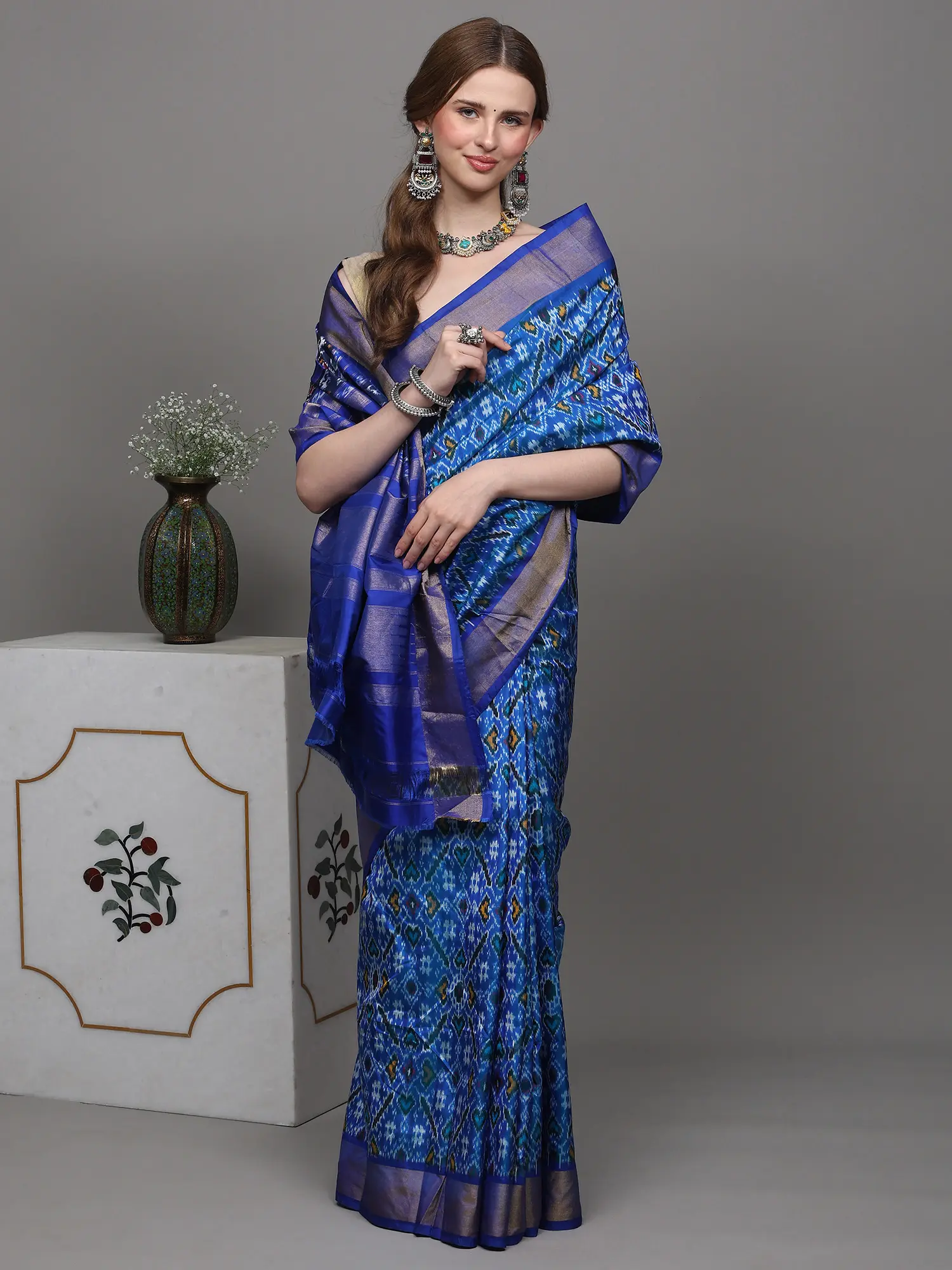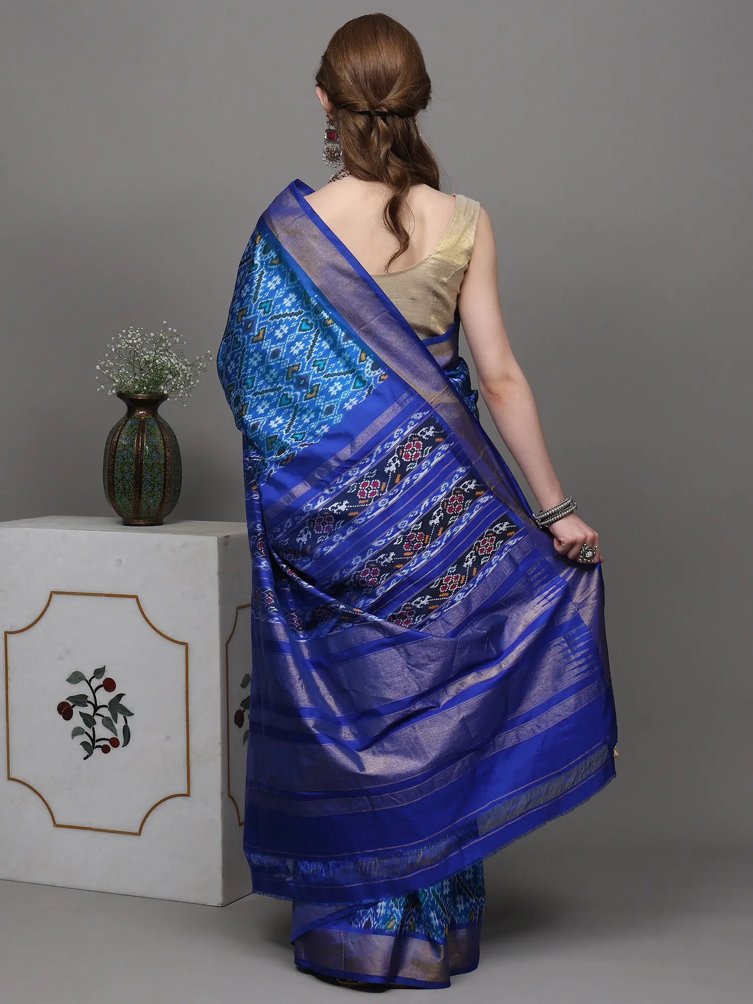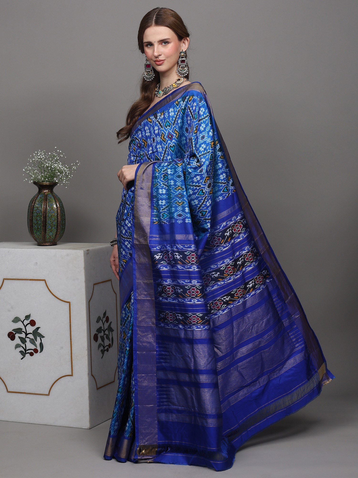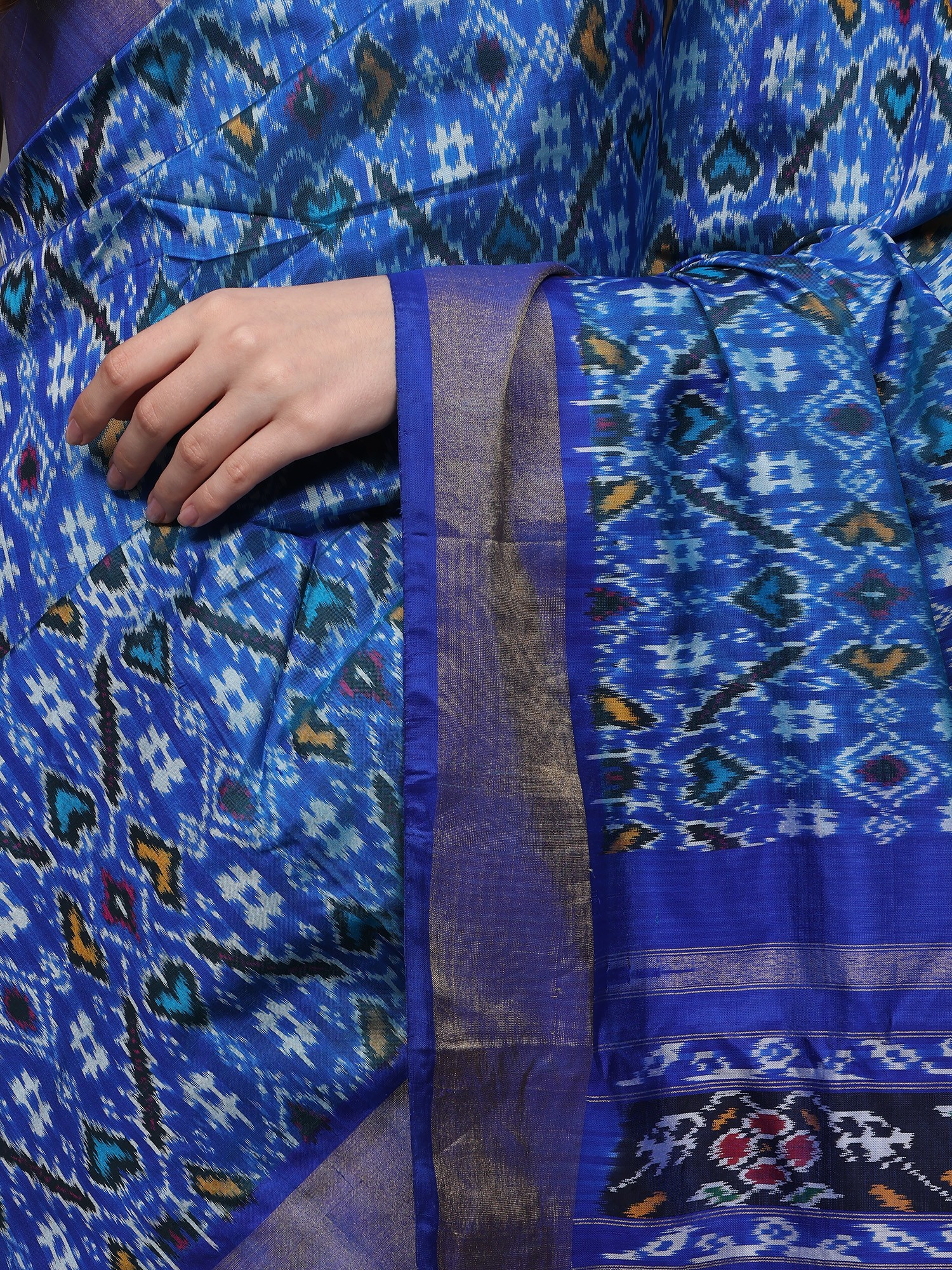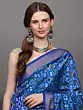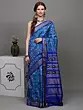 Whitecap-Gray Ikat Handloom Pure Cotton Saree with Contrast Blue Temple Border from Sambalpur