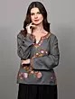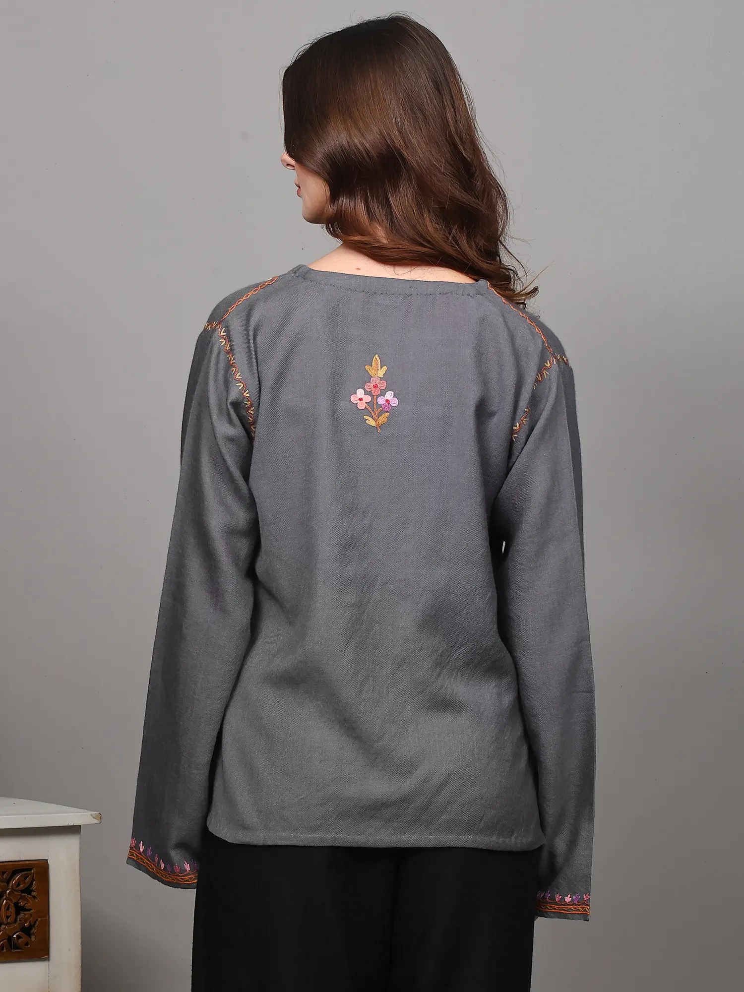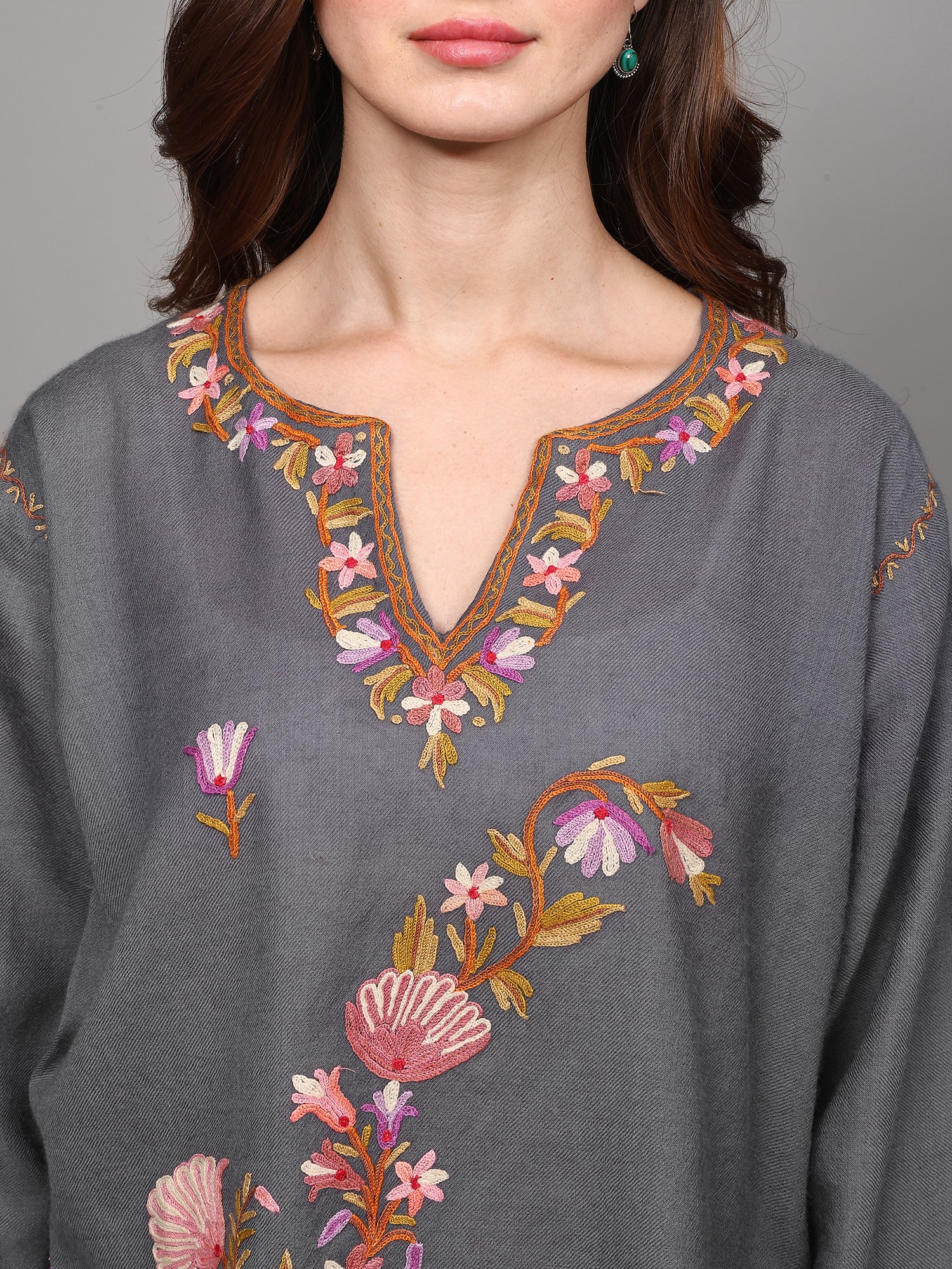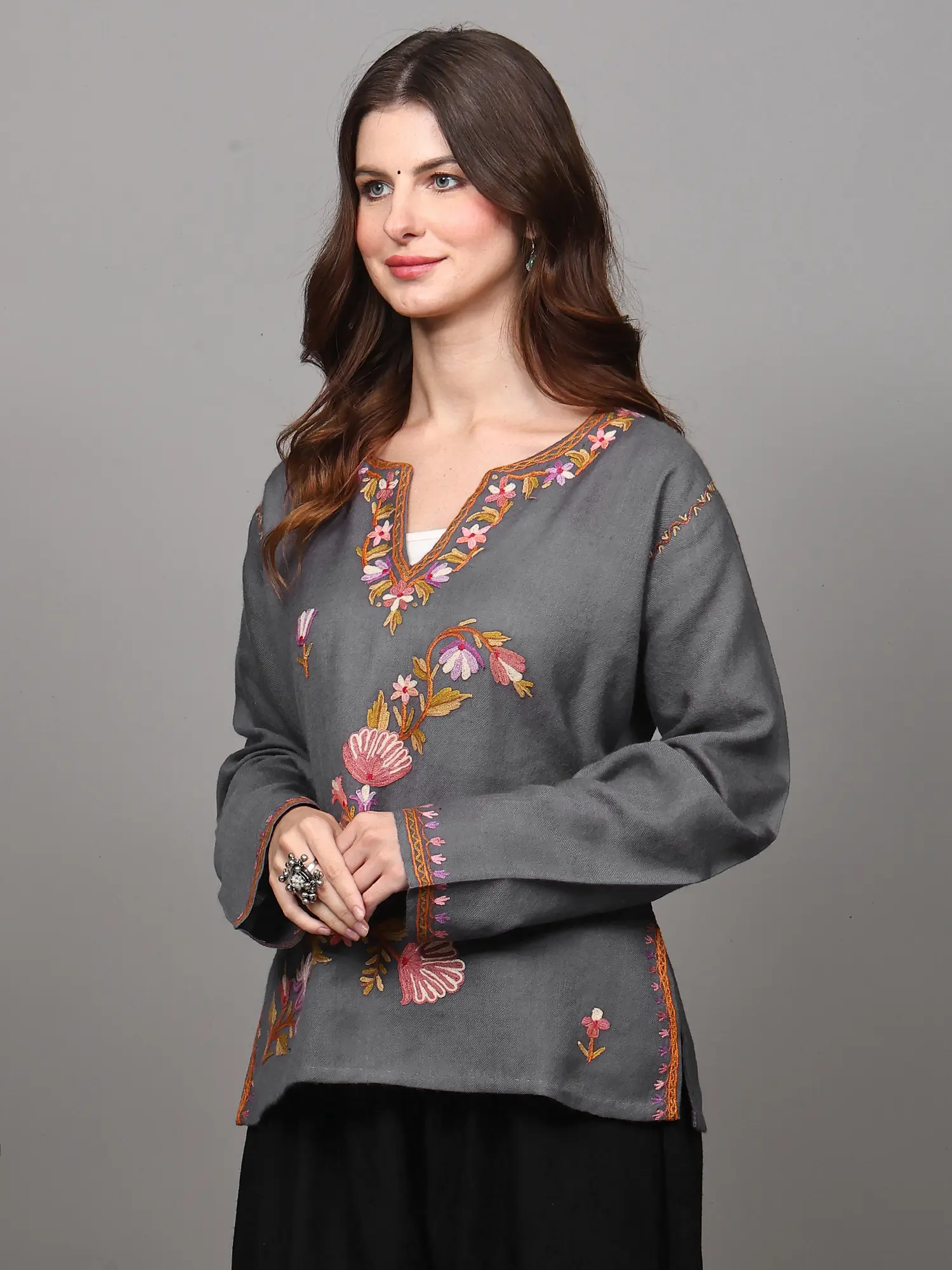 Discover the timeless beauty of Kashmir with this exquisite short kurti. Crafted from the finest pure wool, this piece offers unparalleled warmth and a luxuriously soft feel, perfect for the cooler seasons. The elegant frost-gray hue serves as a sophisticated canvas for the vibrant and intricate Aari embroidery that adorns the neckline, sleeves, and hem.