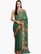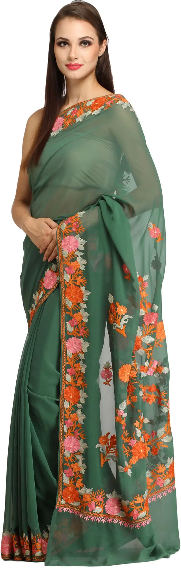 Discover the allure of traditional artistry with this stunning georgette saree, a true testament to the rich heritage of Kashmiri embroidery. The deep, forest-green hue of the fabric evokes the lush landscapes of the Himalayas, providing a captivating backdrop for the vibrant, meticulously crafted Aari embroidery. This ancient needlework technique, passed down through generations of skilled artisans, is evident in the intricate floral motifs that adorn the border and the elegant pallu.