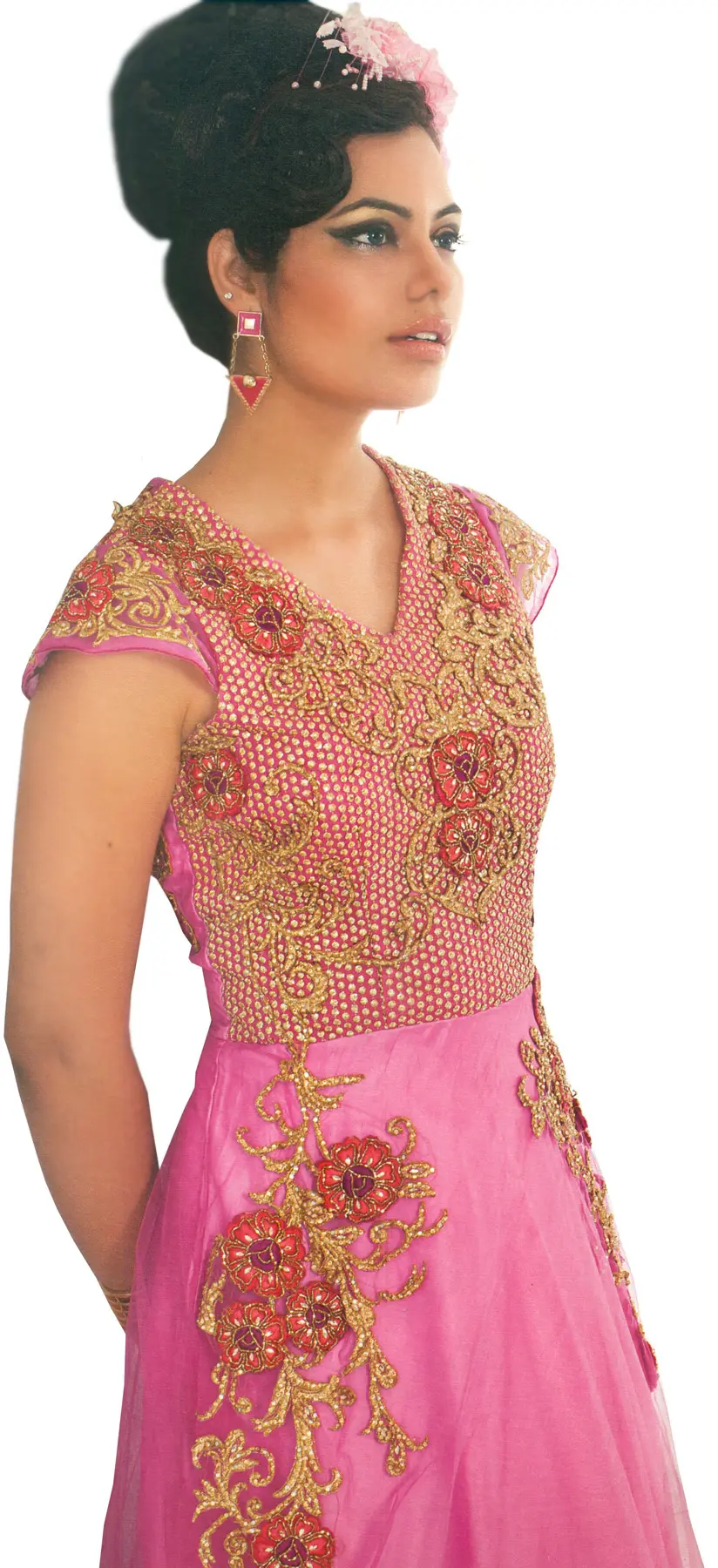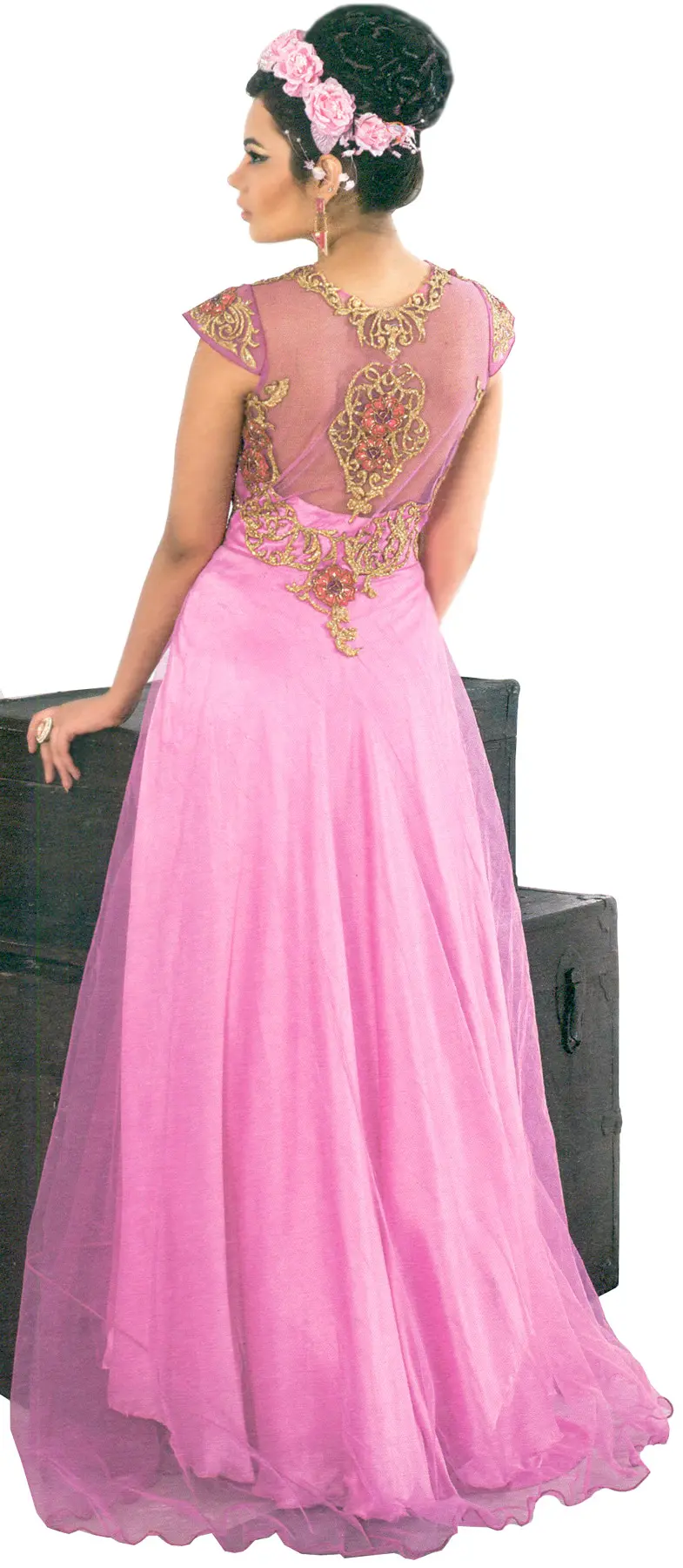 Every woman as a little girl dreamed of becoming a fairy. Magical, beautiful, and dressed in a lovely pink gown. This fuschia pink wedding gown with its charming hue and intricate embellishment is a way to fulfill your fairytale. The flowy net fabric crafts an elegant piece that is made regal with Zari embroidery on the torso, back, and waist. Sequins added to the threadwork elevate the whole look, like little stars readying the dress for a fairy queen.