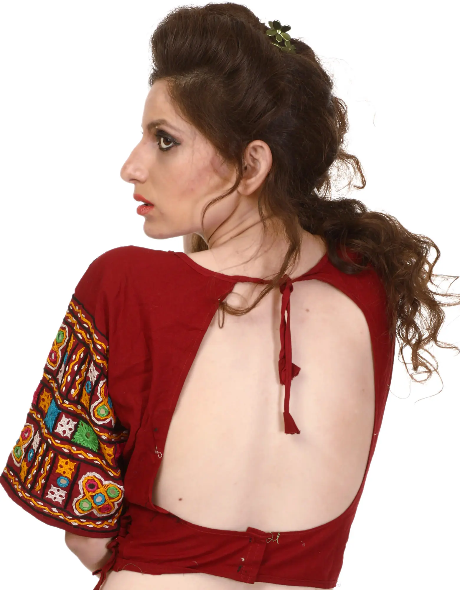 Garnet-Red Backless Choli from Kutch with Antiquated Rabari Embroidery and Mirrors
