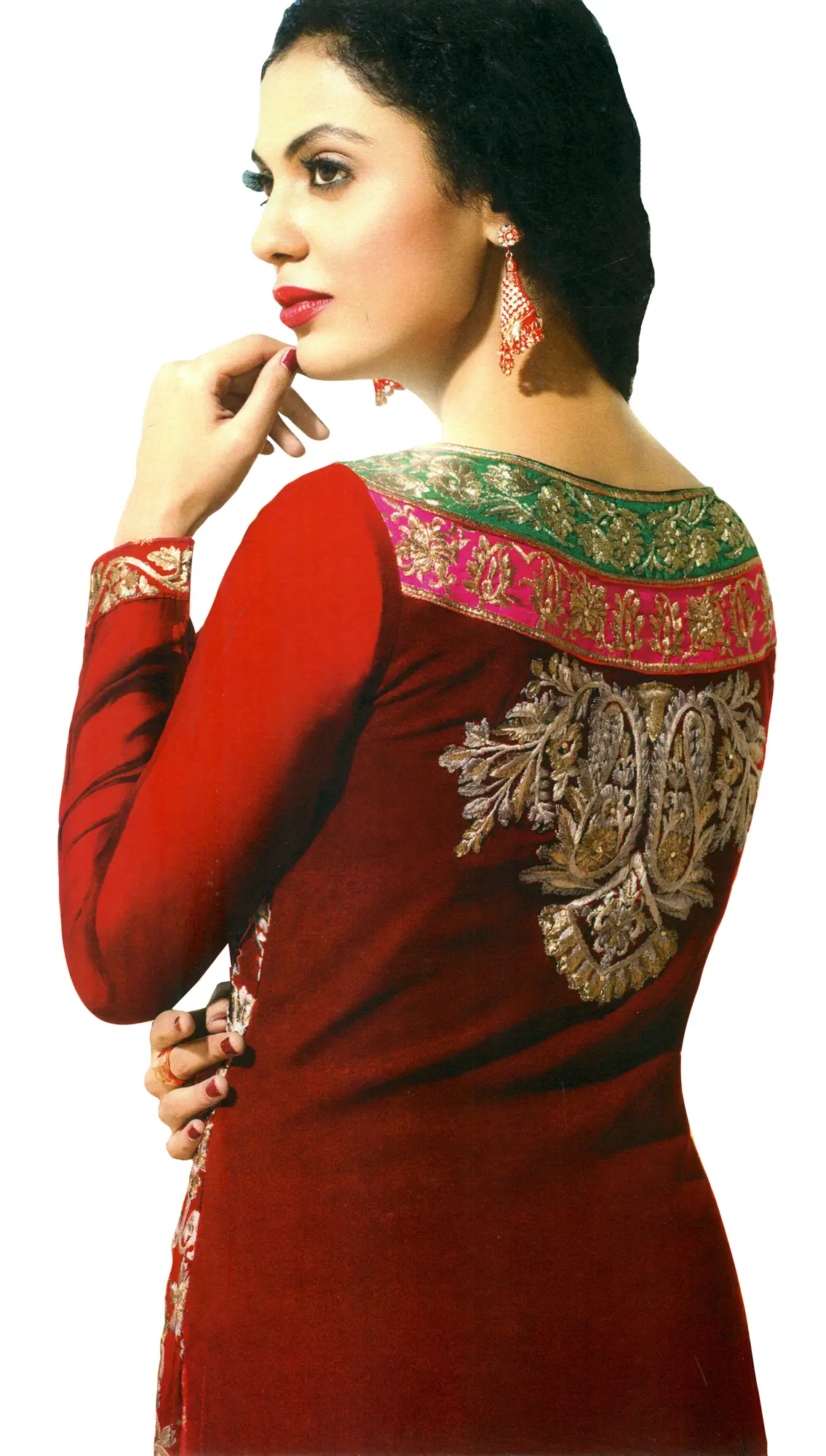 Champagne-Beige and Red Designer Embroidered Long Anarkali Suit with Paisleys Patch Border and Sequins-Work