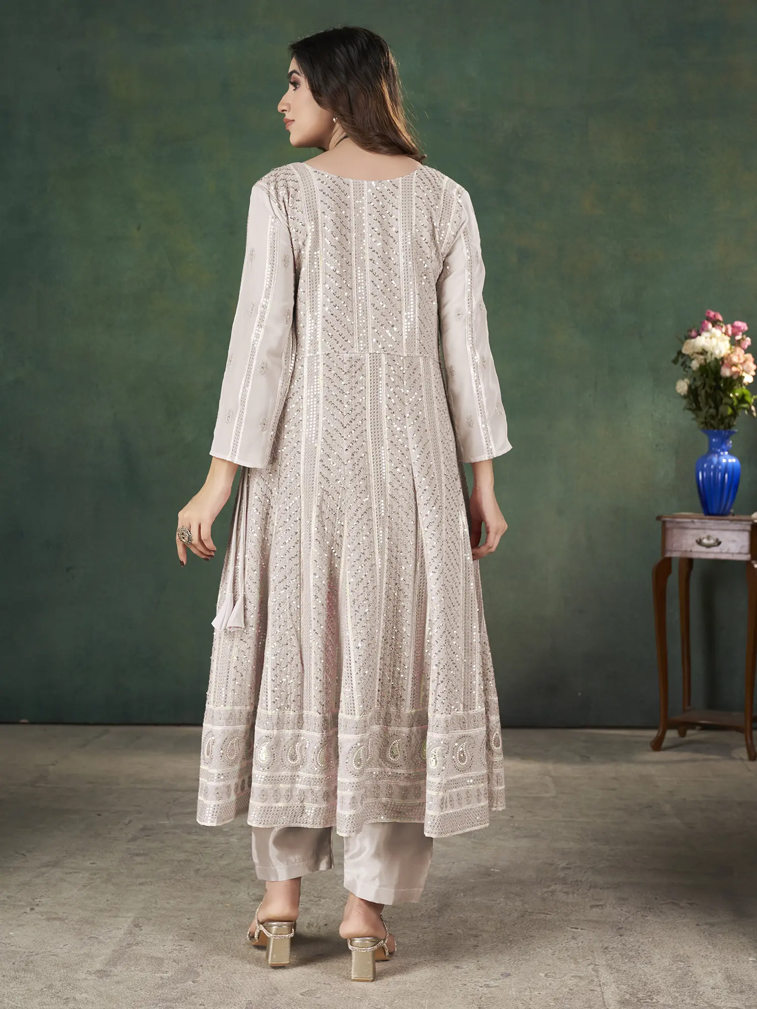 Embroidered Anarkali Dress with All-Over Sequins, Georgette Fabric, Dupatta and Crepe Pants