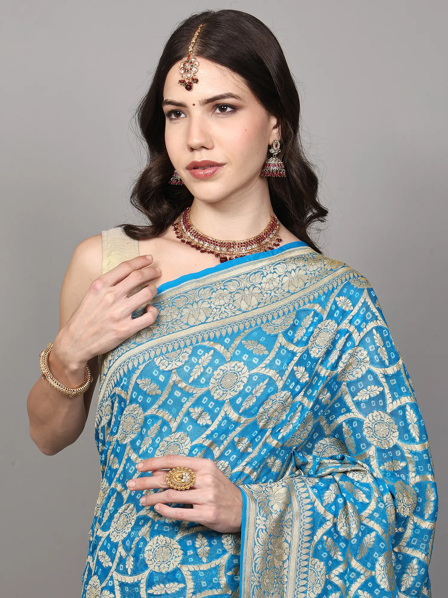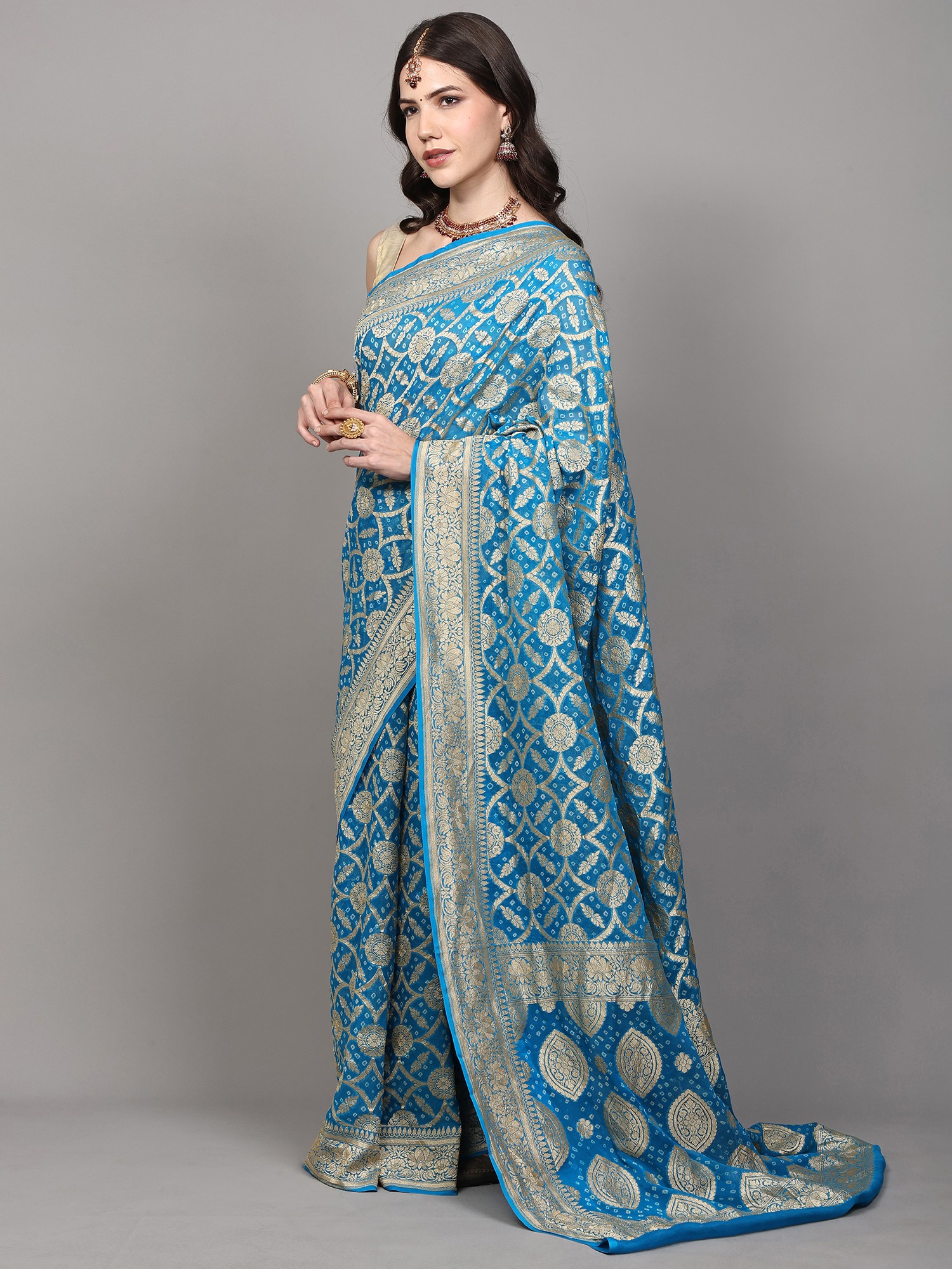 Adorning this stunning saree is the traditional Bandhej tie-dye technique, creating a mesmerizing pattern that speaks of artisanal skill and cultural legacy. Interwoven with the Bandhej are delicate motifs woven with golden thread, meticulously crafted to create an all-over design. These intricate patterns, a hallmark of Gujarati craftsmanship, catch the light beautifully, adding a regal shimmer to the vibrant blue hue of the georgette. The contrast between the fluid fabric and the structured golden weave creates a captivating visual appeal.