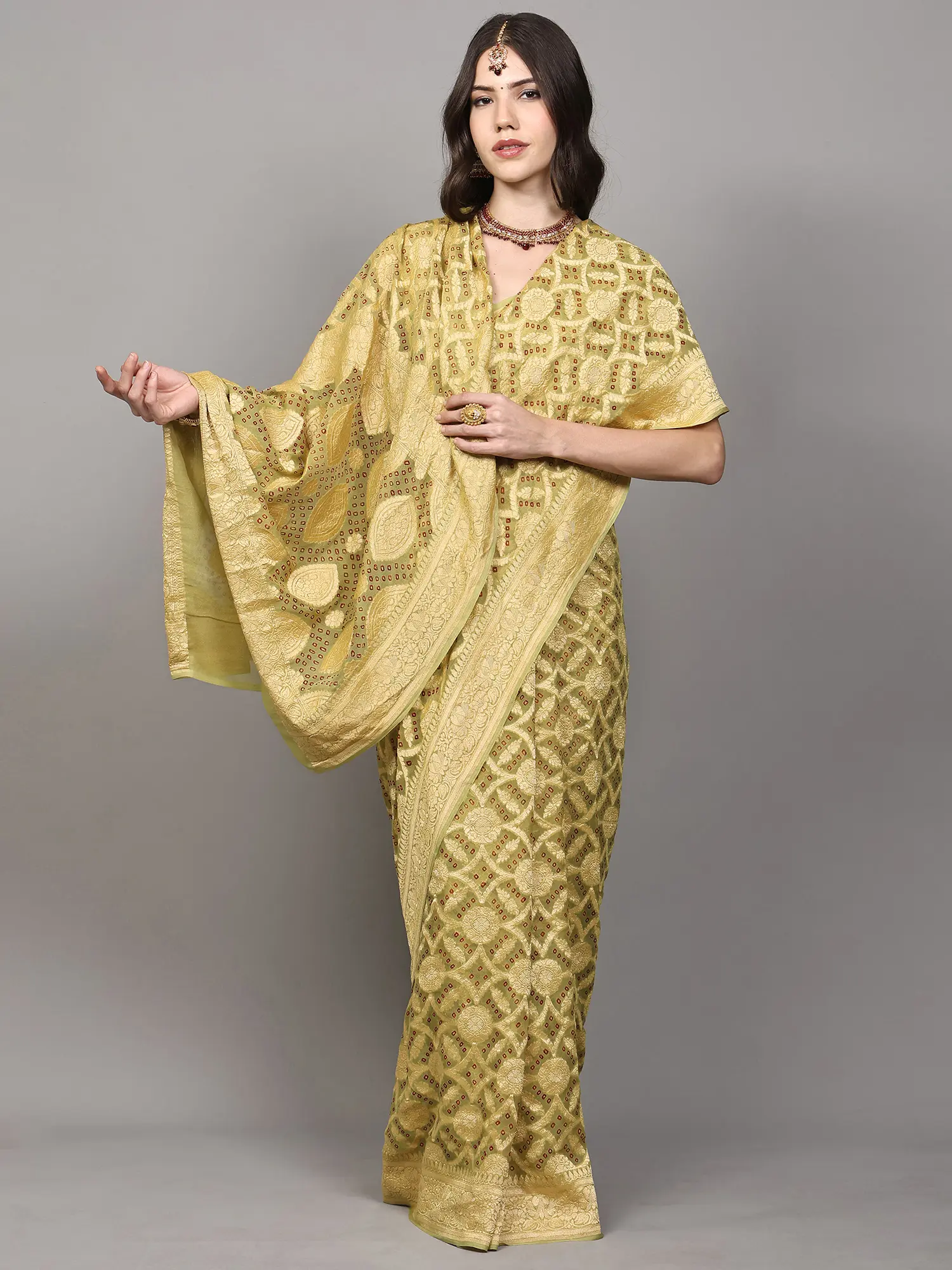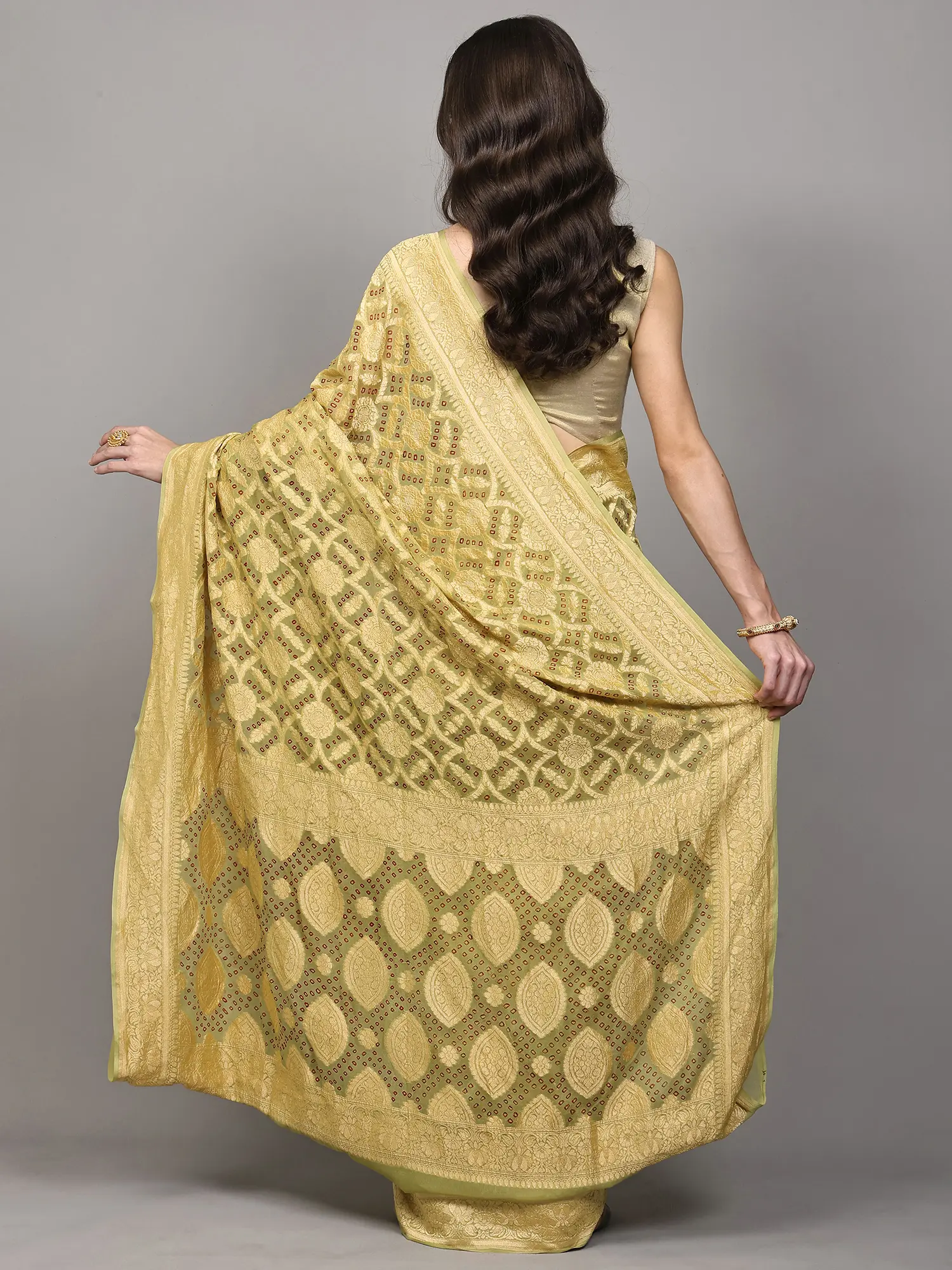Georgette Bandhej Saree with All-Over Golden Thread Woven Motifs from Gujarat