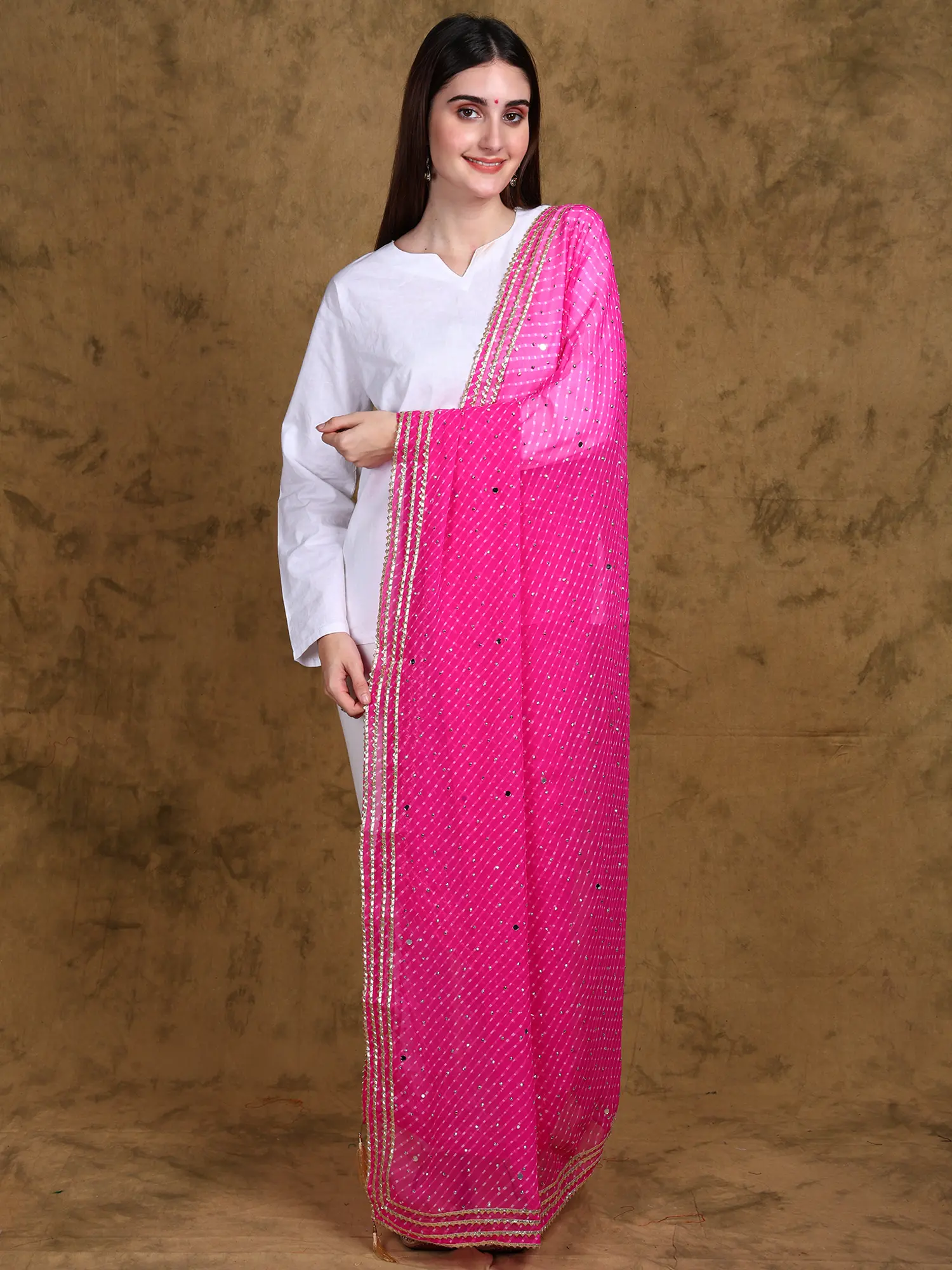 Georgette Bandhani Dupatta with Zari Woven Checks and Lace Border from Amritsar