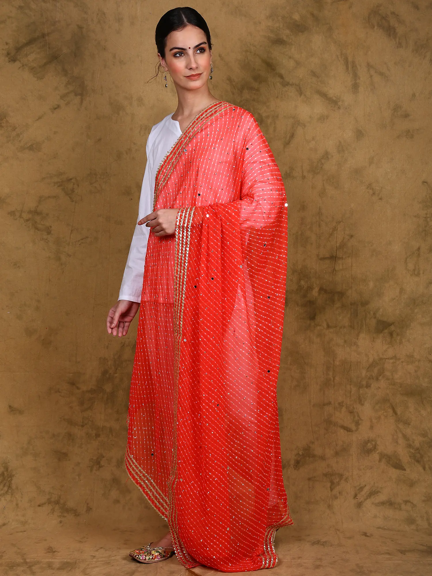 Georgette Diagonal Pattern Printed Dupatta with Bead-Mirror work and Lace Border from Amritsar
