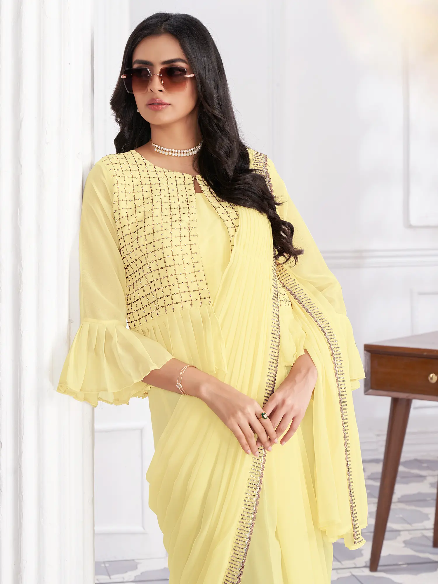 Completing this breathtaking ensemble is a designer blouse that mirrors the sophistication of the saree. The blouse features a chic jacket-style overlay, adding a modern twist to the traditional attire. The jacket is adorned with a sophisticated grid pattern embroidery, accented with delicate sequin work that harmonizes perfectly with the saree's embellishments. The sleeves of the jacket are designed with a trendy bell-sleeve cut, adding a playful yet elegant flair. This thoughtfully designed blouse not only complements the saree but also elevates the entire look, making it a truly remarkable and cohesive outfit. ––––––––––––––––––––