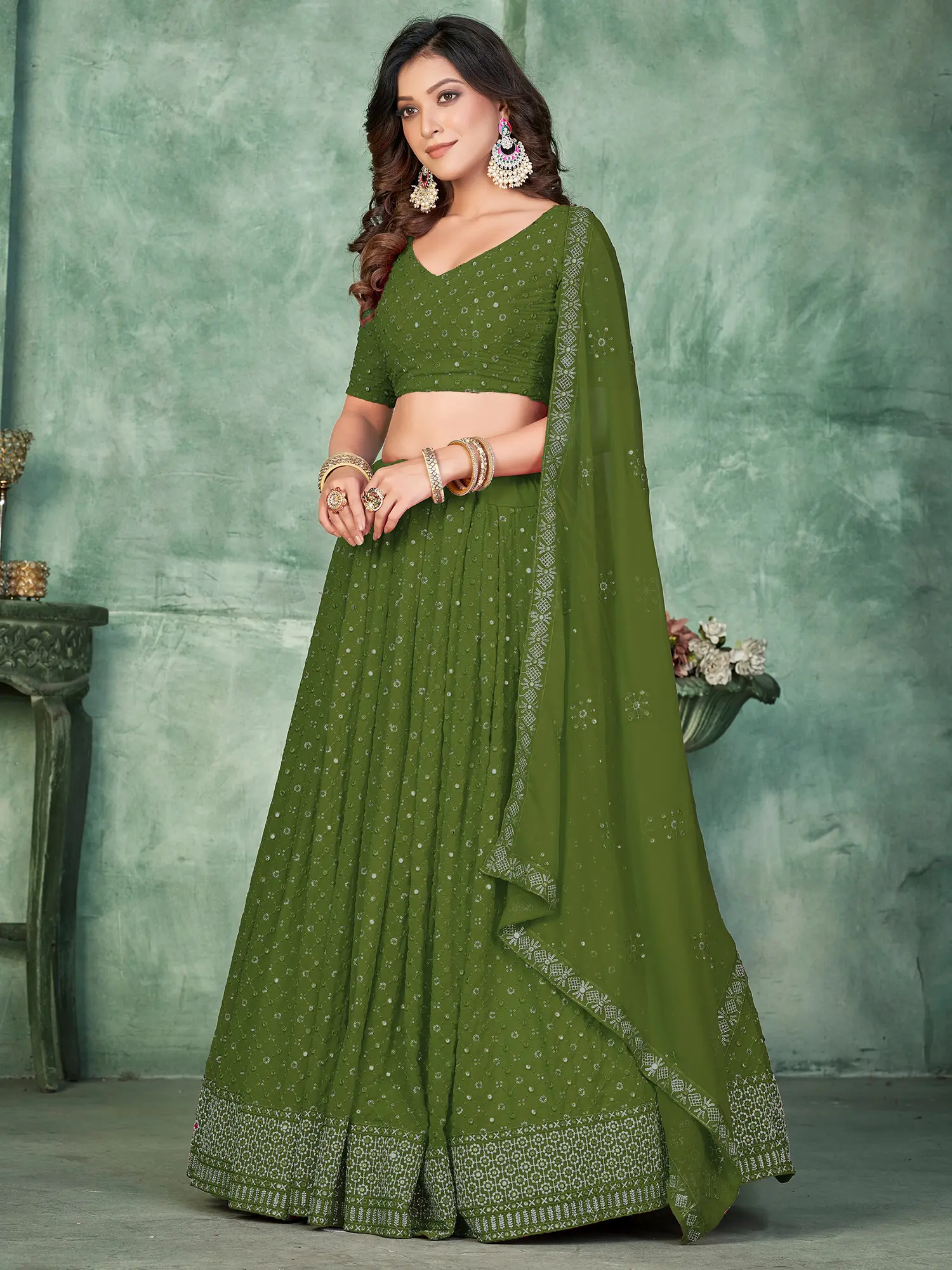 Step into the spotlight with this exquisite Georgette Lehenga Choli, a masterpiece designed to make you shine at any wedding celebration. Crafted from luxurious georgette fabric, this ensemble drapes beautifully, offering both comfort and a sophisticated silhouette. The rich, vibrant green hue is both timeless and on-trend, providing a stunning backdrop for the intricate detailing that truly sets this piece apart.