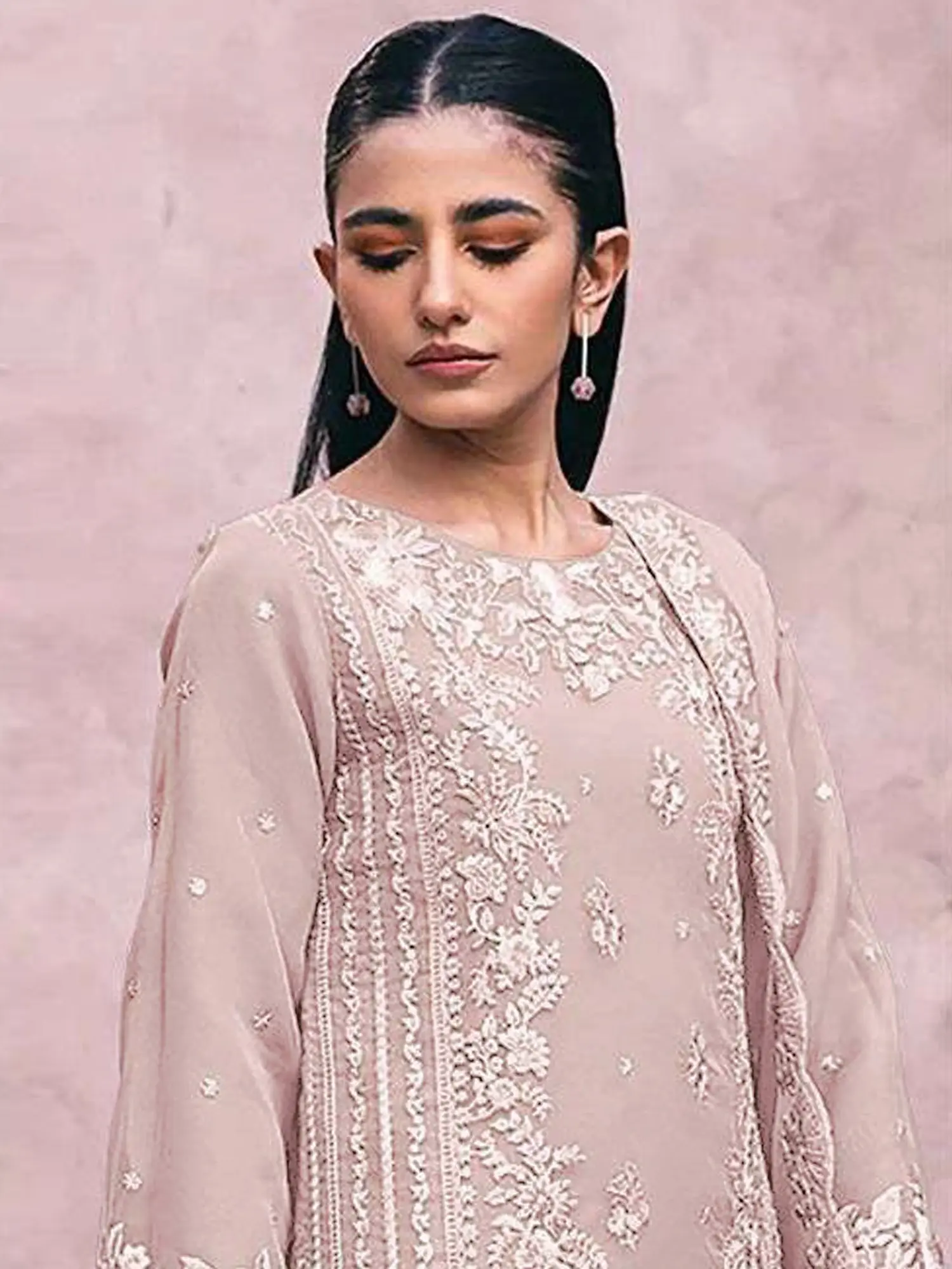 Bleached-Cedar Designer Embroidery Work Attractive Party Wear Kurta Set With Striped Dupatta