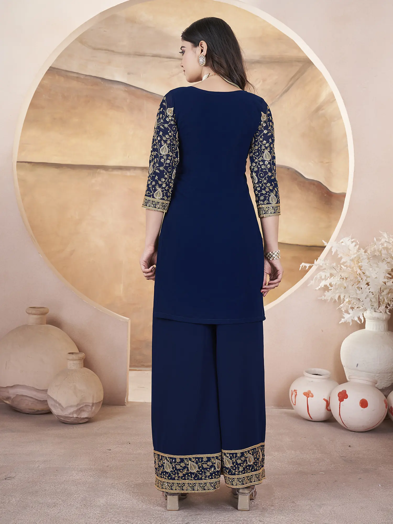 Lapis-Blue Faux Georgette Floral Embroidery Work Kurti Sharara Set