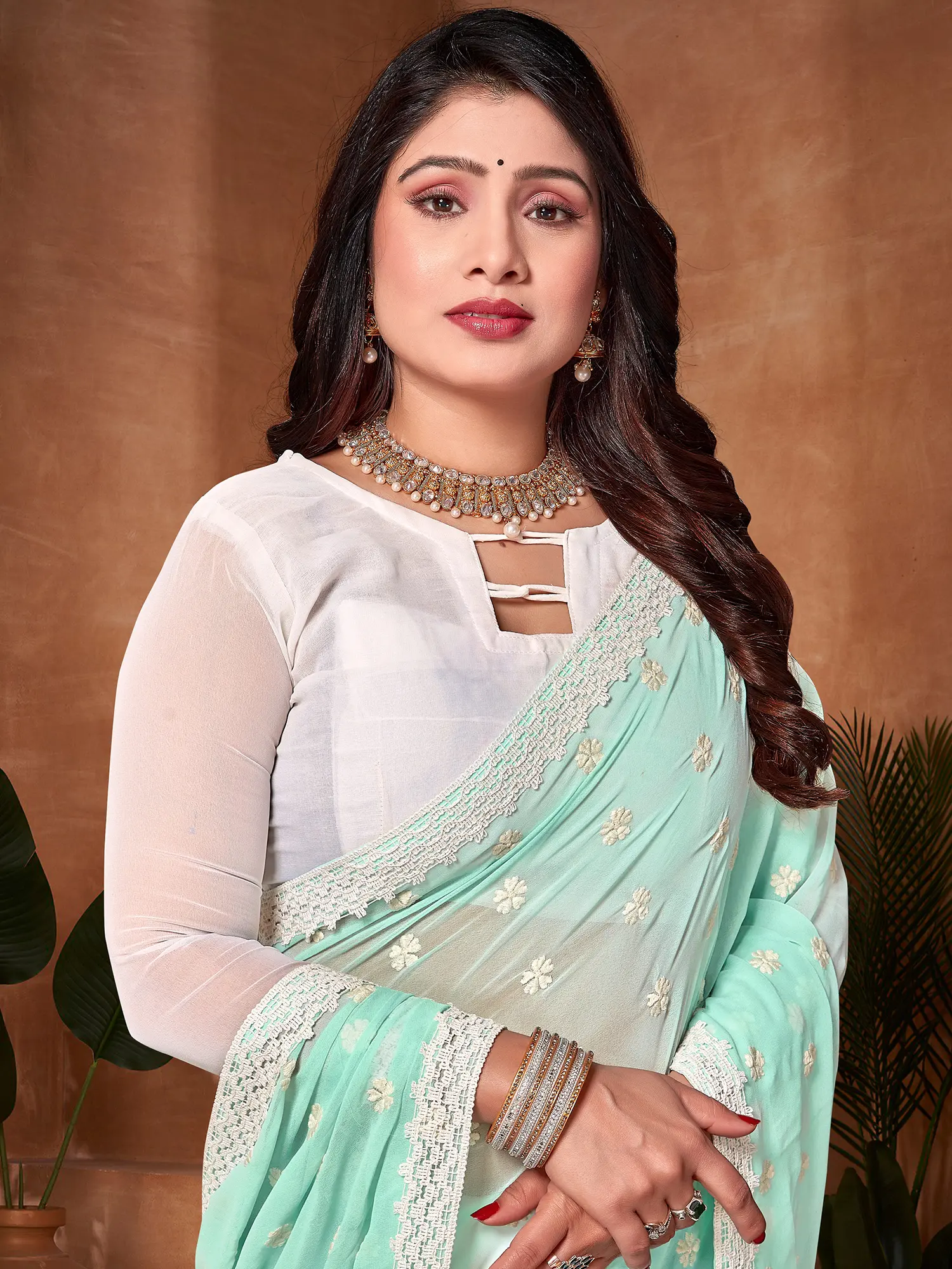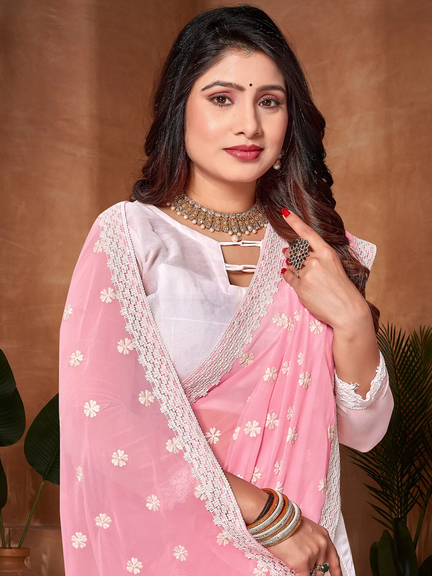 Lucent-White Georgette Designer Saree with Sequins-Stone Embroidery and Jhalar Pallu