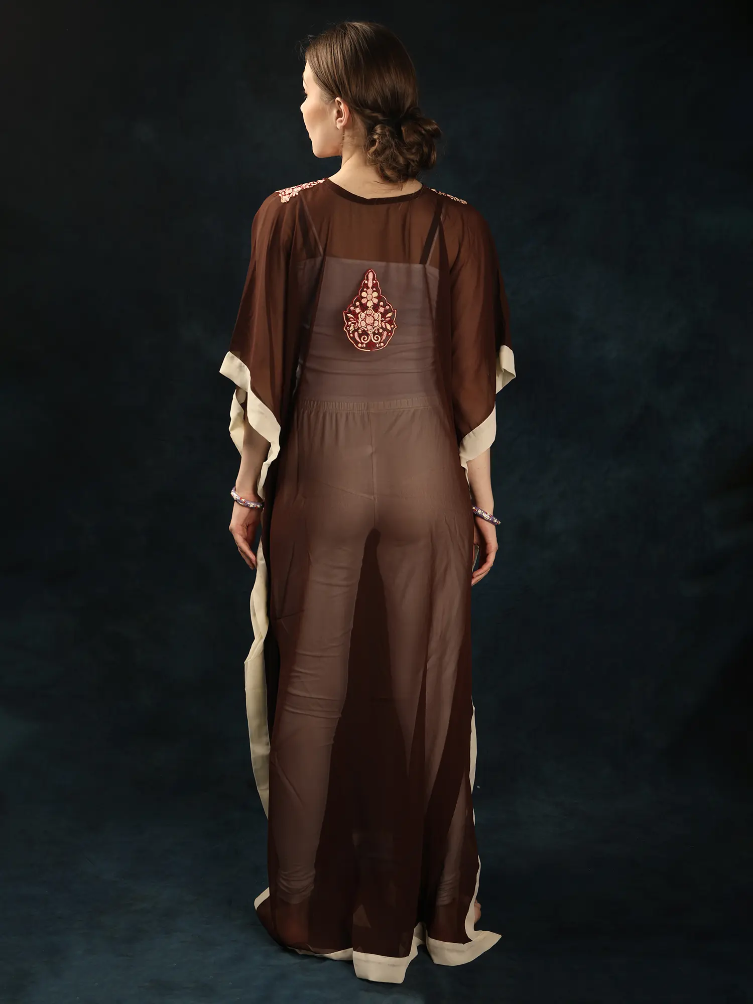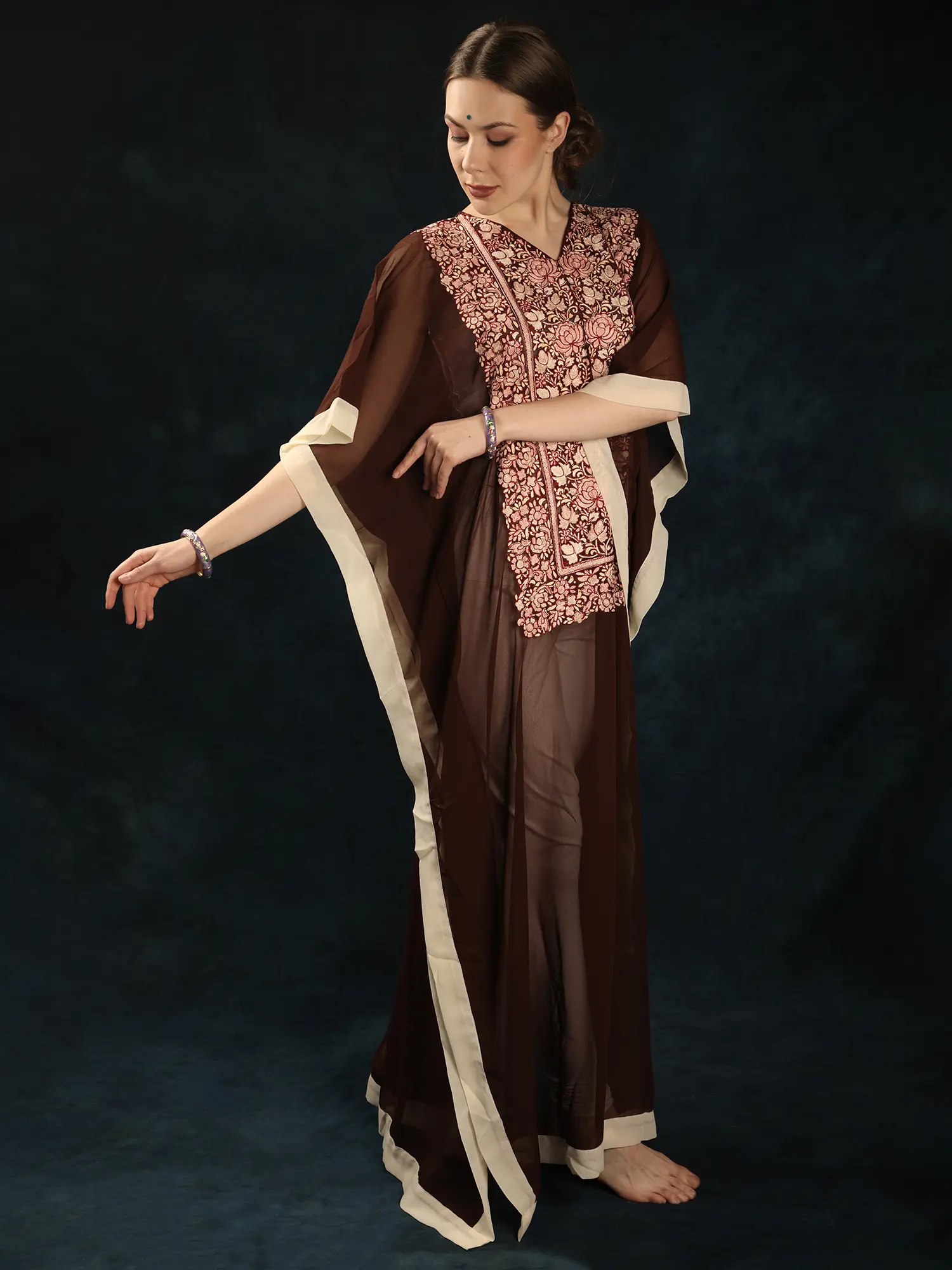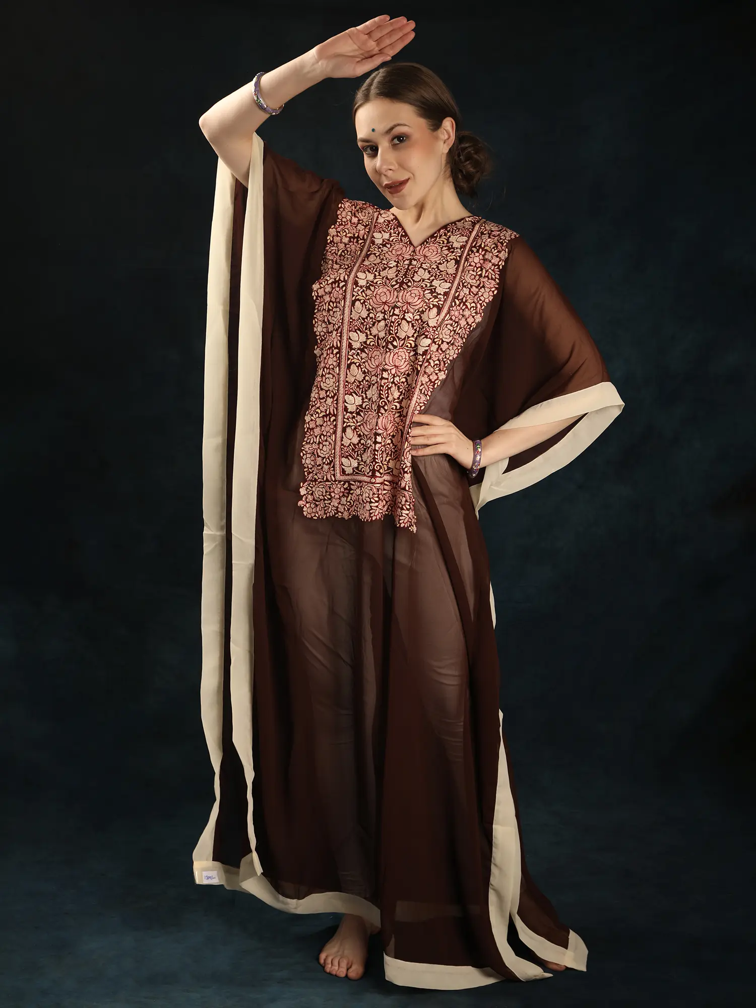 Sheer comfort and intricate appeal of Aari come together in this beautiful long Kaftan.