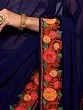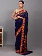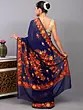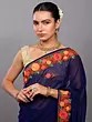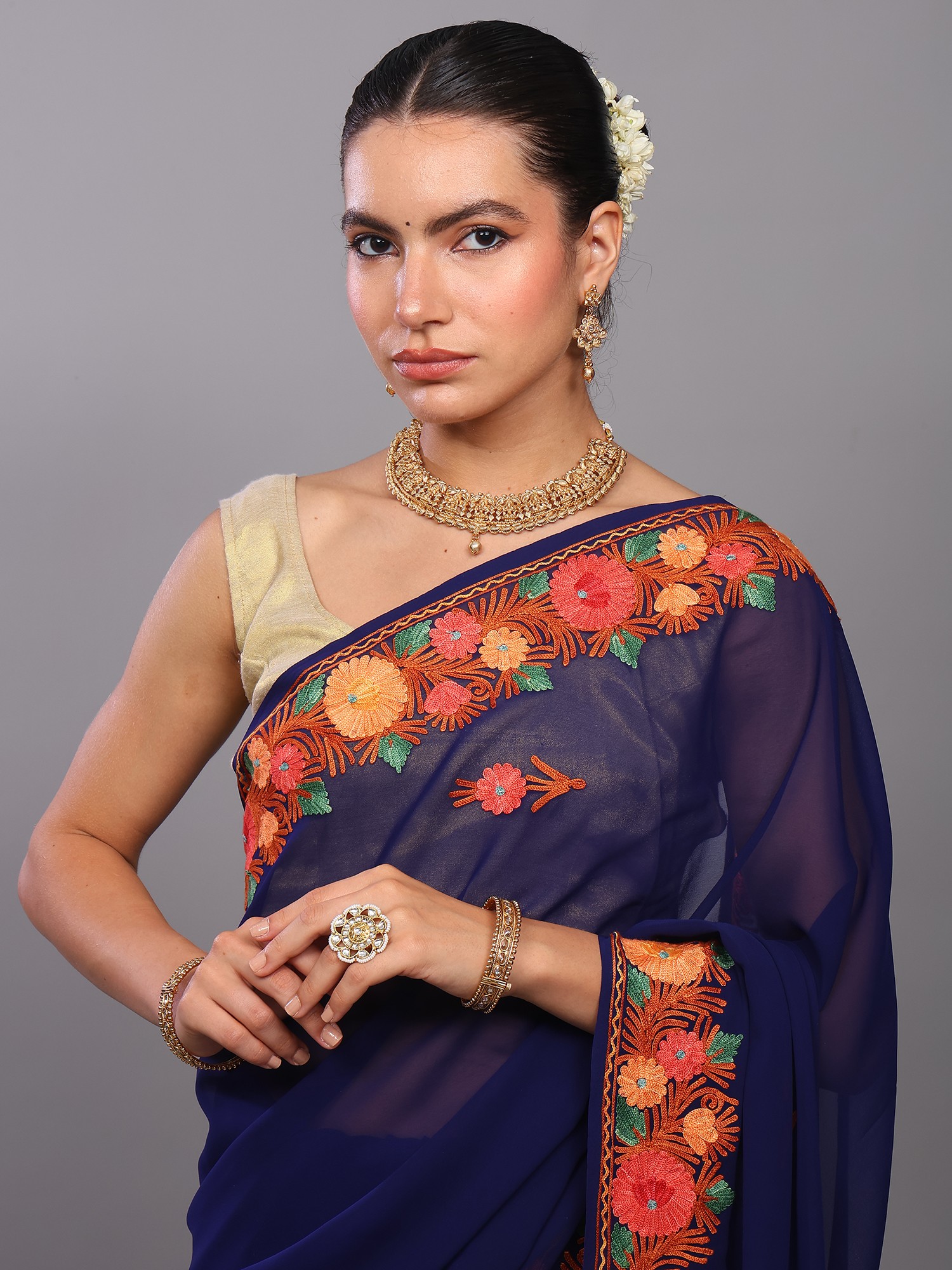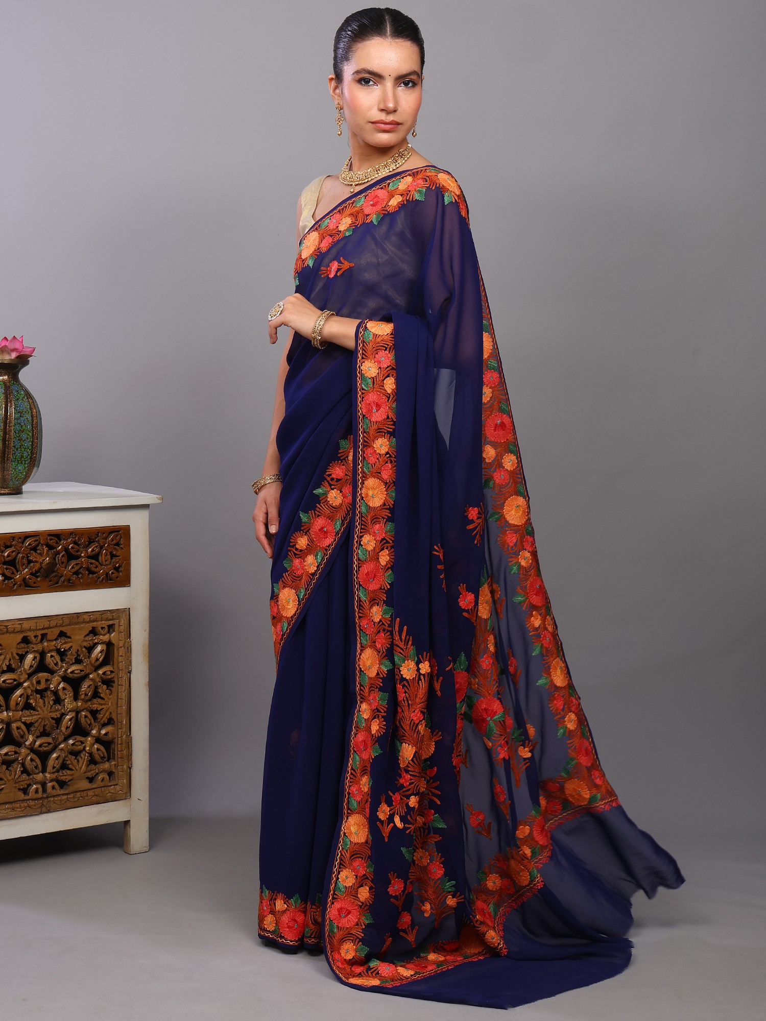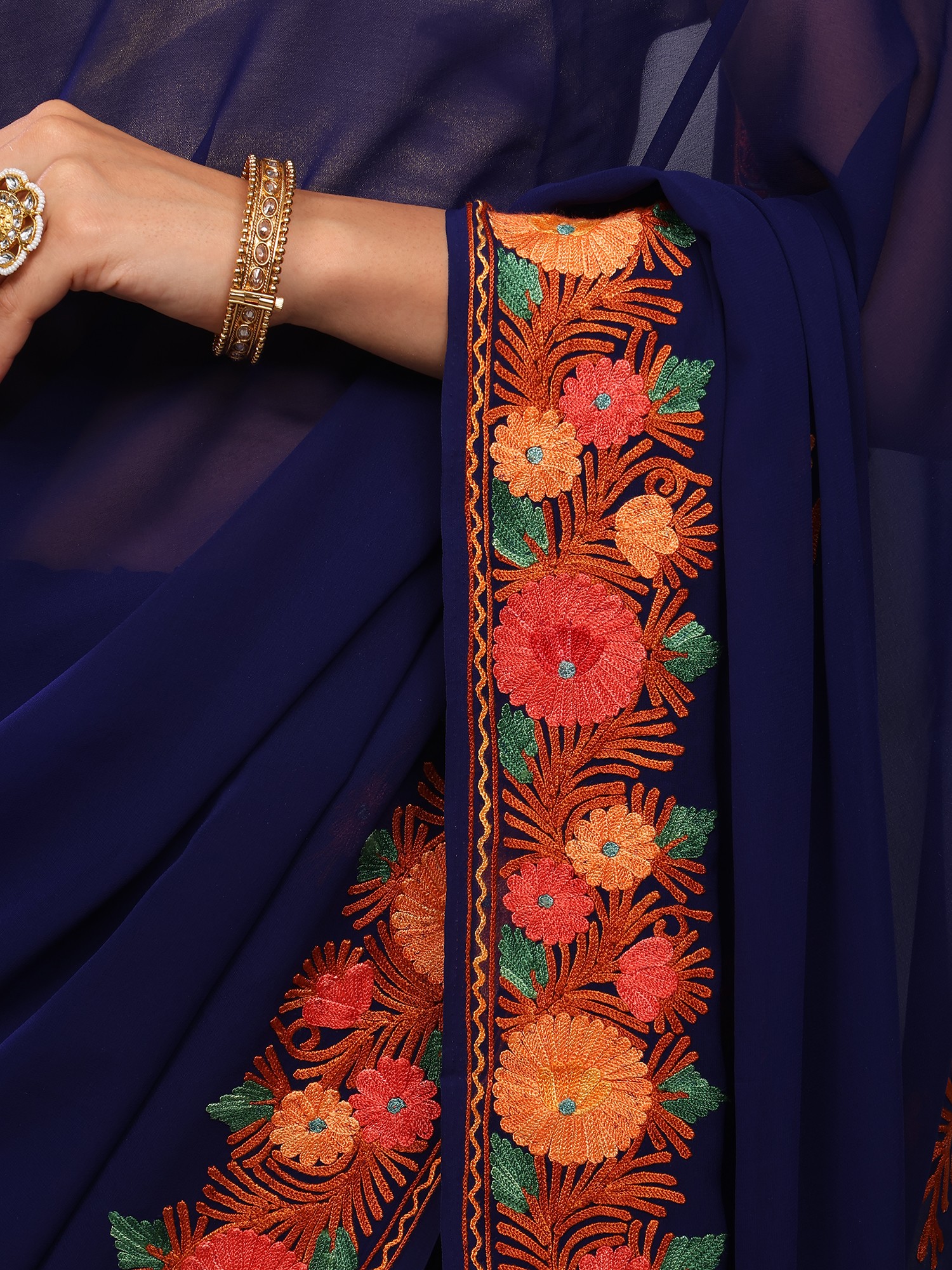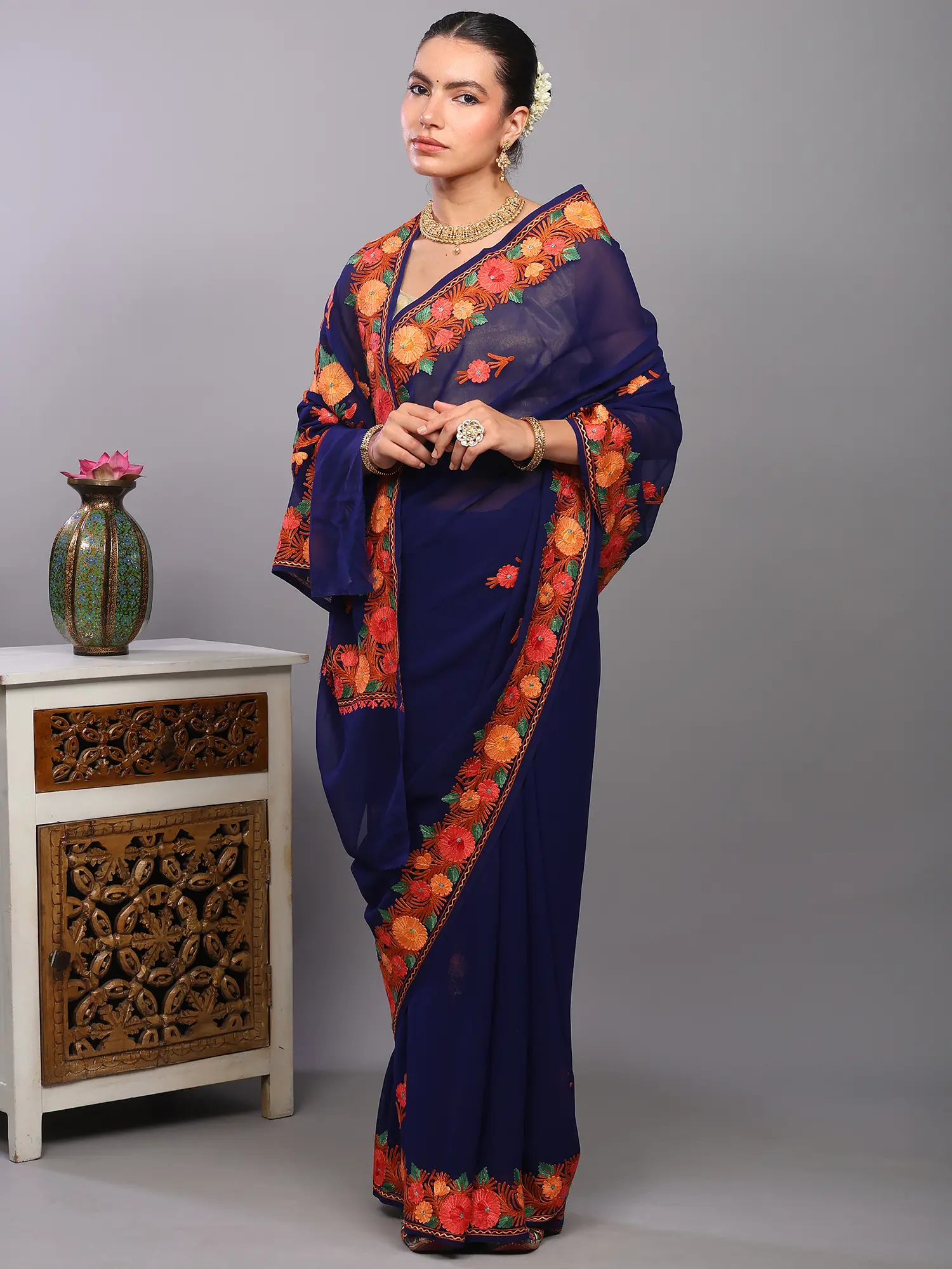 Blue-Curacao Georgette Saree from Kashmir Aari Embroidered Maple Leaves