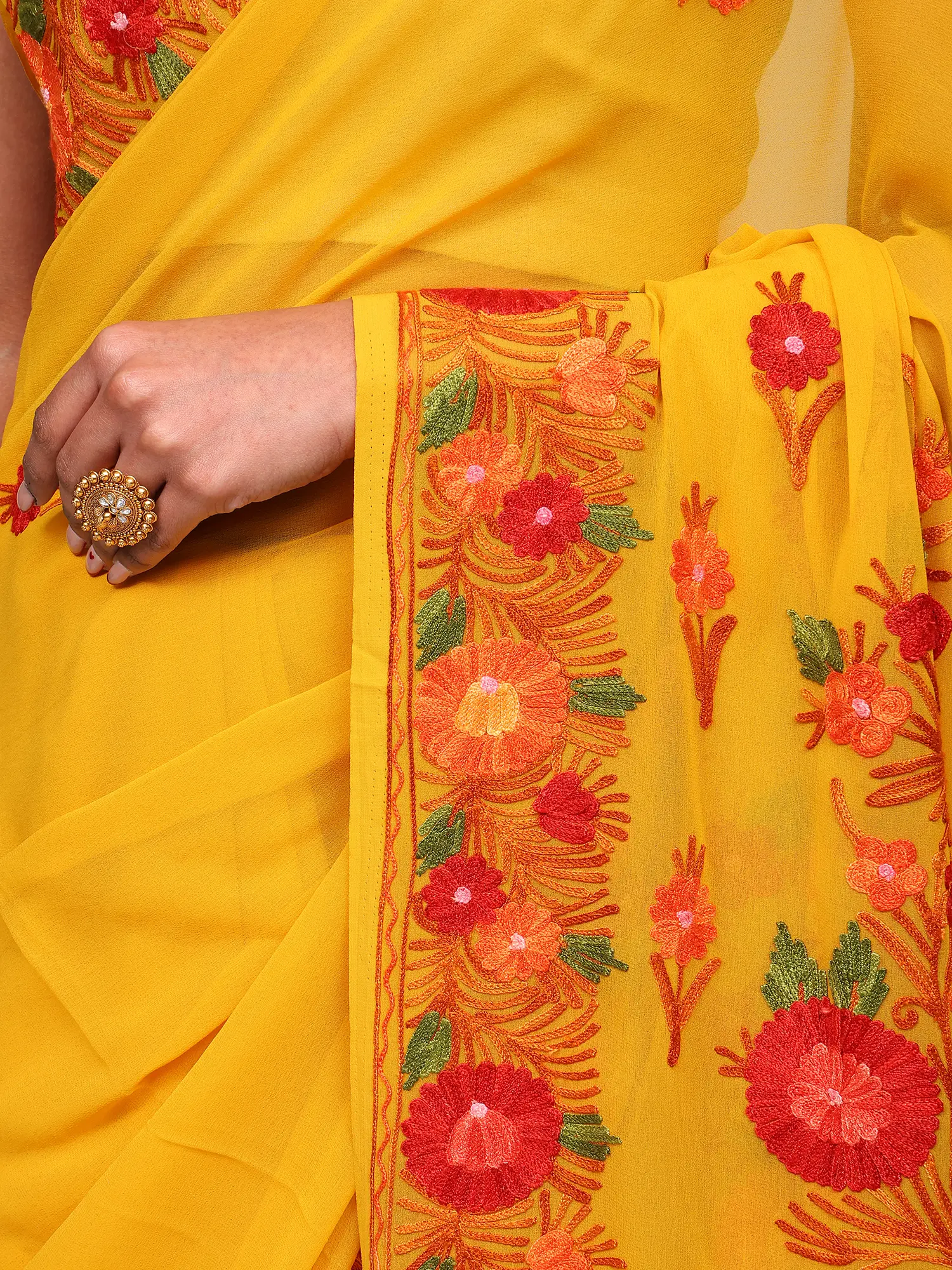 Macaw-Green Floral Aari Embroidered Georgette Saree from Kashmir