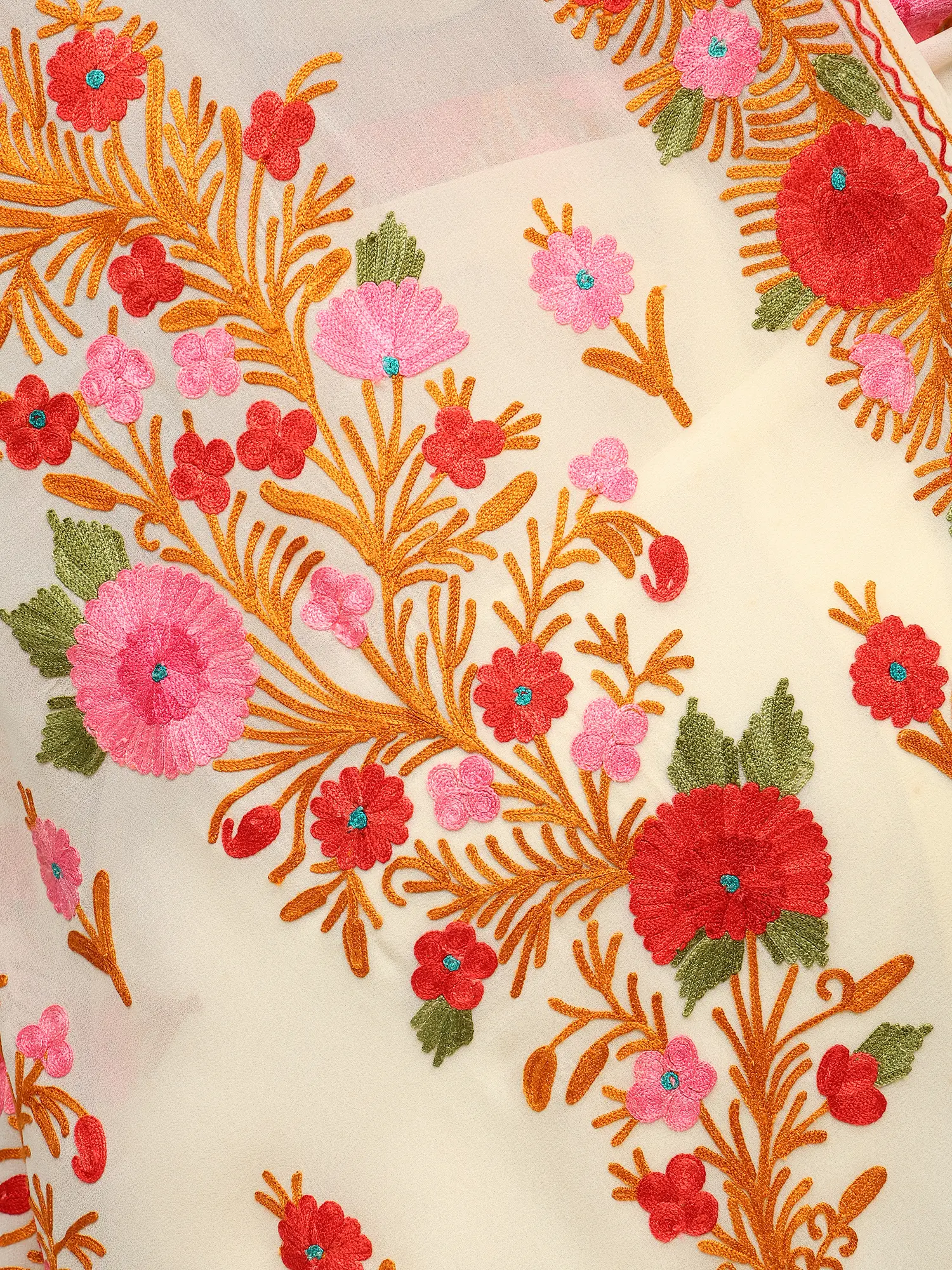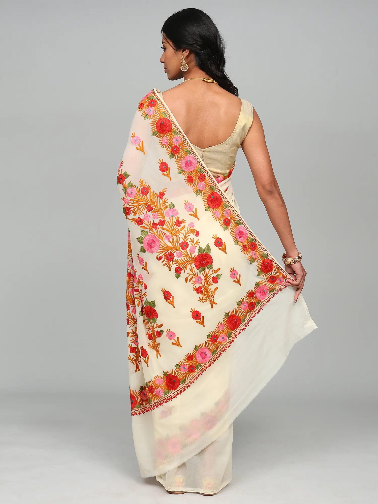Apricot-Gelato Floral Aari Embroidered Georgette Saree from Kashmir