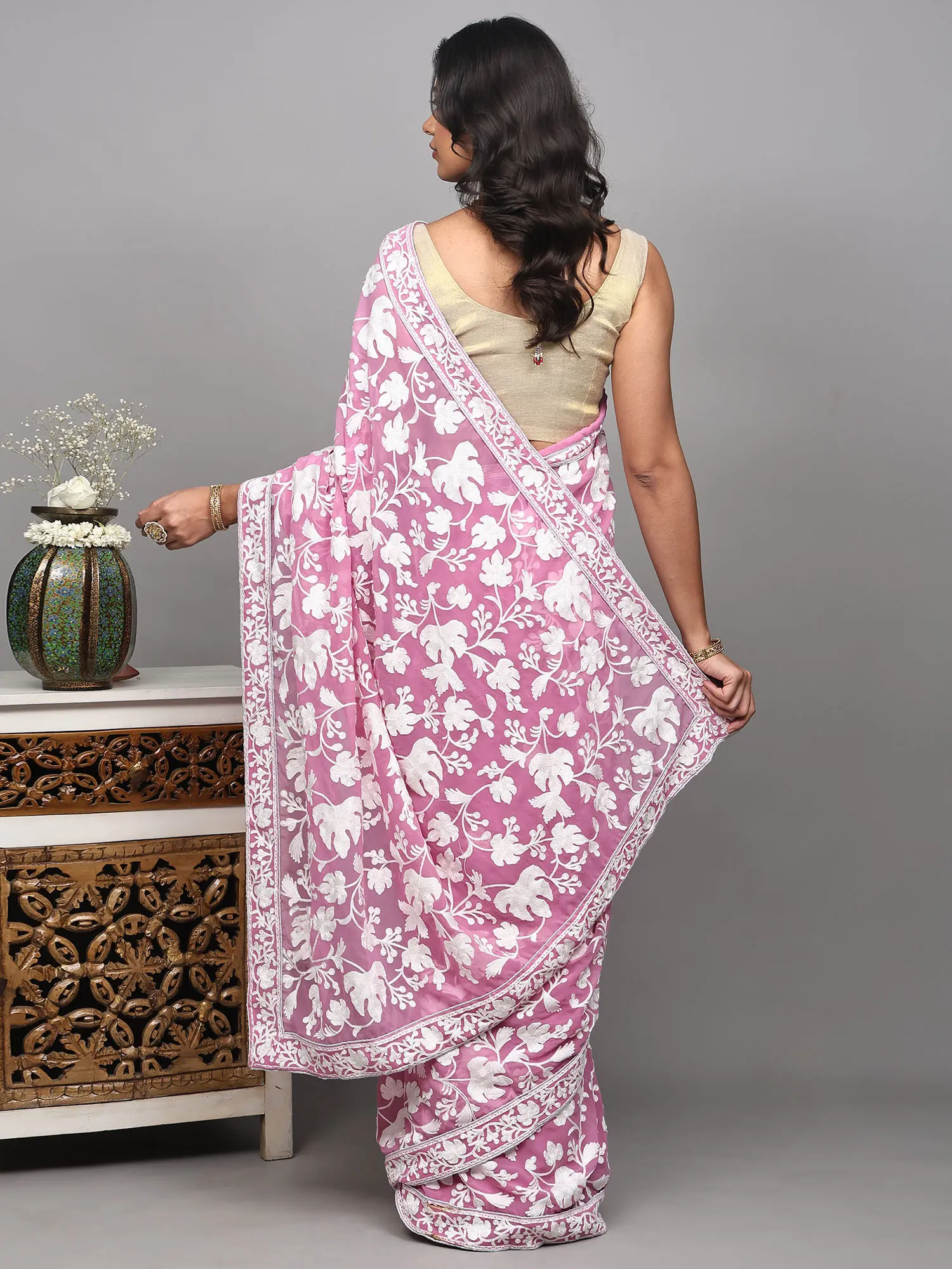Royal-Purple Georgette Saree with Parsi Embroidered Roses on Border