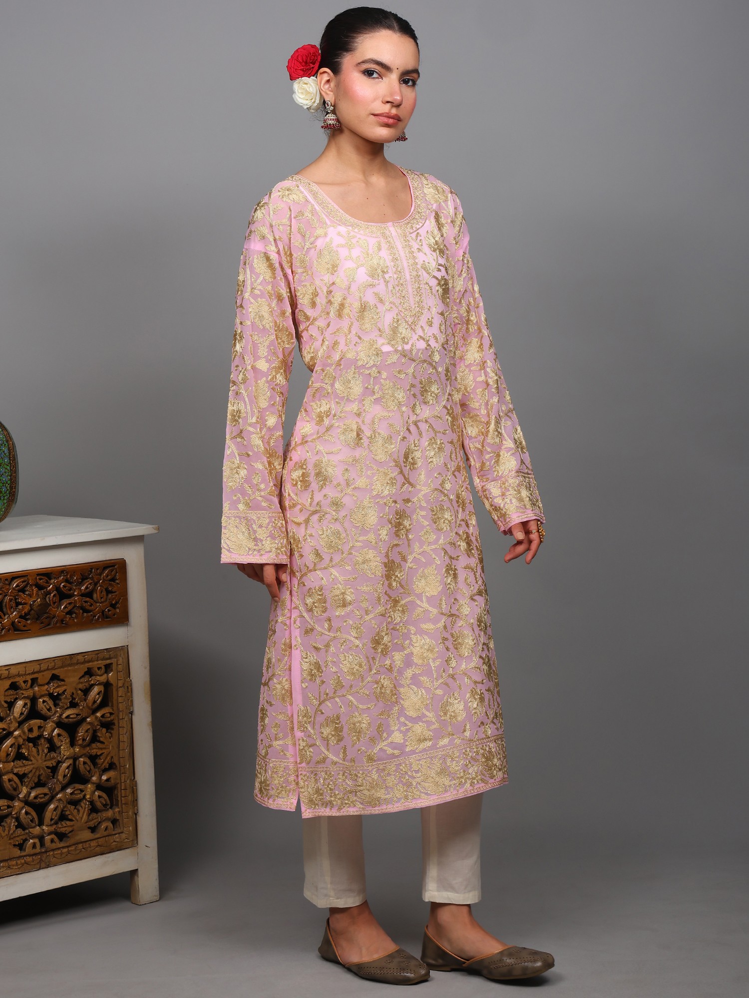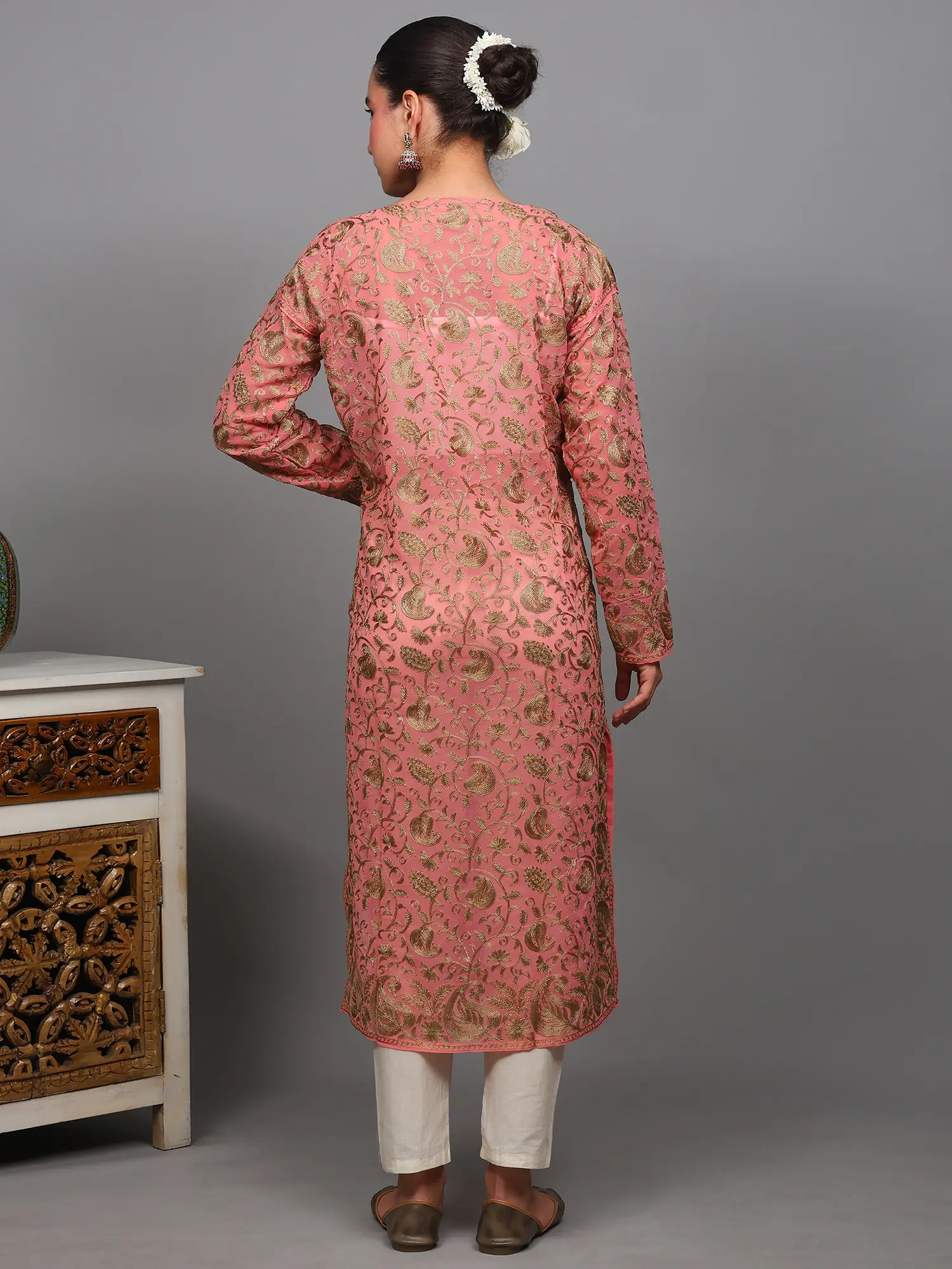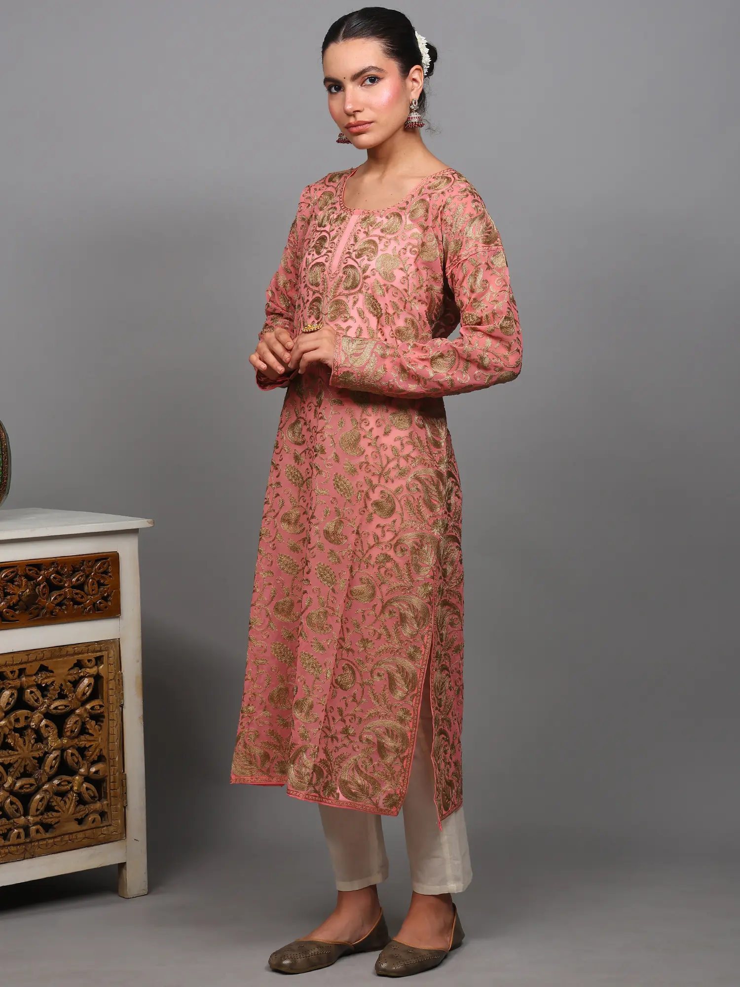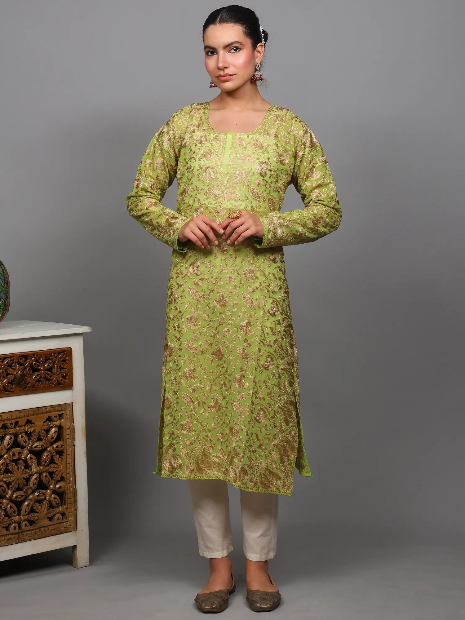 Pure Silk Kashmiri Kurti with Aari Hand Embroidery Flowers
