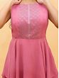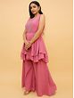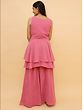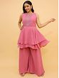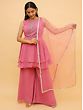 A soft and feminine appeal is infused in the fabric of this georgette Indo-western palazzo and kurta set. The gorgeous top with its layered hem and Swarovski work creates a stunning charm, paired with the gracefully tailored palazzo pants that fuse comfort with style. The look is completed with a net dupatta, which is embellished with a golden border to add a touch of traditional luxury.