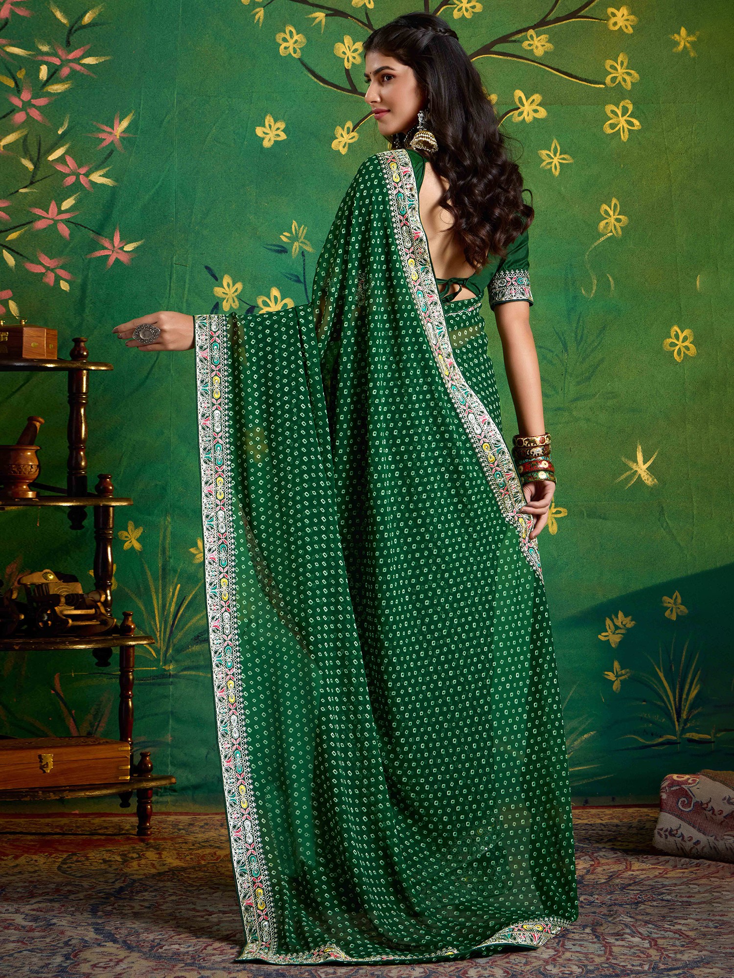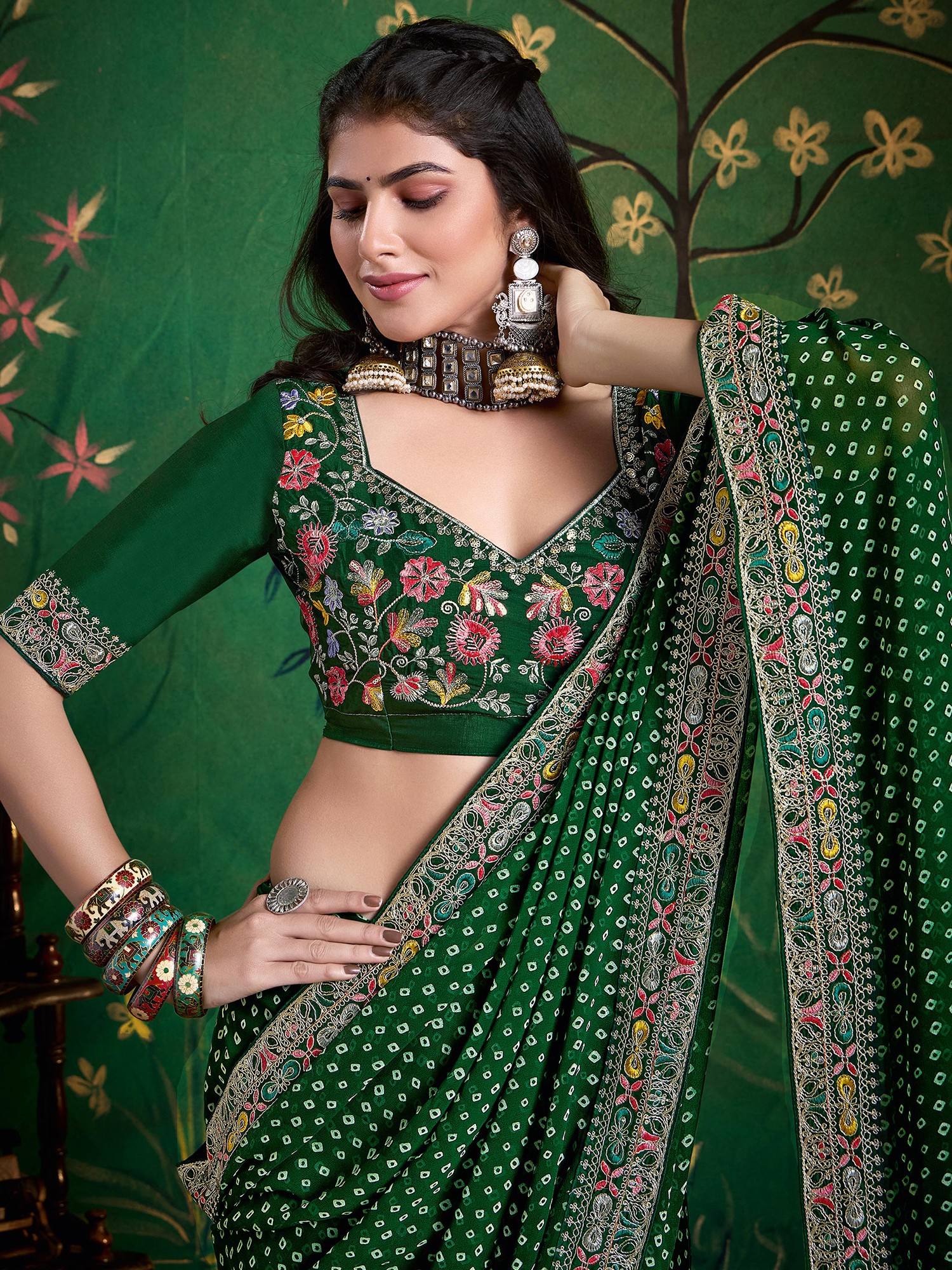 The rich, deep green hue provides a captivating canvas for the scattered, geometric Dabby patterns. These intricate prints are complemented by borders that boast a symphony of colourful, detailed embroidery, creating a striking visual contrast. The fabric’s natural sheen catches the light beautifully, enhancing the overall opulence, while its soft texture promises unparalleled comfort against your skin.