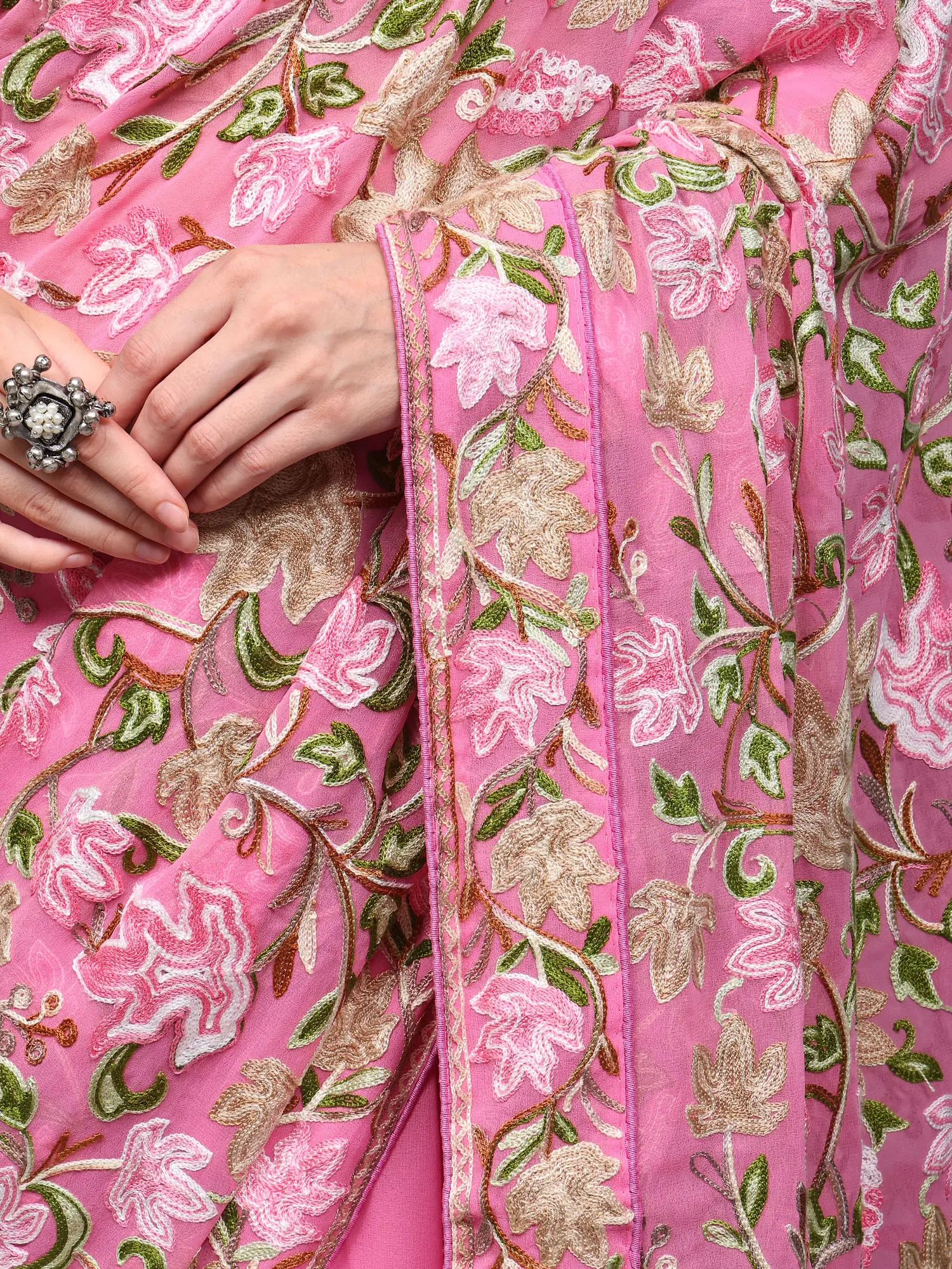 Discover the exquisite artistry of Kashmir woven into this stunning georgette saree. Crafted from the finest georgette fabric, known for its graceful drape and lightweight feel, this saree promises to enhance your natural beauty with every pleat. The vibrant pink hue serves as a perfect canvas for the intricate Aari embroidery that adorns its length, creating a masterpiece that is both timeless and captivating.