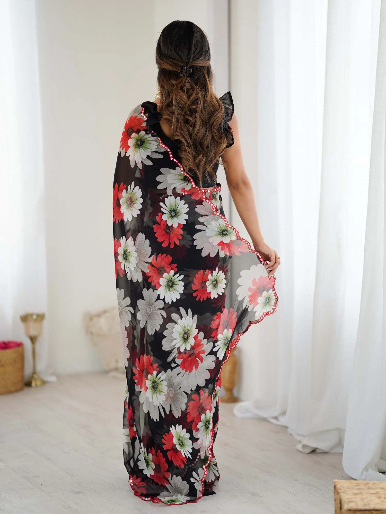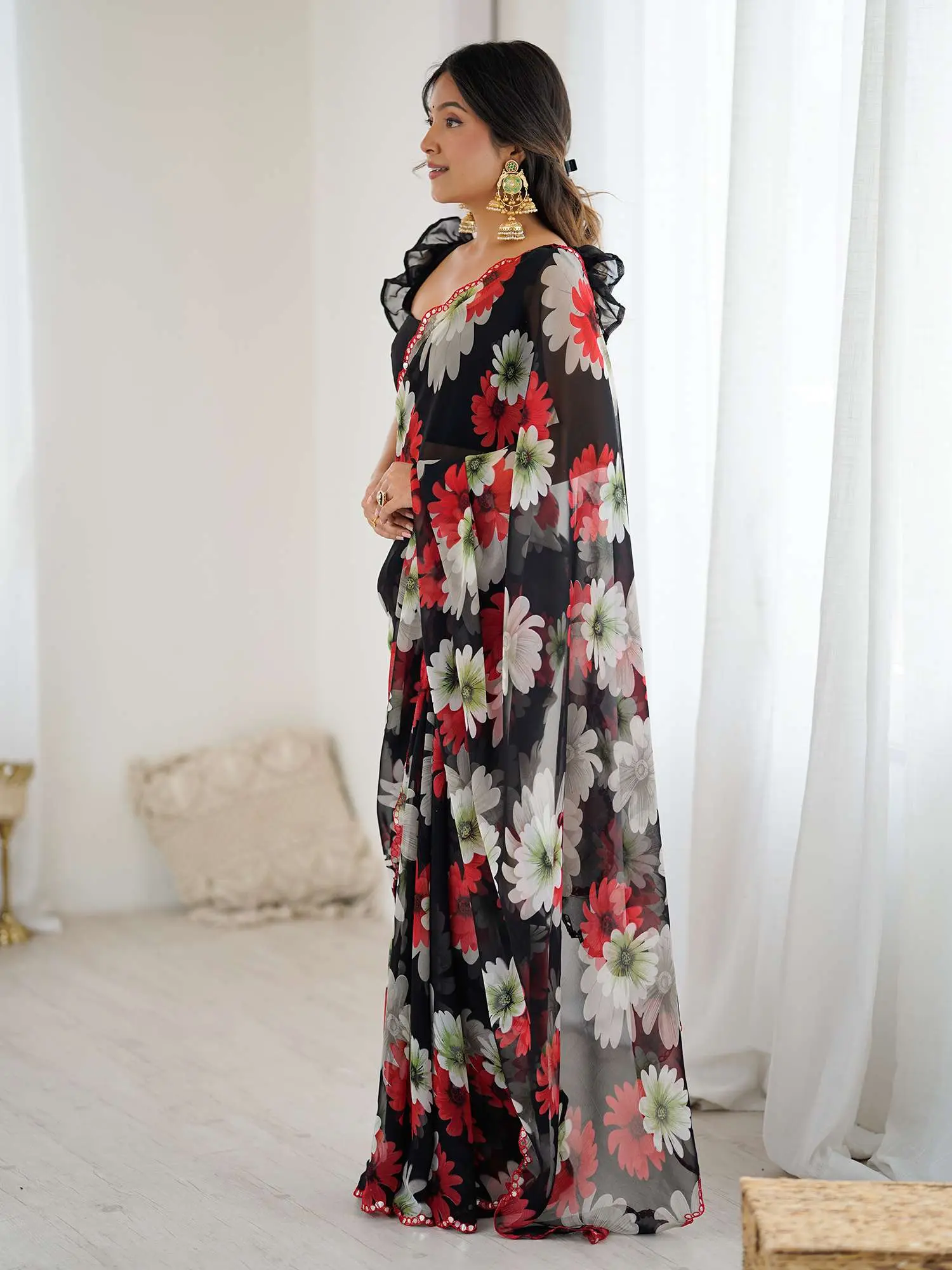 Features a vibrant, all-over floral print on a lightweight georgette fabric.